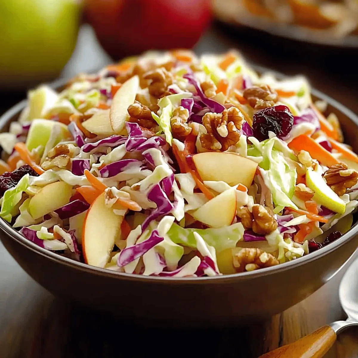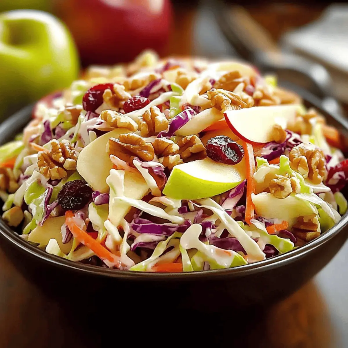 In a large mixing bowl, add about 4 cups of coleslaw mix, which includes shredded cabbage and carrots. Chop one to two fresh apples into bite-sized pieces, tossing them in a splash of lemon juice to prevent browning. Incorporate half a cup of dried cranberries and a quarter cup of chopped walnuts for added crunch, mixing gently to combine the ingredients evenly.
