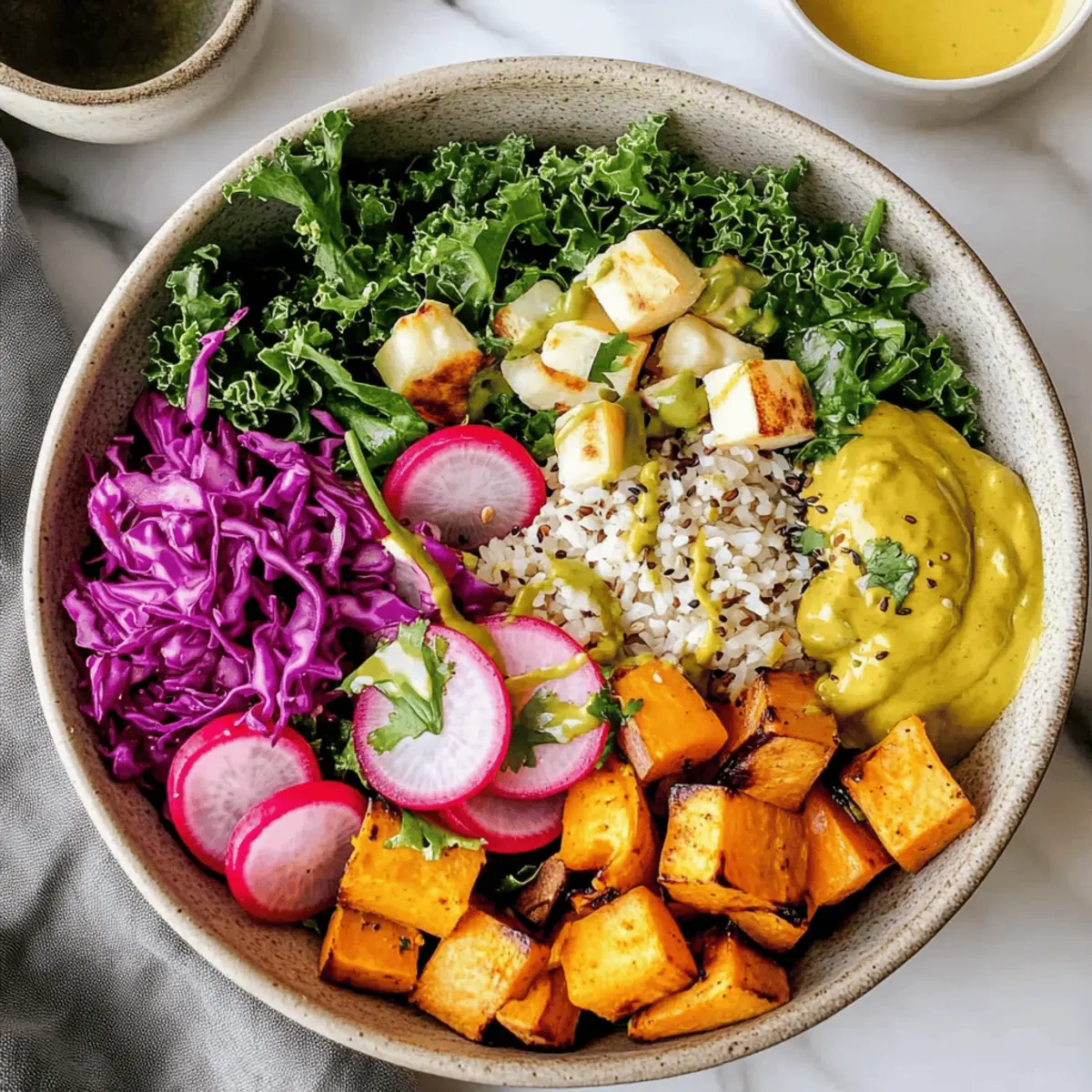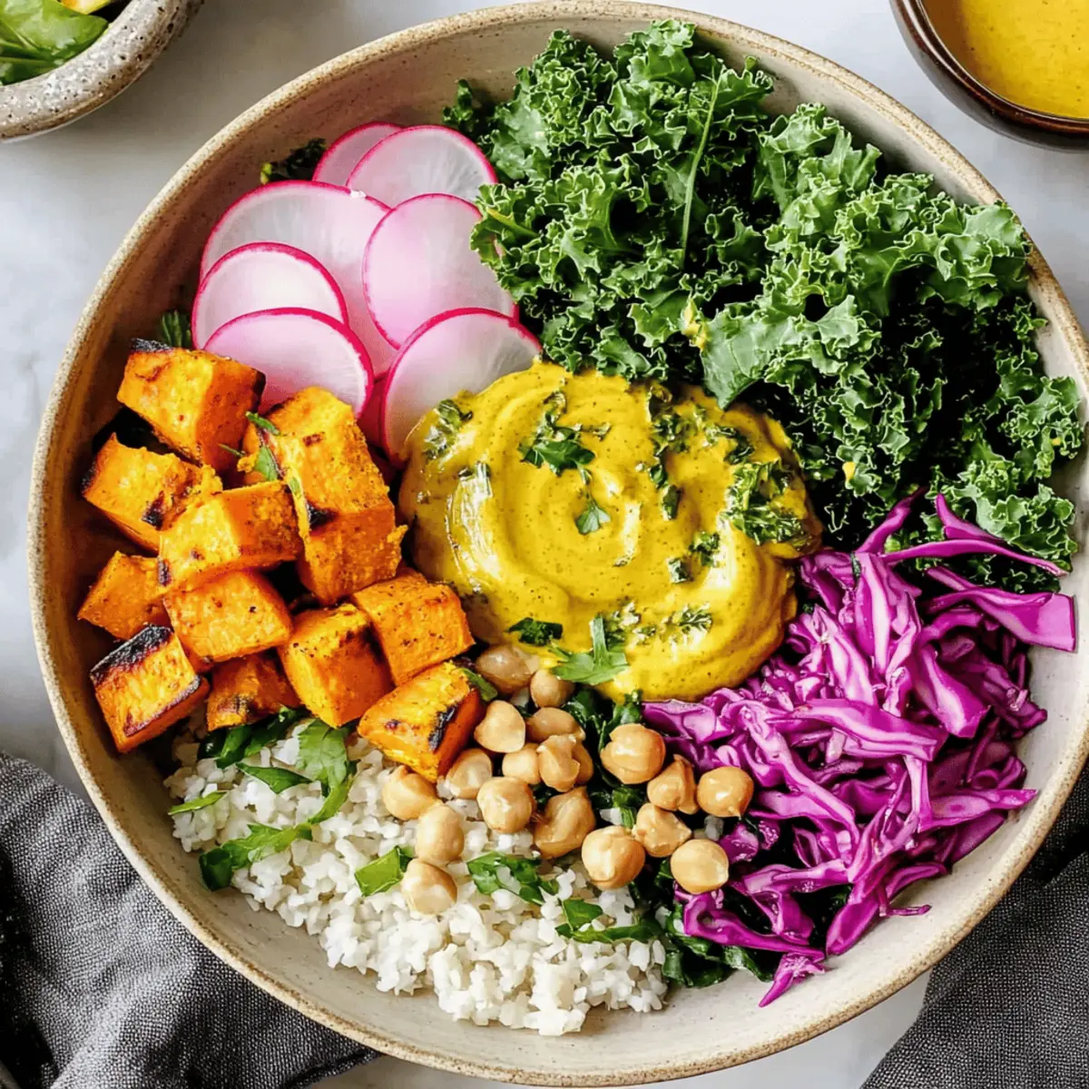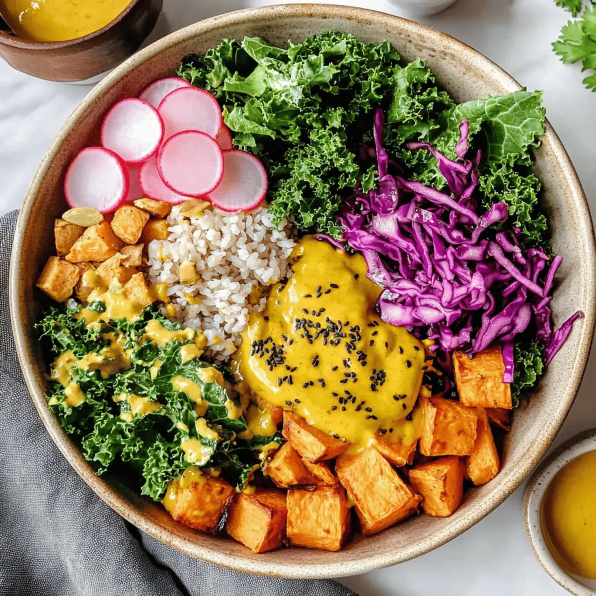 Jump to Recipe Print RecipeI was rummaging through my pantry, searching for a quick and wholesome meal, when the idea of a Vegan Buddha Bowl struck me. This nutrient-packed delight is not just a feast for the eyes; it offers a colorful medley of fresh veggies, hearty beans, and a scrumptious turmeric tahini sauce that brings it all together seamlessly. As someone who often finds joy in meal prepping, I can assure you that this Buddha Bowl is the best choice for busy weeknights and casual gatherings alike. With its gluten-free base and vibrant flavors, it’s sure to please everyone at the table. Whether you’re a seasoned home chef or just looking to shake up your weekly meals, this bowl will inspire creativity and ensure you enjoy a nutritious bite. Are you ready to dive into this delicious adventure? Why is this Buddha Bowl the best? Satisfying and Nutritious: Each bite is packed with vibrant veggies and protein-rich ingredients, making it a complete meal that’s not only filling but also health-conscious. Endless Customization: This recipe offers multiple variations based on your preferences or seasonal ingredients. Swap chickpeas for lentils or add your favorite nuts for a unique twist! Easy Meal Prep: Perfect for busy lifestyles, the components of this bowl store well, making it an ideal solution for meal prep. Prepare everything in advance for a quick grab-and-go lunch. Flavor Explosion: The combination of roasted sweet potatoes and tangy turmeric tahini sauce creates a delightful taste experience that will please even the pickiest eaters. Visually Appealing: The colorful presentation of this bowl is sure to impress at any gathering, making it a fantastic choice for both family meals and casual get-togethers. Explore other Egg Roll Bowl or Potato Breakfast Bowl ideas to complement your cooking repertoire! Best Buddha Bowl Ingredients For the Base • Brown Rice or Quinoa – Provides a nutritious, gluten-free base to hold everything together. • Chickpeas or Lentils – Adds plant-based protein; substitute with edamame for a different flavor profile. For the Vegetables • Sweet Potato – Offers natural sweetness and creaminess; butternut squash makes a suitable substitute. • Shredded Red Cabbage – Provides crunch and vibrant color; you can use green cabbage instead. • Carrots – Adds crunch and sweetness; baby carrots can be used for convenience. • Watermelon Radish or Red Radishes – Imparts a peppery crunch; cucumbers work well if you don’t have radishes. • Kale – Gives a nutrient boost and a chewy texture; swap for spinach if desired. For the Toppings • Sauerkraut – Adds tang and probiotics beneficial for gut health; consider pickled vegetables as a substitute. • Microgreens – An optional garnish for added freshness; fresh herbs can also elevate the flavor. • Sesame Seeds or Hemp Seeds – Provides crunch and nutritional value; any seeds or nuts can work here. For the Dressing • Turmeric Tahini Sauce – Creamy and flavorful; any tahini dressing can be an alternative, though this one shines! Enjoy experimenting with variations to discover your ultimate best Buddha Bowl! Step‑by‑Step Instructions for Best Buddha Bowl Step 1: Preheat and Prepare Begin by preheating your oven to 400°F (200°C). While the oven heats, line a large baking sheet with parchment paper for easy cleanup. This Best Buddha Bowl features roasted sweet potatoes as a key element, so you’ll want to prep them next. Step 2: Roast Sweet Potatoes Cube your sweet potatoes and toss them in a mixing bowl with extra-virgin olive oil, salt, and pepper. Spread the coated cubes evenly on the prepared baking sheet. Roast in the oven for about 20 minutes, flipping halfway through until they are golden and tender, giving your bowl a delicious sweetness. Step 3: Prepare Fresh Veggies While the sweet potatoes are roasting, thinly slice your watermelon radish and peel the carrots into ribbons. Toss these veggies with freshly squeezed lemon juice and set aside. Their bright colors and crisp textures will contribute to the vibrant appeal of your Best Buddha Bowl. Step 4: Massage the Kale In a large bowl, add your chopped kale along with a squeeze of lemon juice and a sprinkle of salt. Massage the kale gently for about 2–3 minutes, until it wilts and reduces in volume. This step is crucial as it tenderizes the kale, making it more enjoyable in your Buddha Bowl. Step 5: Assemble the Bowl Once the sweet potatoes are done roasting, it’s time to assemble your Best Buddha Bowl! Start with a layer of brown rice or quinoa as the base, followed by chickpeas or lentils. Add the kale, roasted sweet potatoes, radish slices, carrot ribbons, shredded cabbage, and a generous scoop of sauerkraut for tanginess. Step 6: Drizzle with Sauce For the pièce de résistance, drizzle your homemade turmeric tahini sauce over the assembled bowl. You can adjust the seasoning of the sauce with a pinch of salt and pepper, ensuring that each layer of the Best Buddha Bowl is well-flavored and satisfying. Step 7: Garnish and Serve Finally, sprinkle sesame seeds or hemp seeds over the top for added crunch and nutrition. Optional microgreens can be added for a fresh touch. Serve your Best Buddha Bowl warm or at room temperature, ready to be enjoyed solo or shared with friends! Best Buddha Bowl Variations Customize your bowl experience with these delightful twists and swaps that will inspire your creative cooking journey! Dairy-Free: Replace any dairy ingredients, like yogurt-based dressings, with coconut yogurt or almond-based alternatives for a creamy finish. Protein Boost: Swap chickpeas for tempeh or tofu. Simply marinate and sauté them to infuse extra flavor into your bowl. Spice it Up: For those who love a kick, add diced jalapeños or chili flakes to any sauce for a delightful heat. Grain-Free: For a low-carb option, replace grains with spiralized zucchini or cauliflower rice. These alternatives provide the same vo