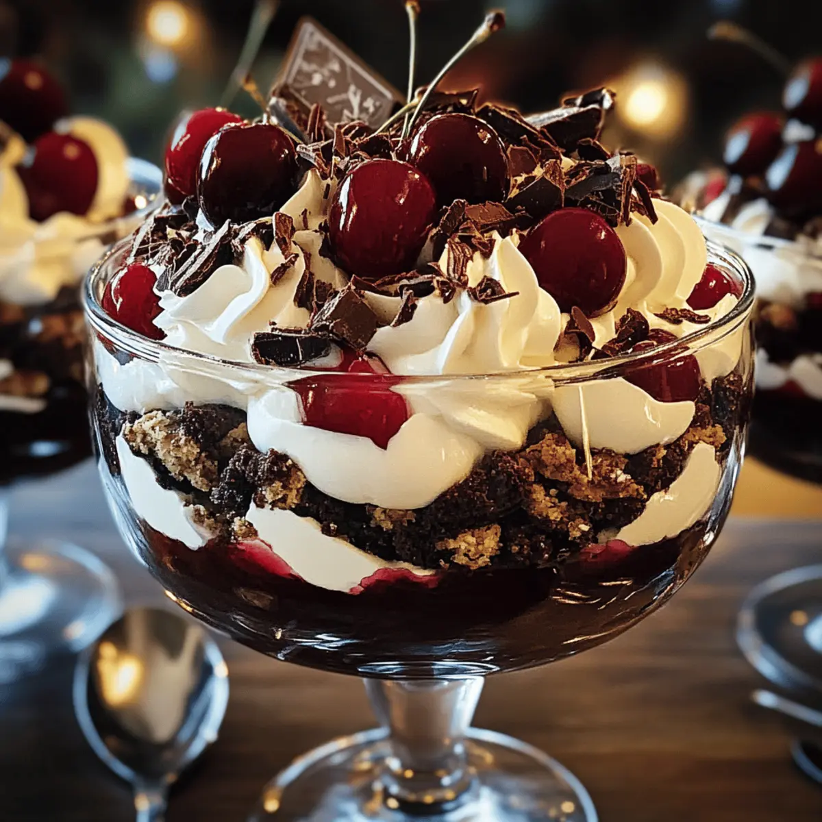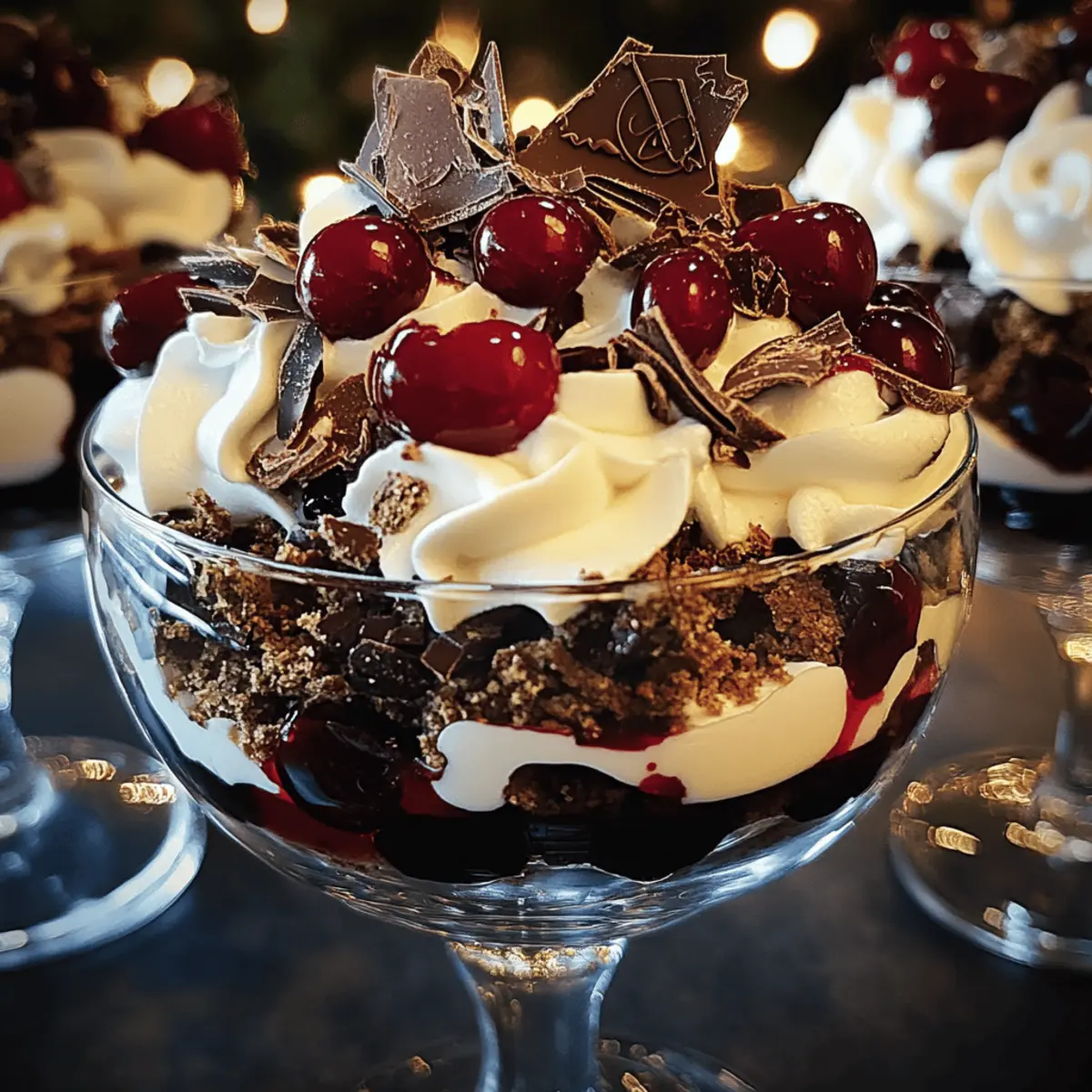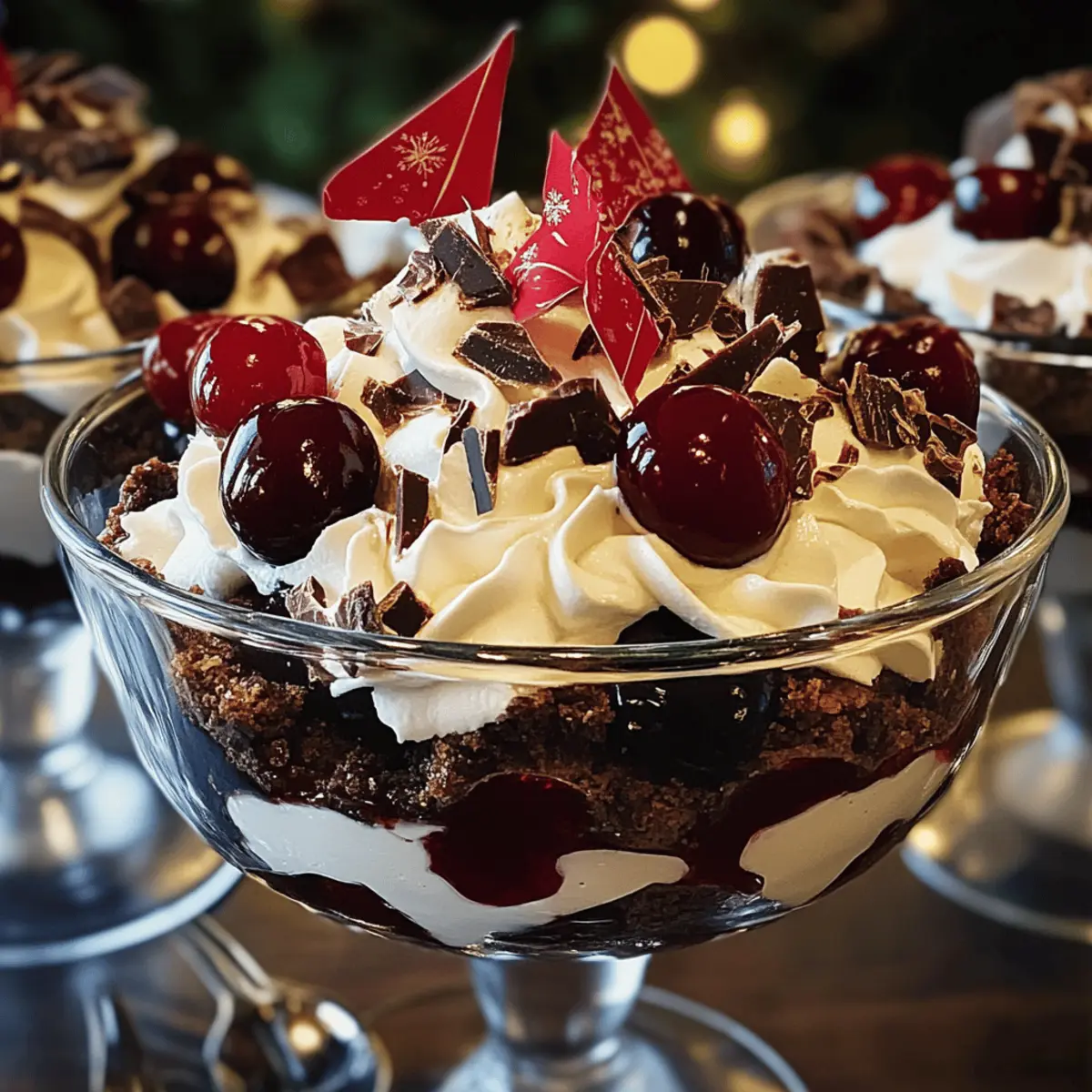 Jump to Recipe Print RecipeAs I stood in my kitchen enveloped by the warm scent of chocolate, a wave of nostalgia hit me. This festive season, nothing elicits holiday cheer quite like a serving of Black Forest Trifle for Christmas. Imagine rich chocolate cake layered with cushy whipped cream and vibrant cherries, beckoning from its glass dish. What I adore about this stunning dessert is not just its impressive presentation but its effortless preparation—perfect for those of us who want to impress without the stress. Plus, it’s a fantastic make-ahead option, giving the flavors time to blend into pure bliss. Are you ready to awaken your inner pastry chef and create something truly memorable this holiday? Let’s dive into this delightful treat! Why is Black Forest Trifle Irresistible? Effortless Elegance: With simple layers of chocolate cake, cream, and cherries, this trifle is a showstopper that requires no advanced skills. Perfect for Gatherings: Being a crowd-pleaser, it’s ideal for festive occasions, ensuring everyone leaves with a smile. Customizable Delight: Feel free to switch up the fruits or add a splash of liqueur to make it your own, embracing variations like the mouthwatering Cinnamon Apple Bread. Make-Ahead Convenience: Prepare it up to a day in advance! Just chill it in the refrigerator so that all the flavors meld beautifully. Visual Feast: Its beautiful layers create an eye-catching centerpiece for your holiday table, truly embracing the spirit of Christmas cheer. Get ready to impress with your homemade masterpiece! Black Forest Trifle Ingredients For the Cake • Chocolate Cake – A rich, moist base; store-bought saves time, but homemade adds a personal touch. For the Filling • Whipped Cream – Light and airy; heavy cream yields the best texture for dreamy layers. • Cherries – Sweet and vibrant; fresh cherries are preferable, but adjust flavors if using canned or frozen. • Kirsch (Cherry Liqueur) – Enhances the cherry flavor; optional for non-alcoholic versions. For the Topping • Chocolate Shavings – A delicious garnish; dark chocolate provides extra depth and richness. This festive layer of flavors and textures brings together a multisensory delight, making your Black Forest Trifle for Christmas a centerpiece worthy of any holiday gathering! Step‑by‑Step Instructions for Black Forest Trifle for Christmas Step 1: Bake the Chocolate Cake Begin by preparing your chocolate cake according to the recipe or package instructions. Preheat your oven to 350°F (175°C) and grease a round baking pan. Pour the batter into the pan and bake for 25 to 30 minutes, or until a toothpick inserted into the center comes out clean. Once done, remove the cake from the oven, let it cool in the pan for 10 minutes, then transfer it to a wire rack to cool completely. Step 2: Whip the Cream In a large mixing bowl, pour in the heavy cream and begin whipping it with an electric mixer on medium speed. Continue whipping until soft peaks form—this should take about 3 to 5 minutes. Be attentive to avoid over-whipping, as you want a light and airy texture. Once ready, gently fold in a tablespoon of sugar and a splash of vanilla extract for added sweetness, ensuring a creamy delight for your Black Forest Trifle. Step 3: Prepare the Cherries If using fresh cherries, wash and pit them before slicing them in half. For a richer flavor, you may opt to soak them in a splash of Kirsch (cherry liqueur) for about 10 minutes. If you’re using canned cherries, drain them thoroughly and pat them dry to avoid excess moisture in your trifle layers. Set aside your cherries, as they’ll bring vibrant color and sweetness to the trifle. Step 4: Assemble the Trifle Layers Start layering your Black Forest Trifle in a clear trifle dish or a large glass bowl for stunning visual appeal. Begin with a generous layer of the cooled chocolate cake, breaking it into chunks as needed. Next, spoon a layer of the whipped cream over the cake, followed by a layer of the prepared cherries. Repeat this layering process until all ingredients are used, ensuring you finish with a luscious layer of whipped cream on top. Step 5: Garnish and Chill For the final touch, sprinkle chocolate shavings generously over the top layer of whipped cream, and if desired, add a few whole cherries for decoration. Cover the trifle with plastic wrap and place it in the refrigerator to chill for at least 2 hours, allowing the flavors of your Christmas trifle to meld beautifully, creating an irresistible dessert that everyone will adore. Step 6: Serve with Joy When ready to serve your Black Forest Trifle for Christmas, carefully remove it from the refrigerator. Use a large serving spoon to scoop out perfect portions, showcasing those lovely layers of chocolate, cream, and cherries. Place them on festive dessert plates and watch as delighted smiles spread across your guests’ faces—your trifle is sure to be the highlight of the holiday gathering! Black Forest Trifle for Christmas Variations Feel free to get creative with your Black Forest Trifle and make it your own with these delightful twists! Berry Bliss: Swap out cherries for fresh raspberries or strawberries to bring a lighter, fruity flair to your dessert. The tartness of berries pairs beautifully with chocolate. Pastry Cream Layer: Add a luscious layer of pastry cream between the chocolate cake and whipped cream. This twist enriches the texture and flavor, bringing a sumptuous creaminess. Bourbon-Cherry Boost: For a boozy twist, use bourbon-soaked cherries instead of the usual fruit. This adds a deeper flavor profile that will warm your heart on chilly nights. Nutty Chocolate Crunch: Add a layer of crushed nuts, such as hazelnuts or almonds, for an extra crunch. It elevates the texture and compliments the creamy and chocolatey layers. Vegan Version: Substitute dairy with coconut cream and use a vegan chocolate cake. This variation allows everyone to enjoy a taste of this luscious