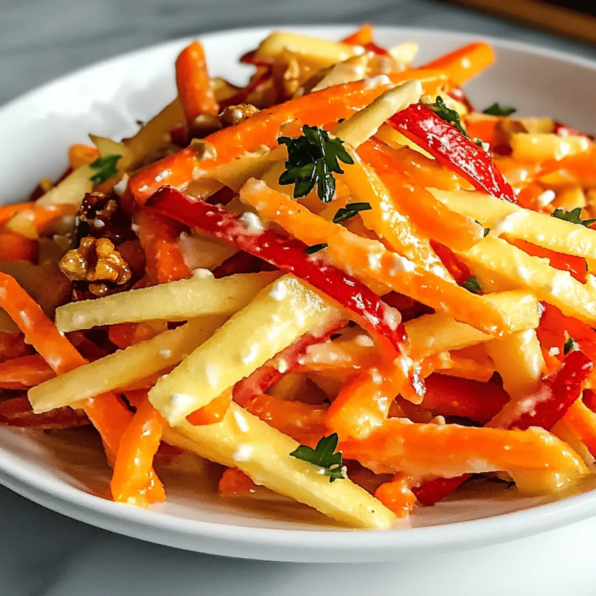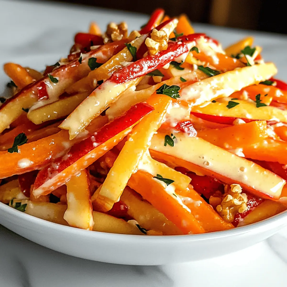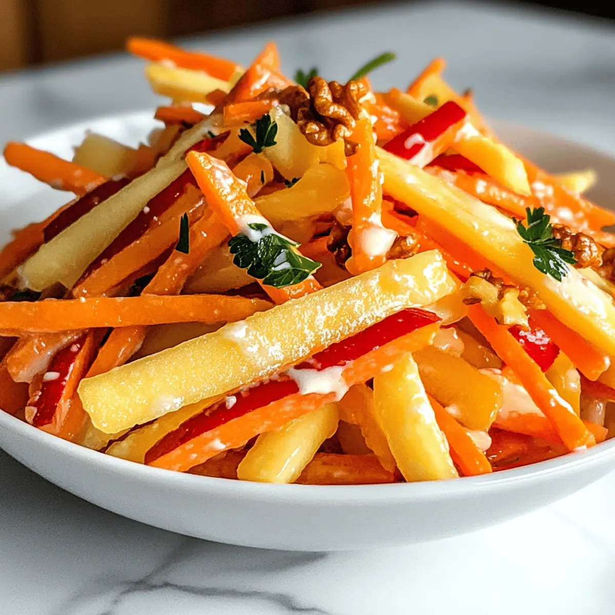Jump to Recipe Print RecipeThe crunch of fresh carrots and the sweetness of juicy apples combine in a delightful harmony that instantly brightens any meal. As I tossed together my version of the Carrot Apple Salad, I couldn’t help but smile, thinking how this dish embodies lightness and vibrancy—from picnics at the park to a simple homemade lunch. This refreshing salad is not just a feast for the eyes; it’s also healthy and incredibly versatile, making it a go-to recipe for busy folks who crave nourishing food without the fuss. Plus, with its customizable ingredients and a creamy yogurt dressing, you can easily cater to any palate—kids included! Are you ready to discover how to whip up this quick and tasty salad? Let’s dive in! Why is this salad a must-try? Vibrant, Fresh Ingredients: The combination of crunchy carrots and sweet apples creates an irresistible flavor profile that’s as delightful to the palate as it is to the eye. Customizable Options: Use your favorite nut or add raisins for a touch of sweetness—this salad can cater to everyone’s tastes! Quick to Prepare: With simple prep steps, you’ll have a delicious salad ready in no time, making it perfect for busy days. Health Benefits: Rich in fiber and low in calories, this salad is an excellent choice for those looking to eat healthily without compromising on taste. Crowd-Pleasing Appeal: From backyard BBQs to light lunches, it’s a dish that appeals to both kids and adults, just like a Cinnamon Apple Bread makes for a lovely dessert! Prepare yourself for a refreshing, vibrant experience every time you serve this Carrot Apple Salad! Carrot Apple Salad Ingredients • Discover the key components for your delicious Carrot Apple Salad! For the Salad Base Carrots – Provide earthiness and crunch; consider using baby carrots for convenience. Apples – Add natural sweetness and fiber; Honeycrisp offers a sweeter option, while Granny Smith adds tartness. For the Dressing Yogurt – Acts as a creamy dressing base, loaded with calcium and probiotics; swap for dairy-free yogurt for a vegan option. Lemon Juice – Brightens flavors with its acidity; freshly squeezed lemon gives the best taste. Optional Add-ins Nuts (e.g., walnuts, sunflower seeds) – Enhance flavor and nutrition; feel free to choose your favorite! Raisins – Introduce extra sweetness and chewy texture; they make the salad kid-approved! Step‑by‑Step Instructions for Carrot Apple Salad Step 1: Prep the Ingredients Begin by shredding or julienne cutting about three medium-sized carrots and two crisp apples. For a neat finish, try using a box grater or a food processor with the shredding attachment. After shredding the apples, pat them dry with a paper towel to prevent the salad from becoming watery. Step 2: Combine the Base In a large mixing bowl, combine the shredded carrots and apples, stirring gently to incorporate. The bright orange and green colors should create an inviting mix. This base sets the foundation for your Carrot Apple Salad, ready to be enhanced with flavors from the creamy dressing. Step 3: Make the Dressing In a separate bowl, add about one cup of yogurt and a couple of tablespoons of freshly squeezed lemon juice. Whisk them together until the mixture is smooth and creamy. This zesty dressing will add a delicious creaminess to the salad while balancing the sweetness of the apples and the earthiness of the carrots. Step 4: Toss Together Pour the yogurt dressing over the carrot-apple mixture. Using salad tongs, gently toss everything together until the carrots and apples are evenly coated with the dressing. Be careful not to over-mix; you want to maintain the crisp texture of the fruits and veggies, giving your Carrot Apple Salad a refreshing bite. Step 5: Chill Before Serving Cover the bowl with plastic wrap or transfer the salad to an airtight container and refrigerate for at least one hour. This chilling step enhances the flavors and allows the dressing to meld beautifully with the salad ingredients. The vibrant colors should also intensify, making your Carrot Apple Salad visually appealing. Step 6: Serve and Enjoy After chilling, give the salad a quick toss to refresh it. Serve it cold as a vibrant side dish or a delightful standalone lunch option. Its crunchy texture and sweet flavor profile will surely please both kids and adults alike. Embrace the freshness of your Carrot Apple Salad and enjoy! Carrot Apple Salad Variations Feel free to let your creativity shine by customizing this salad to match your taste preferences! Dairy-Free: Swap yogurt for your favorite non-dairy alternative, like coconut or almond yogurt, for a vegan option. Nutty Twist: Add a handful of toasted walnuts or sunflower seeds for an extra crunch and a boost of healthy fats. Fruit-Filled: Mix in some dried cranberries or raisins for a touch of sweetness and chewy texture that kids will love. Herbal Freshness: Sprinkle chopped fresh herbs like mint or basil to brighten the flavor and add a fragrant twist. Spicy Kick: For a bit of heat, sprinkle cayenne or chili powder into the dressing for a zingy surprise! Citrusy Burst: Experiment by adding orange juice or zest along with the lemon for a sweeter, tangy flavor. Crunch Variation: Substitute cabbage or add shredded red cabbage for added color and an extra layer of crunch. Savory Addition: Spice things up by adding finely diced roasted bell peppers or green onions to bring a savory edge. As you explore these variations, think about pairing your Carrot Apple Salad with a delicious dish like a Bacon Pasta Salad for a delightful meal! Expert Tips for Carrot Apple Salad Fresh Ingredients Matter: Always use fresh, crisp carrots and apples to maximize flavor and texture. This ensures your Carrot Apple Salad is vibrant and satisfying. Adjust to Taste: Feel free to customize your dressing! Add herbs or spices to enhance flavors without compromising on health. Don’t Overmix: Gently tossing the salad is key to keeping