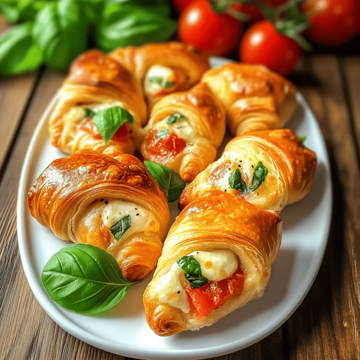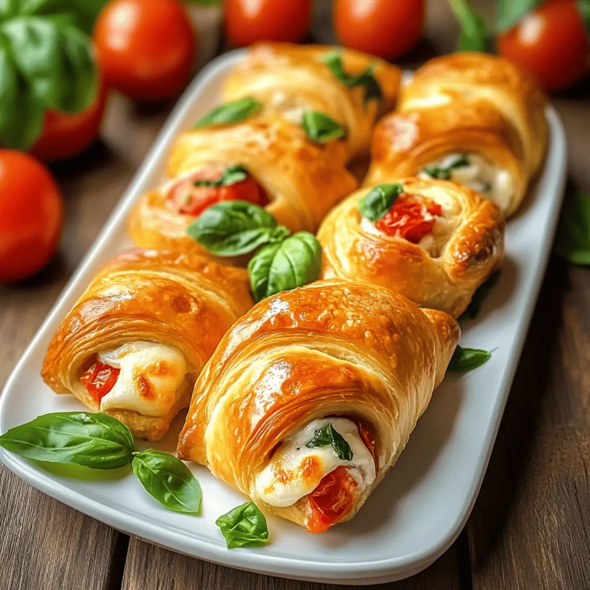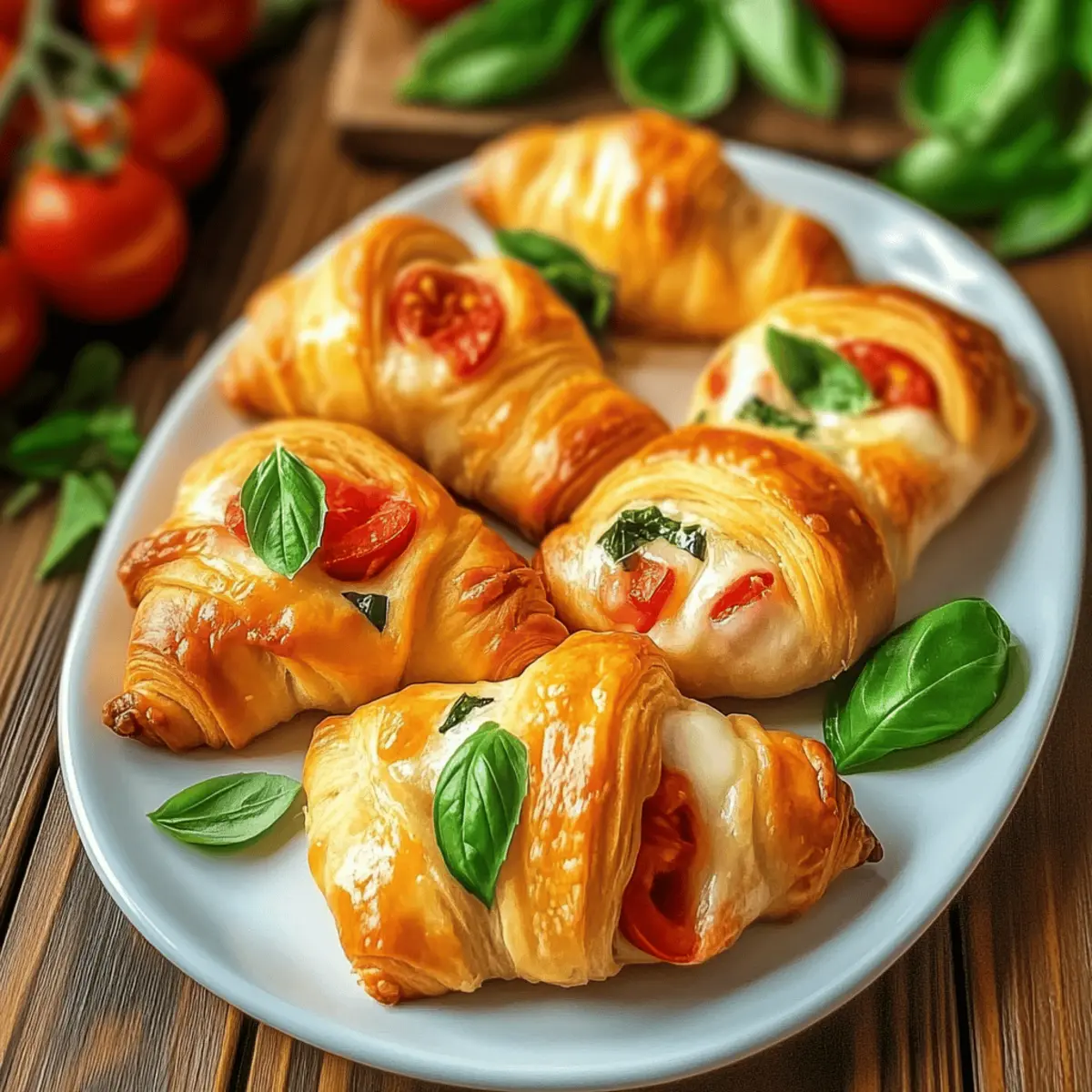 Once baked, remove your Cheesy Garlic Tomato Crescent Rolls from the oven and let them cool slightly. Garnish with extra basil for a pop of color and aroma. Serve them warm to enjoy the gooey cheese and fresh ingredients at their best, making your appetizer a delightful hit!
