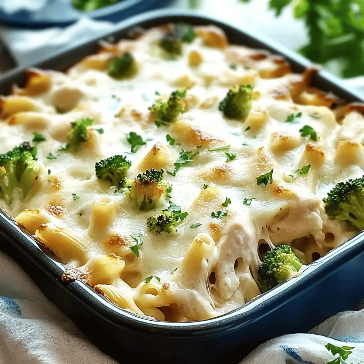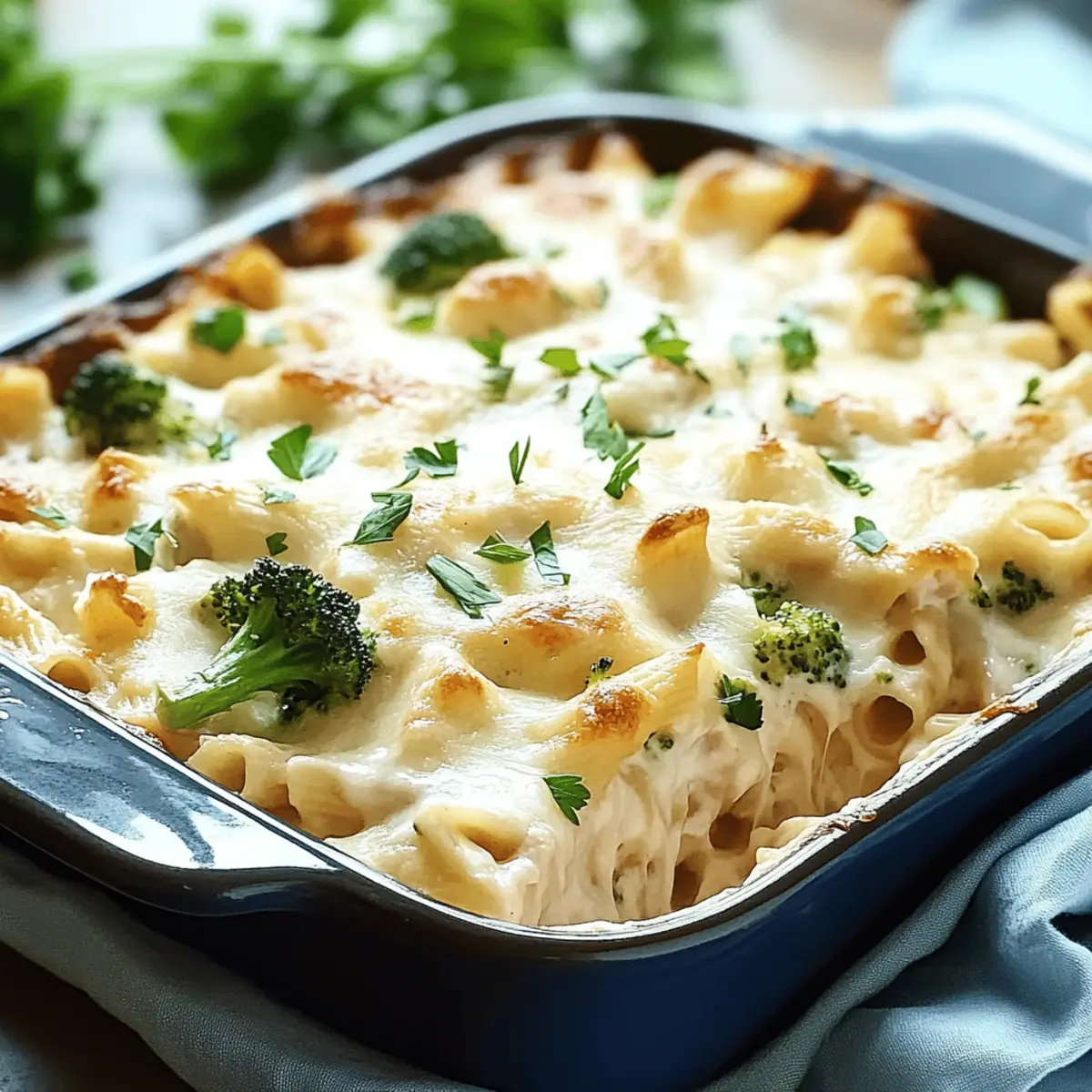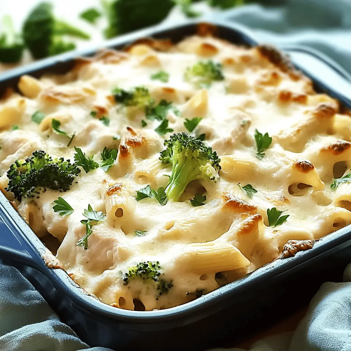Jump to Recipe Print RecipeThere I was, rummaging through the pantry when a lightbulb moment struck—how about a Chicken Broccoli Alfredo Bake? This comforting one-dish meal is not only a feast for the eyes but also a crowd-pleaser, ready in just under an hour. It combines tender chicken, vibrant broccoli, and fettuccine pasta all enveloped in a rich and creamy Alfredo sauce. Picture this: a warm dish layered with gooey cheese that brings your family together, making it the perfect antidote to the fast-food frenzy. Plus, the beauty of this recipe lies in its versatility; you can easily swap the chicken for shrimp or amp up your veggies for a delightful vegetarian twist. Ready to dive into this creamy goodness? Let’s get cooking! Why is Chicken Broccoli Alfredo Bake a Must-Try? Comforting and delicious, this Chicken Broccoli Alfredo Bake is a satisfying dish that hits all the right notes for family dinners. Quick prep time means you can enjoy this homemade meal in under an hour, making it perfect for busy weeknights. Versatile ingredients allow you to customize it with your favorite veggies or proteins, just like in our Grilled Chicken Broccoli recipe! One-pan cooking means less cleanup, leaving you more time to enjoy your delicious creation. Expect melt-in-your-mouth textures with every bite – a little crunch from the broccoli, a creamy sauce coating the pasta, and tender chicken to complete the dish! Chicken and Broccoli Alfredo Bake Ingredients • Let’s gather all we need for this creamy delight! For the Bake Cooked Chicken – Shredded or diced; adds protein and flavor. You can substitute with shrimp or tofu for variations. Fresh Broccoli Florets – 4 cups; provides crunch and color. Broccoli can be swapped with other veggies like bell peppers or spinach. Fettuccine Pasta – 8 ounces; this is the base for the dish, giving it structure. Substitute with gluten-free pasta if needed. Alfredo Sauce – 2 cups (store-bought or homemade); the creamy backbone of the dish that enhances flavor. Shredded Mozzarella Cheese – 1 cup; melts beautifully for a cheesy topping. Use any melting cheese if preferred. Grated Parmesan Cheese – 1/2 cup; adds nuttiness and depth. Omit if someone has dairy sensitivities. For Seasoning Garlic Powder – 1 teaspoon; enhances overall flavor. Fresh garlic can be used as a substitute for more zing. Onion Powder – 1 teaspoon; contributes additional depth of flavor. Skip if sensitive to onions. Black Pepper – 1/2 teaspoon; adds warmth and seasoning. Increase for a spicier version. Salt – 1/2 teaspoon; essential for flavor. Adjust to taste based on dietary needs. For Cooking Olive Oil – 1 tablespoon; helps prevent sticking when tossing pasta. Can use any neutral oil. Red Pepper Flakes (optional) – 1/2 teaspoon; perfect for a touch of heat. Leave out for a milder dish. For Garnish Fresh Parsley – optional, but recommended; brightens the final presentation for a gorgeous meal. This Chicken and Broccoli Alfredo Bake promises to be a heartwarming dish that feels like a hug on a plate! Step‑by‑Step Instructions for Chicken and Broccoli Alfredo Bake Step 1: Preheat the Oven Begin your Chicken and Broccoli Alfredo Bake by preheating your oven to 350°F (175°C). This ensures the baking environment is just right for melding flavors and achieving that golden cheese topping. While your oven warms up, gather your ingredients and tools, including a large pot, a colander, and a 9×13 inch baking dish. Step 2: Cook the Fettuccine In a large pot, bring salted water to a rolling boil, then add the fettuccine. Cook it according to package instructions until al dente, about 8 to 10 minutes, stirring occasionally to prevent sticking. Drain the pasta in a colander, reserving the pot for later. The perfectly cooked pasta is the base of your Chicken and Broccoli Alfredo Bake. Step 3: Blanch the Broccoli While the pasta cooks, bring a separate pot of water to a boil. Add the fresh broccoli florets and blanch them for 2 to 3 minutes until they turn bright green and tender-crisp. Drain the broccoli and set it aside, as it will add a vibrant touch to your Chicken and Broccoli Alfredo Bake and maintain a satisfying crunch. Step 4: Combine Pasta and Olive Oil Return the drained fettuccine to the original pot. Drizzle with olive oil and toss gently to coat, preventing the noodles from clumping together. This step is essential for achieving a creamy texture in your Chicken and Broccoli Alfredo Bake, ensuring every bite is as delicious as the last. Step 5: Prepare the Alfredo Sauce If you’re making homemade Alfredo, now’s the time! In a saucepan, melt butter over medium heat, then stir in heavy cream, allowing it to simmer gently. Gradually add grated Parmesan cheese, stirring continuously until melted and creamy. Season with garlic powder, onion powder, salt, and pepper to taste. This sauce will be the heart of your Chicken and Broccoli Alfredo Bake. Step 6: Combine Ingredients In a large mixing bowl, gently fold together the cooked chicken, blanched broccoli, fettuccine, and the creamy Alfredo sauce. Be careful not to break the broccoli florets as you mix. This harmonious combination creates the delicious essence of your Chicken and Broccoli Alfredo Bake, where each ingredient complements the others perfectly. Step 7: Transfer to Baking Dish Grease your 9×13 inch baking dish to prevent sticking, then pour the chicken, pasta, and broccoli mixture into it. Spread the contents evenly across the dish. Top generously with shredded mozzarella and grated Parmesan cheese, ensuring a delightful layer of cheesy goodness on your Chicken and Broccoli Alfredo Bake. Step 8: Bake and Melt Cover the dish with aluminum foil and place it in the preheated oven. Bake for 20 minutes to allow the flavors to meld. After this time, uncover the dish and continue baking for an additional 10 to 15 minutes, until the cheese is melted and bubbly with a lightly golden crust, signifying the pe