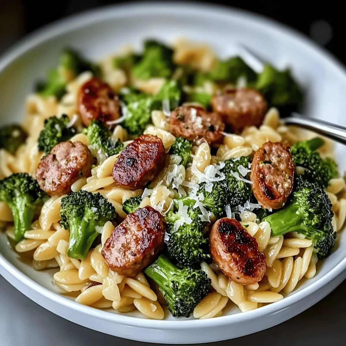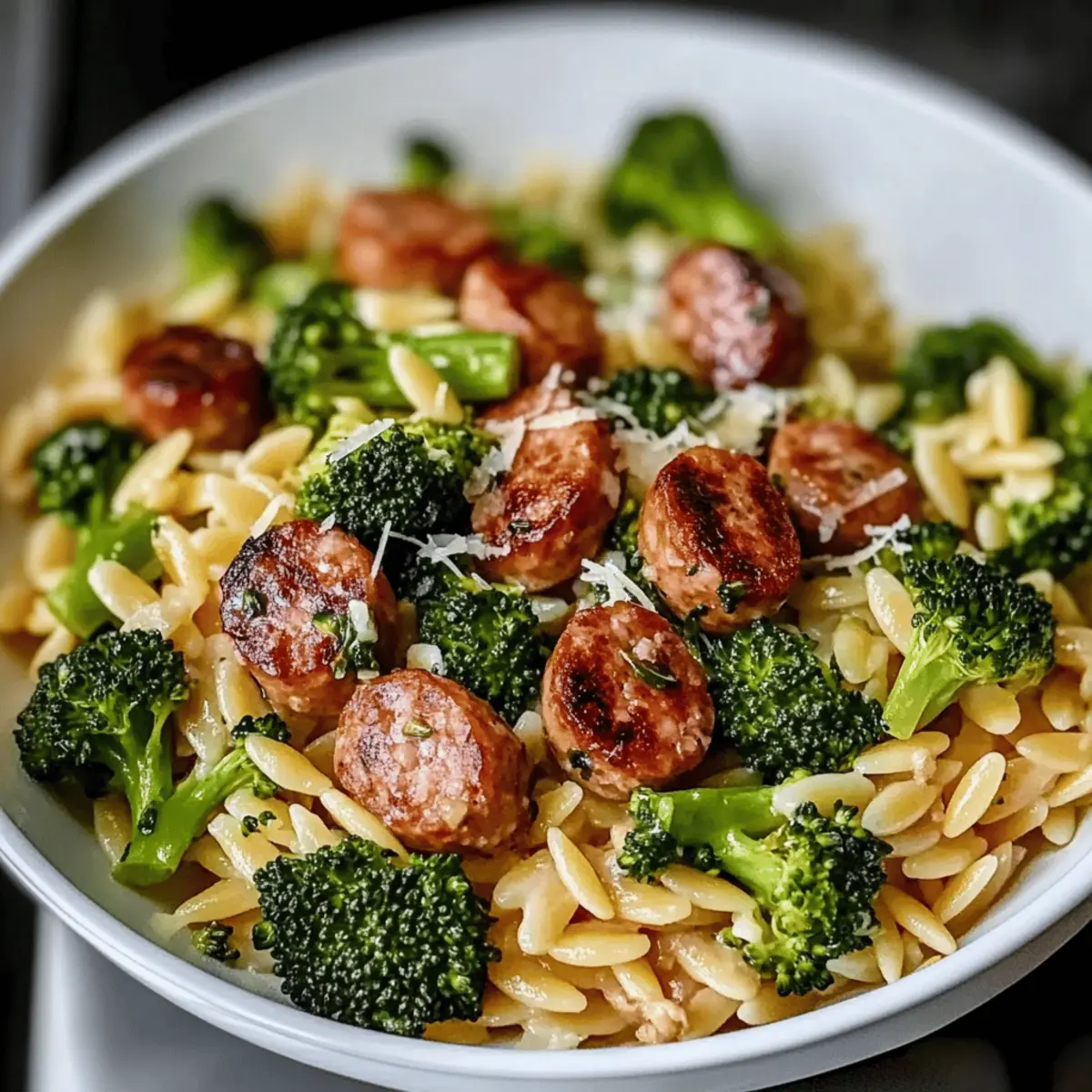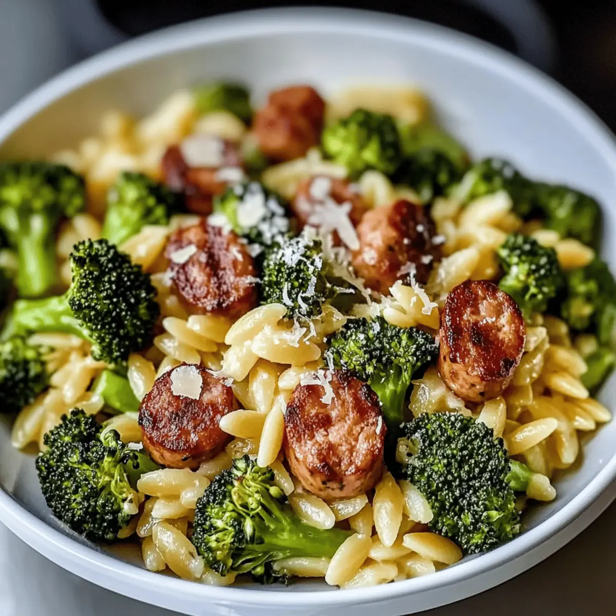 Jump to Recipe Print RecipeAs I sliced into the juicy chicken sausage, a rich aroma filled my kitchen, instantly transporting me to a cozy family dinner. That’s the magic of my Quick Chicken Sausage and Broccoli Orzo—a delightful one-pot meal ready in just 30 minutes, perfect for those bustling weeknights. This recipe not only features protein-packed chicken sausage but also vibrant broccoli and tender orzo that make it a nourishing choice for anyone eager to trade fast food for something homemade and wholesome. And with the flexibility to swap in turkey sausage or a plant-based option, you can cater to diverse tastes and dietary needs. Imagine the smiles at the dinner table as everyone digs into this comforting dish, while you enjoy a speedy cleanup afterward. Curious to discover how easily this comforting, satisfying meal comes together? Let’s dive right in! Why is this recipe a must-try? Simplicity: This one-pot meal comes together in just 30 minutes, making it a lifesaver for busy weeknights. Flavor-packed: The combination of savory chicken sausage, fresh broccoli, and creamy orzo creates a dish bursting with deliciousness that your taste buds will thank you for. Versatile: Customize your orzo by swapping chicken sausage for turkey or plant-based options, and feel free to add in more veggies like spinach or bell peppers for an extra nutritional punch. Easy Cleanup: One pot means less fuss and more time to relax after cooking—a win for anyone tired of the fast food grind! Impressive Appeal: The vibrant colors and textures make this dish not just a meal, but a star attraction at your dinner table. Try it alongside recipes like Thai Basil Chicken for added variety during the week! Chicken Sausage and Broccoli Orzo Ingredients For the Orzo • Orzo Pasta – A delightful bite-sized shape that serves as the main carbohydrate; opt for gluten-free orzo if you need to accommodate dietary restrictions. • Chicken Broth – Infuses rich flavor into the dish; feel free to use vegetable broth for a vegetarian alternative. For the Main Dish • Chicken Sausage – Brings hearty flavor and protein; turkey sausage or plant-based sausage can be used for a lighter or vegetarian option. • Broccoli Florets – Adds vibrant color and essential nutrients; substitute with bell peppers or spinach for variety. • Garlic – A must-have for depth of flavor; fresh minced garlic works wonders. • Olive Oil – Essential for sautéing, providing moisture and facilitating the cooking process. • Italian Seasoning – A flavorful herb blend that elevates the dish’s taste; it’s key for authentic flavor. • Salt and Pepper – Basic seasoning to enhance all flavors in the dish. For Creaminess • Parmesan Cheese – Adds a rich, creamy finish to the dish; leave out for a dairy-free version. • Fresh Parsley – A sprinkle on top for a burst of freshness and to enhance visual appeal. Step‑by‑Step Instructions for Chicken Sausage and Broccoli Orzo Step 1: Heat the Olive Oil In a large pot or Dutch oven, heat 2 tablespoons of olive oil over medium heat until it shimmers, signaling it’s ready for cooking. This usually takes about 2 minutes. The warm oil will help sauté the ingredients, releasing their flavors as you create your heartwarming Chicken Sausage and Broccoli Orzo. Step 2: Brown the Chicken Sausage Add the sliced chicken sausage to the pot, spreading it out in a single layer. Allow it to cook for 5–7 minutes, stirring occasionally, until nicely browned and sizzling. This browning process intensifies the savory flavor of the sausage, making your orzo dish even more delicious. Step 3: Sauté the Garlic Once the sausage is golden brown, stir in 3 minced garlic cloves. Cook for about 1 minute, until the garlic becomes fragrant and starts to soften. This step is crucial for building layers of flavor in your Chicken Sausage and Broccoli Orzo. Step 4: Add the Broccoli Incorporate 2 cups of broccoli florets into the pot, sautéing for 2–3 minutes. You’ll notice the vibrant green color and slight tenderness as they begin to soften. This adds a healthy crunch and lively color to your one-pot meal while also enhancing its nutritional value. Step 5: Incorporate the Orzo and Broth Pour in 1 cup of orzo pasta along with 3 cups of chicken broth, 1 teaspoon of Italian seasoning, and a sprinkle of salt and pepper. Bring the mixture to a boil, allowing all the flavors to meld together beautifully. This should take about 3–4 minutes before you can move on to the next step. Step 6: Simmer until Tender Once boiling, reduce the heat to low and cover the pot. Allow it to simmer for 10–12 minutes, stirring occasionally. You’ll know it’s done when the orzo is tender and has absorbed most of the liquid, creating a creamy consistency that perfectly complements the Chicken Sausage and Broccoli Orzo. Step 7: Stir in the Cheese Remove the pot from heat and stir in ½ cup of grated Parmesan cheese. The cheese will melt and blend smoothly into the dish, enriching the flavors and providing a creamy texture. This finishing touch elevates your Chicken Sausage and Broccoli Orzo into a truly comforting meal. Step 8: Serve and Garnish Scoop the Chicken Sausage and Broccoli Orzo into serving bowls while it’s hot, garnishing with freshly chopped parsley. This bright touch adds a splash of color and freshness. Your wholesome, homemade meal is now ready to be enjoyed, bringing smiles to the dinner table. How to Store and Freeze Chicken Sausage and Broccoli Orzo Fridge: Store leftover Chicken Sausage and Broccoli Orzo in an airtight container for up to 3 days to maintain freshness and flavor. Freezer: For longer storage, freeze portions in airtight containers or heavy-duty freezer bags for up to 3 months. Thaw in the fridge overnight before reheating. Reheating: When reheating, add a splash of chicken broth to keep the orzo from hardening and ensure a creamy texture. Heat gently on the stovetop or in the micr