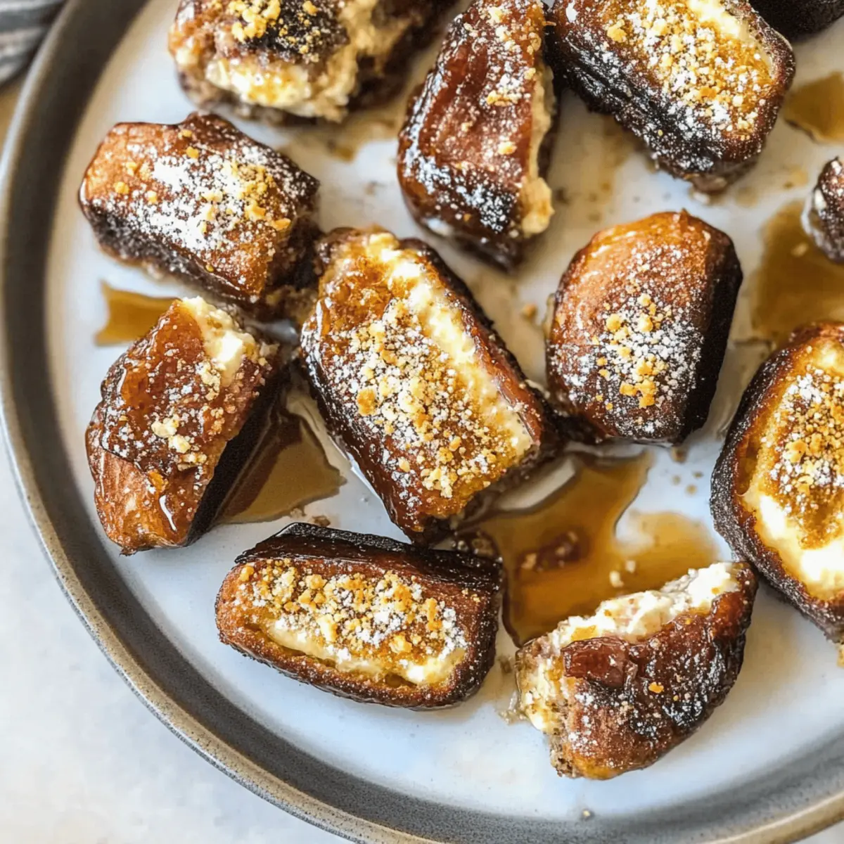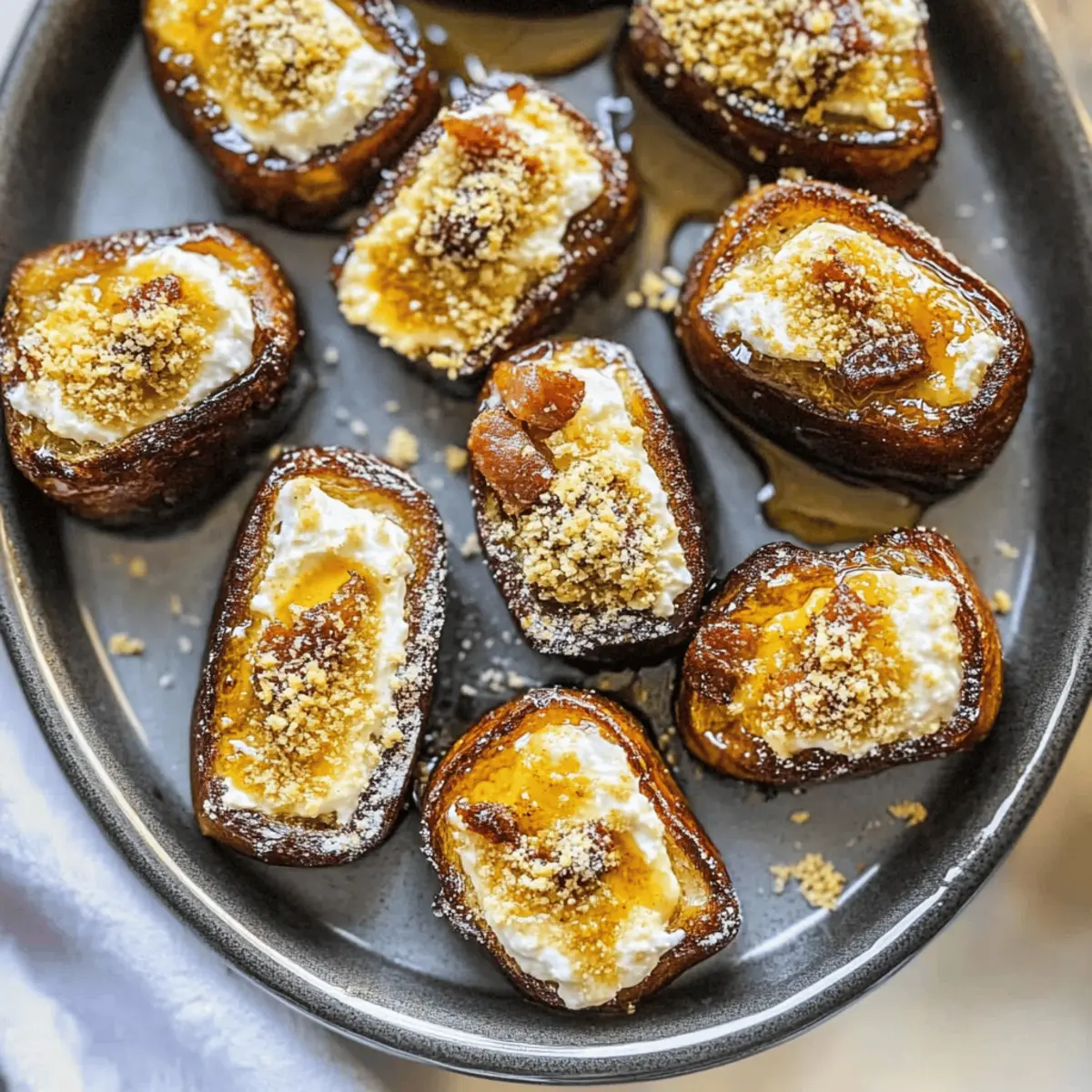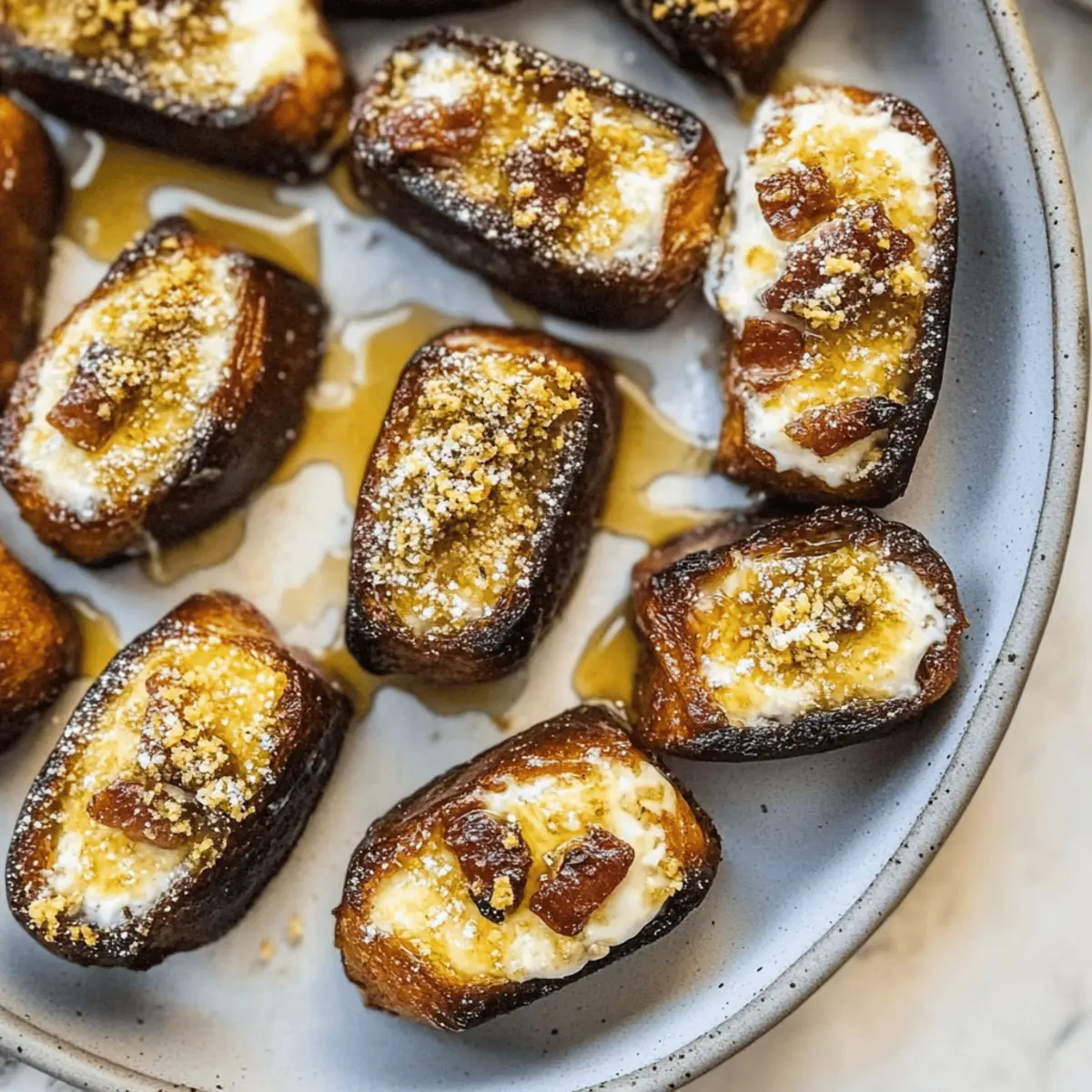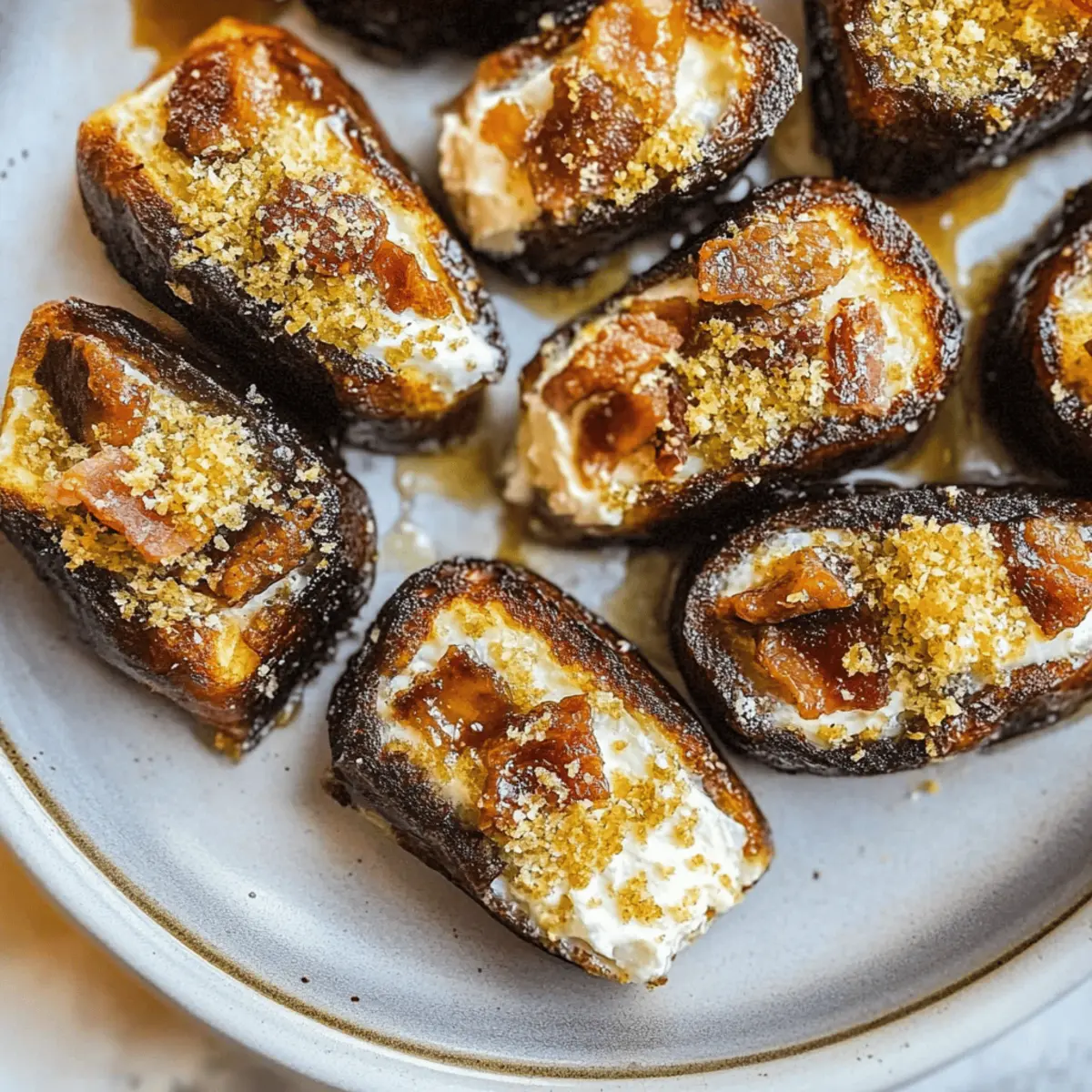 Jump to Recipe Print RecipeThere’s something enchanting about the combination of sweet and savory, and these Easy Goat Cheese Stuffed Dates deliver just that. With the luscious, chewy Medjool dates embracing a creamy filling of tangy goat cheese, they create a bite-sized treat that’s sure to impress. This no-cook recipe is not only a deliciously quick snack but also a versatile crowd-pleaser, perfect for gatherings or just a satisfying indulgence at home. Plus, with a simple substitute for a vegan version using nut butter, everyone can enjoy this delightful treat. Are you ready to transform your snack game with this irresistible combination? Why are Stuffed Dates so Irresistible? Deliciously Unique: The fusion of sweet Medjool dates and creamy goat cheese creates an unforgettable flavor experience. No-Cook Convenience: This quick recipe requires no cooking, making it an ideal treat for busy days or spontaneous get-togethers. Vegan-Friendly Option: Easily swap goat cheese for your favorite nut butter, ensuring everyone can indulge in this delightful snack. Crowd-Pleasing Appeal: Serve these on a cheese board alongside other appetizers like Spinach Ricotta Stuffed shells or Orange Chicken to create a feast of flavors. Textural Harmony: Expect delightful softness from the dates paired with the creamy filling and a satisfying crunch from pistachios, making every bite memorable! Easy Stuffed Dates Ingredients For the Dates • Medjool Dates – Look for fresh, plump dates for the best sweetness and chewiness. For the Filling • Goat Cheese – Ensure it’s at room temperature for easier stuffing; substitute with nut butter for a delicious vegan option. For the Toppings • Pistachios – Adds a delightful crunch and nutty flavor; feel free to swap with walnuts or pumpkin seeds if preferred. • Smoked Paprika – Optional, but it enhances the flavor with a subtle smokiness that pairs beautifully in these easy stuffed dates. Step‑by‑Step Instructions for Easy Stuffed Dates Step 1: Prep the Dates Start by carefully slicing the Medjool dates along one side to expose the pit. Use a small knife to remove the pit entirely, taking care not to slice through the opposite side. Aim for fresh, plump dates, which will make the Easy Stuffed Dates sweeter and more enjoyable. Step 2: Prepare the Filling Allow the goat cheese to come to room temperature, as this makes it easier to work with. In a mixing bowl, you can use a fork to mash it slightly if needed. For vegan versions, opt for creamy nut butter. Ensure your filling is smooth and ready to spoon or pipe into the date cavities. Step 3: Stuff the Dates Using a small spoon or piping bag, fill each date generously with the prepared goat cheese or nut butter. Aim to pack each cavity fully, making sure the filling slightly overflows for a tantalizing presentation. This step forms the heart of your Easy Stuffed Dates, showcasing the delightful balance of sweet and savory. Step 4: Add Crunch and Flavor Sprinkle a few crushed pistachios on top of each stuffed date, adding a delightful crunch. If you’d like to enhance the flavor even further, lightly dust with smoked paprika, which lends a unique smokiness. These toppings elevate the appearance and taste of your Easy Stuffed Dates. Step 5: Serve or Refrigerate Arrange your beautifully filled dates on a serving platter. If serving immediately, allow at least a few minutes for flavors to meld. Alternatively, for later enjoyment, place them in a sealed container and refrigerate. Just remember to let them warm to room temperature before serving for the best flavor and texture. Storage Tips for Easy Stuffed Dates Fridge: Store your Easy Stuffed Dates in a sealed container in the refrigerator for up to 1 day. They’re best enjoyed fresh, but the fridge helps maintain their texture. Room Temperature: These tasty snacks can be served immediately after preparation or left at room temperature for about 30 minutes prior to serving to enhance flavors. Freezer: For longer storage, you may freeze unstuffed Medjool dates for up to 3 months. Just make sure they are well-wrapped to prevent freezer burn. Reheating: If you’ve chilled your stuffed dates, allow them to warm up at room temperature for about 15 minutes before serving for the best taste experience! Easy Stuffed Dates Variations Get creative with your Easy Stuffed Dates and discover new flavor profiles that your taste buds will adore! Nut Butter Twist: Substitute goat cheese with creamy almond or cashew butter for a plant-based delight. This swap adds a nutty richness that pairs beautifully with sweet dates. Herb Infusion: Mix fresh herbs like basil or thyme into your filling for an aromatic twist. The herby notes elevate the flavor, giving your stuffed dates a fresh, garden-inspired taste. Different Nuts: Experiment with crushed walnuts or pumpkin seeds as your topping for a unique crunch. Each nut brings its own character, creating delightful variations each time. Honey Drizzle: Add a touch of sweetness with a drizzle of honey or agave syrup on each stuffed date. The sticky sweetness beautifully balances the rich and creamy filling. Balsamic Glaze: For a tangy finish, drizzle some balsamic glaze over the top. This adds a bold flavor contrast that rounds out the dish elegantly. Spiced Up: Incorporate a pinch of cayenne pepper or red pepper flakes into the filling for a spicy kick. The heat contrasts well with the sweetness of the dates, creating a balance of flavors. Chocolate Dipped: For an indulgent treat, dip each stuffed date in melted dark chocolate and let it set. This decadent choice will satisfy any sweet tooth, making them truly irresistible! Savory Option: Swap out the goat cheese for cream cheese mixed with garlic and chives for a savory twist. These are great for those craving a different flavor approach while still enjoying the delightful date! As you explore these variations, consider serving your stuffed dates alongside snacks like Spinac