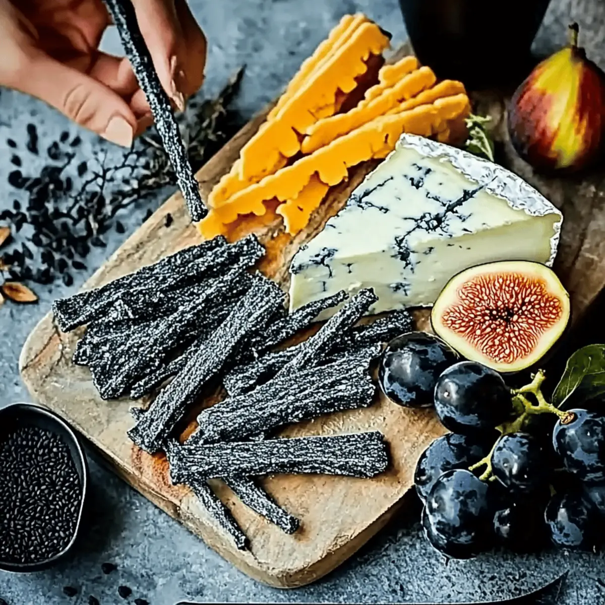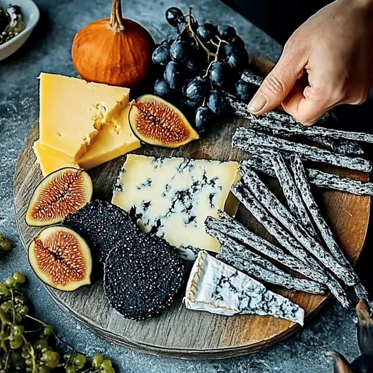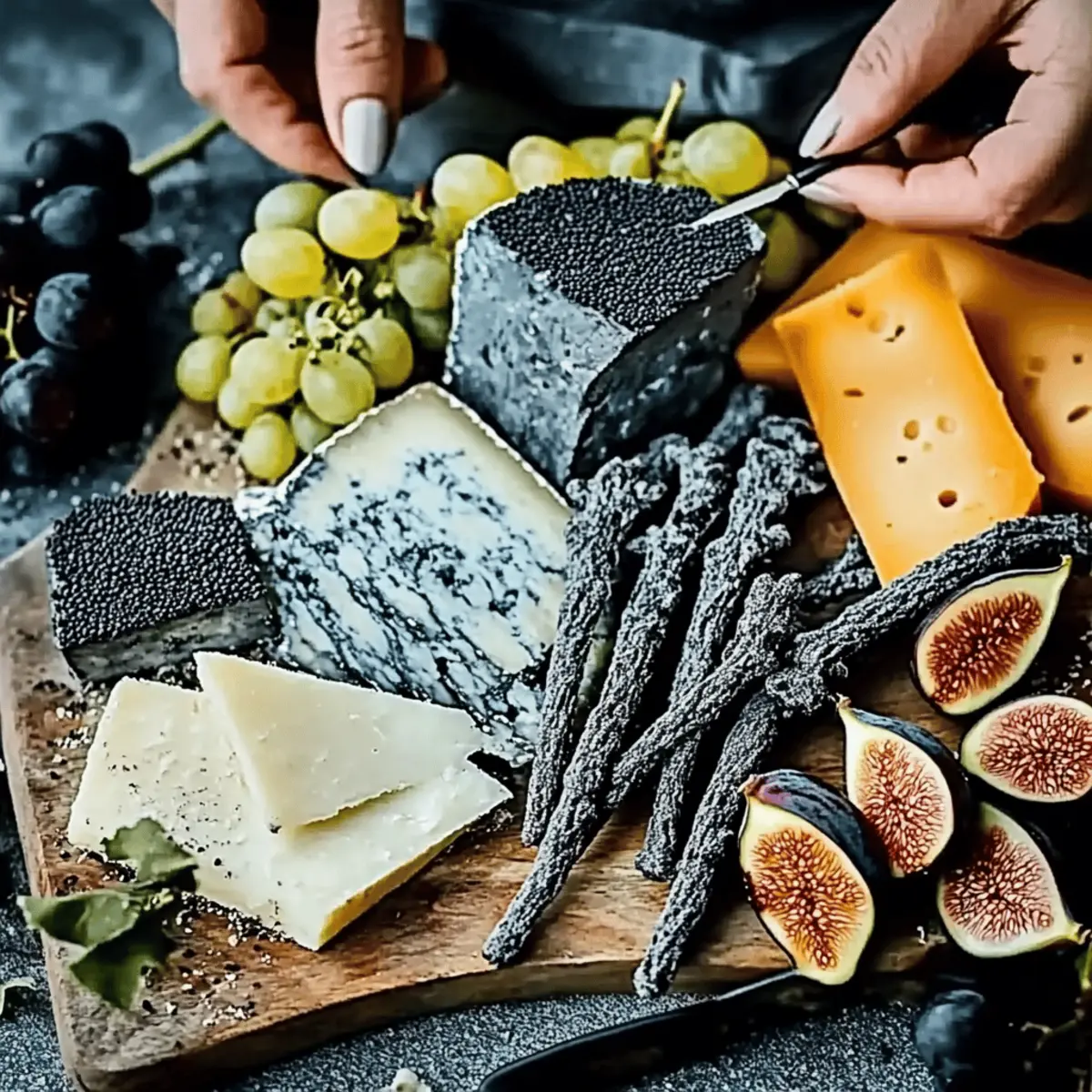 • Selection of Cheeses – Choose a vibrant orange cheese, a blue-veined variety, and a striking charcoal-coated cheese for a visually appealing spread.