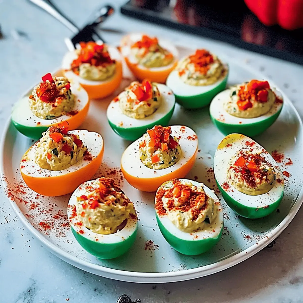 These Halloween devilled eggs feature vibrant colors and a creamy filling, making them a must-have for festive celebrations.