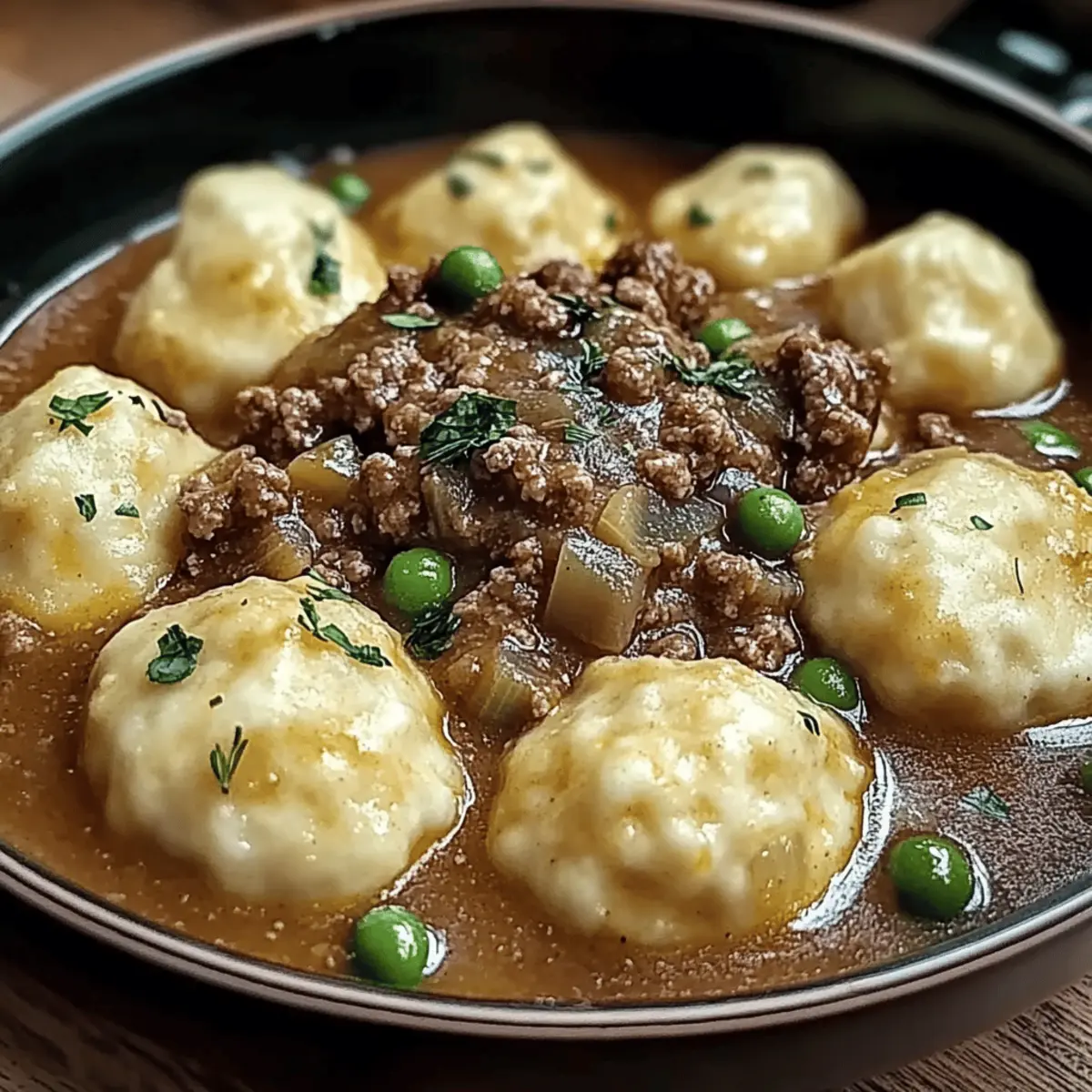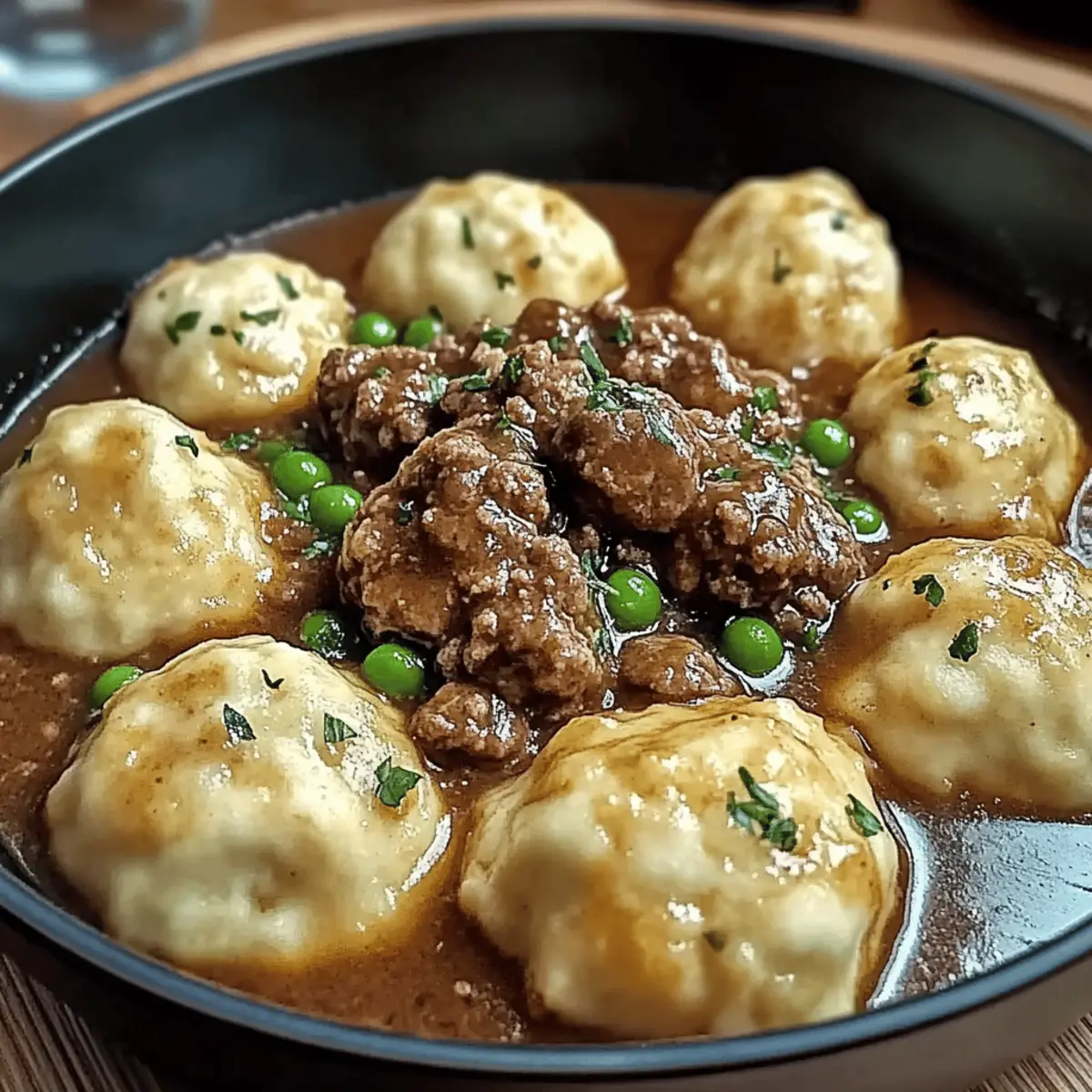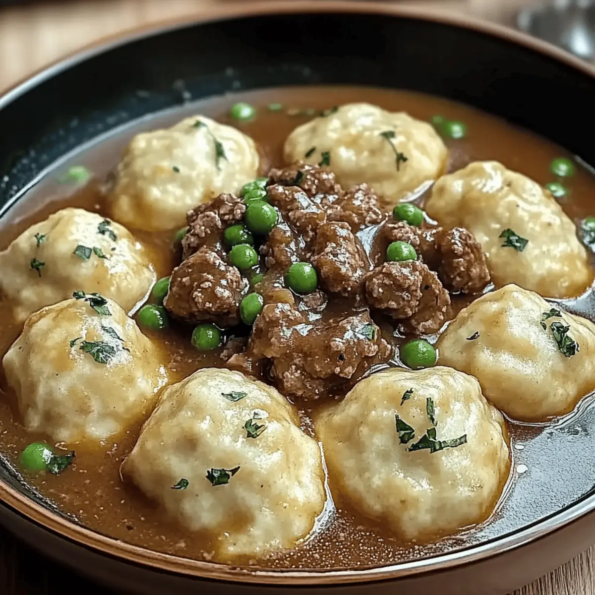 Jump to Recipe Print RecipeThe aroma of savory spices and freshly baked dumplings dances through the air, wrapping me in a warm embrace of nostalgia. There’s something irresistibly comforting about a big bowl of Hearty Ground Beef and Dumplings, a meal that feels like a hug on a plate. This dish marries juicy, seasoned ground beef with soft, fluffy dumplings in a rich broth, creating a satisfying dinner that’s perfect for busy weeknights or cozy Sundays. With straightforward preparation and deep, homey flavor, it’s a wonderful way to gather the family around the table. Not only is this recipe quick to whip up, but it also offers a delicious escape from the hustle of fast food, making every bite an inviting reminder of home. Are you ready to transform your kitchen into a haven of comfort? Let’s dive into making this delightful dish! Why is this dish so comforting? Wholesome Ingredients: Packed with juicy ground beef and vibrant vegetables, this recipe ensures a hearty dish that nourishes both body and soul. Quick Preparation: Ready in under an hour, you’ll spend less time cooking and more time enjoying meals with those you love. Bowl of Joy: Each bowl is filled with tender dumplings that soak up the rich broth, creating a flavor explosion that leaves everyone wanting more. Perfect for Any Occasion: Whether it’s a casual family dinner or a cozy gathering with friends, this dish brings everyone together in a delightfully rustic way. If you enjoy home-cooked meals, you’ll also love my Cabbage Potato Soup or Slow Cooker Beef recipes for those cozy nights. Rich in Tradition: Rooted in British cuisine, it celebrates the comforting, simple meals we all crave, bridging generations through food. Hearty Ground Beef and Dumplings Ingredients For the Beef Mixture Ground Beef – Key for heartiness; use 85% lean for optimum flavor and juiciness. Olive Oil – Helps with browning the beef; especially useful if using leaner cuts. Onion – Adds natural sweetness and depth; finely dice for best results. Garlic – Mincing enhances the flavor profile by releasing aromatic oils. Tomato Paste – Introduces rich umami; a quick sauté brings out its depth. Beef Broth – Provides the flavorful base; for a lighter option, consider chicken broth. Dried Thyme & Paprika – Seasonings that add warmth and herbal notes to the dish. Salt & Pepper – Essential for enhancing flavors; adjust according to taste. Frozen Peas or Mixed Vegetables (optional) – A colorful and nutritious addition; stir in during the simmer. For the Dumplings All-Purpose Flour (2 tbsp + 1 cup) – Provides structure and thickening; sift for light dumplings. Baking Powder – Vital for leavening and the fluffiness of the dumplings. Butter (1 tbsp, softened) – Adds richness; make sure it’s cold for lighter texture. Milk (½ cup) – Moistens dumpling dough; whole or 2% works best for richness. This Hearty Ground Beef and Dumplings recipe captures the essence of comfort food with its rich ingredients and heartfelt flavors. Can’t wait for you to try it! Step‑by‑Step Instructions for Hearty Ground Beef and Dumplings Step 1: Brown the Beef In a large skillet, heat a drizzle of olive oil over medium heat. Once hot, add 1 pound of ground beef, cooking until it’s browned and no longer pink, about 6-8 minutes. Use a wooden spoon to break up the meat as it cooks. If there’s excess fat, drain it off, leaving a little for flavor. Step 2: Add Aromatics Next, add a finely diced onion to the skillet with the beef and sauté for about 4 minutes until it softens. Stir in minced garlic and cook for an additional minute, allowing the fragrant aroma to fill your kitchen as the onion turns translucent and the garlic becomes slightly golden. Step 3: Build the Sauce Mix in a couple of tablespoons of tomato paste, stirring for about 1 minute to deepen the flavor. Then, sprinkle in 1 cup of all-purpose flour, stirring well to combine. Gradually pour in 3 cups of beef broth while continuously stirring to avoid lumps; season with thyme, paprika, salt, and pepper to taste, bringing it all together. Step 4: Simmer Allow the beef mixture to simmer over medium-low heat for about 8-10 minutes, stirring occasionally until the sauce thickens and becomes gravy-like. If you would like, stir in some frozen peas or mixed vegetables for color and nutrition, letting them warm through during this process. Step 5: Prepare Dumpling Dough In a separate bowl, whisk together 1 cup of all-purpose flour, 1 tablespoon of baking powder, and a pinch of salt. Cut in 1 tablespoon of softened butter with a fork until the mixture resembles coarse crumbs, then mix in ½ cup of milk until just combined, ensuring not to overwork the dough. Step 6: Add Dumplings Drop heaping tablespoons of the dumpling dough over the simmering beef mixture, aiming for about 6-8 dumplings. Gently cover the skillet with a lid, then reduce the heat to low. This step is crucial; the lid will help the dumplings steam to fluffy perfection. Step 7: Steam Dumplings Allow the dumplings to steam for 15 minutes without lifting the lid, creating a tender texture as they cook in the steam rising from the beef mixture below. Keep the heat steady and resist the temptation to peek, ensuring they retain their fluffiness. Step 8: Serve Once the dumplings have finished steaming, remove the skillet from heat and let it sit uncovered for about 5 minutes. Then, scoop generous portions of the Hearty Ground Beef and Dumplings into bowls, ensuring each serving captures the savory beef and fluffy dumplings for a comforting, delicious meal. Expert Tips for Hearty Ground Beef and Dumplings Don’t Peek: Resist the urge to lift the lid while the dumplings steam. This keeps them fluffy by ensuring steam stays trapped inside. Optimal Beef: Choose 85% lean ground beef for that perfect balance of flavor and juiciness. Leaner options may require adding a splash of olive oil for moisture. Stir Gently: When adding beef bro