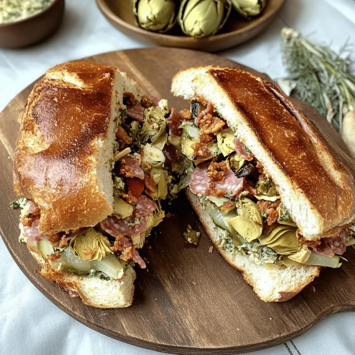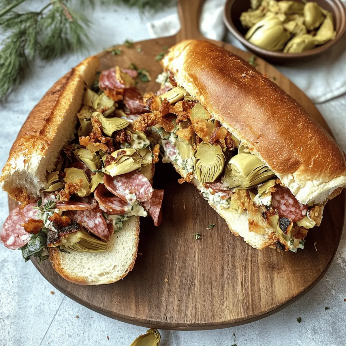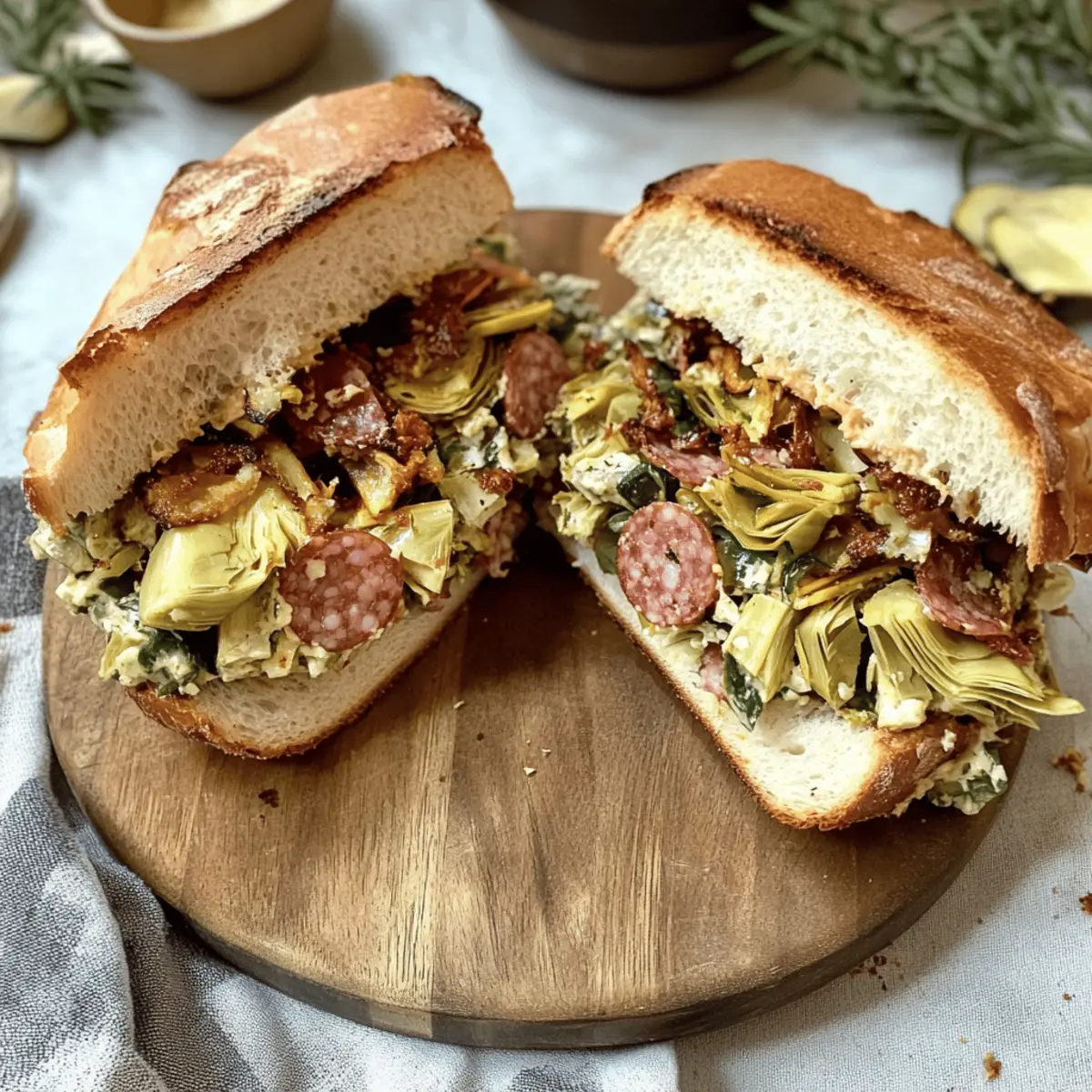 Jump to Recipe Print RecipeAs I strolled through a bustling Italian market one sun-drenched afternoon, the vibrant colors of fresh produce and fragrant herbs whispered culinary secrets to me. That’s when I discovered the inspiration for this Hearty Italian Chopped Sandwich with Crispy Artichokes. Each layer in this sandwich is a celebration of Mediterranean flavors, combining savory meats, creamy textures, and that unbeatable crunch from the crispy artichokes. Not only is this recipe perfect for lunch, but it’s also a delightful way to turn simple ingredients into a satisfying meal. With quick prep and endless possibilities for ingredient swaps, you can customize it to fit your cravings or pantry leftovers. Are you ready to dive into this culinary adventure? Why is this sandwich a must-try? Bold flavors: This Hearty Italian Sandwich With Crispy Artichokes is packed with robust Mediterranean tastes, ensuring that each bite is a flavor explosion. Easy customization: With various substitution options for ingredients, you can easily adapt it to your dietary preferences or what’s available in your kitchen. Crispy crunch: The delightful texture of the crispy artichokes pairs perfectly with the creamy olive mayo, creating a satisfying contrast. Quick preparation: In less than an hour, you can whip up this delicious lunch, making it perfect for busy days. Crowd-pleaser: Whether it’s for a family meal or a friendly gathering, this sandwich never fails to impress. For even more inspiration, check out my Pork Chops with Potatoes in Gravy or a refreshing Arugula Salad with Shaved Parmesan! Italian Sandwich With Crispy Artichokes Transform your lunch with this flavorful delight! For the Sandwich Italian Rolls – The perfect bread base for your sandwich; ciabatta or focaccia works beautifully too. Salami – Adds a salty, savory touch; feel free to substitute with prosciutto or turkey for a lighter bite. Provolone Cheese – Creamy richness that complements the other layers; mozzarella is a milder choice if preferred. Iceberg Lettuce – Adds a fresh crunch; swap it with arugula for a peppery twist. Cherry Tomatoes – Bursting with juicy sweetness; if you prefer crunch, sliced cucumbers are a great substitute. Garbanzo Beans – A delicious source of protein; chickpeas are a wonderful alternative if needed. Red Onion – Brings a sharp crunch; for a milder option, green onions are perfect. Pepperoncini – Introduces tangy, mild heat; jalapeños can add a spicier kick if desired. For the Crispy Artichokes Artichoke Hearts – The star for that delightful crispiness; roasted bell peppers can also add flavor. Panko Breadcrumbs – Create a lovely crispy coating; regular breadcrumbs will do in a pinch. Olive Oil – Essential for binding and enhancing flavors; don’t skip this! Espelette Pepper – Imparts warmth and subtle heat; paprika is an excellent everyday substitute. Salt – Essential to enhance flavors; use sparingly for the best taste. For the Olive Mayo Mayonnaise – The creamy base for your flavorful spread; Greek yogurt is a lighter alternative. Castelvetrano Olives – Rich and buttery; Kalamata olives provide a stronger taste if you prefer. Red Wine Vinegar – Adds tangy brightness; apple cider vinegar can offer a touch of sweetness. Fresh Parsley, Garlic, Lemon Juice, Fresh Rosemary, Dried Oregano – Key herbs for depth; opt for fresh when possible; dried ones can substitute at a 1:3 ratio. With this Italian Sandwich With Crispy Artichokes, you’ll effortlessly turn an ordinary lunch into something extraordinary! Step‑by‑Step Instructions for Italian Sandwich With Crispy Artichokes Step 1: Prep Artichokes Preheat your oven to 400°F (200°C). While it warms up, slice the artichoke hearts in half and place them in a bowl. Drizzle with olive oil, then generously coat with panko breadcrumbs, seasoning with salt and espelette pepper. The olive oil should glisten on the artichokes for that golden crunch you’re aiming for! Step 2: Roast Artichokes Arrange the coated artichokes cut-side up on a baking sheet lined with parchment paper. Slide them into the preheated oven and bake for 35–40 minutes. About halfway through, rotate the sheet for even browning. Look for a crispy, golden finish that signals they’re ready to add texture to your Italian sandwich! Step 3: Make Vinaigrette In a small bowl, whisk together olive oil, red wine vinegar, Dijon mustard, lemon juice, fresh rosemary, and dried oregano. Aim for a smooth consistency that’s well-blended. Taste and adjust seasoning to your liking, allowing the vibrant flavors to complement the hearty components of the Italian Sandwich With Crispy Artichokes. Step 4: Prepare Olive Mayo In a food processor, combine Castelvetrano olives, fresh parsley, mayonnaise, garlic, and a splash of red wine vinegar. Pulse until the mixture becomes smooth and creamy. This olive mayo will add a flavorful richness to each bite of your sandwich, ensuring every layer shines through with delicious Mediterranean flair. Step 5: Chop Ingredients Dice the salami, provolone cheese, pepperoncini, red onion, and iceberg lettuce into bite-sized pieces. The crispness of these fresh ingredients, combined with the savory meats, will provide a delightful contrast in your Italian sandwich, ensuring a balance of textures and flavors that are absolutely irresistible. Step 6: Toast Rolls Slice the Italian rolls in half and place them on a baking sheet. Broil in the oven for about 2–4 minutes, watching closely until the edges turn golden and crisp. The aroma of toasting bread will fill your kitchen, preparing you for the delicious assembly of your Italian Sandwich With Crispy Artichokes. Step 7: Assemble Sandwich Start by spreading a generous layer of olive mayo on the cut sides of the toasted rolls. Next, layer the chopped salami, provolone, lettuce, red onion, pepperoncini, and cherry tomatoes as your base. Drizzle with the prepared vinaigrette, then finish 