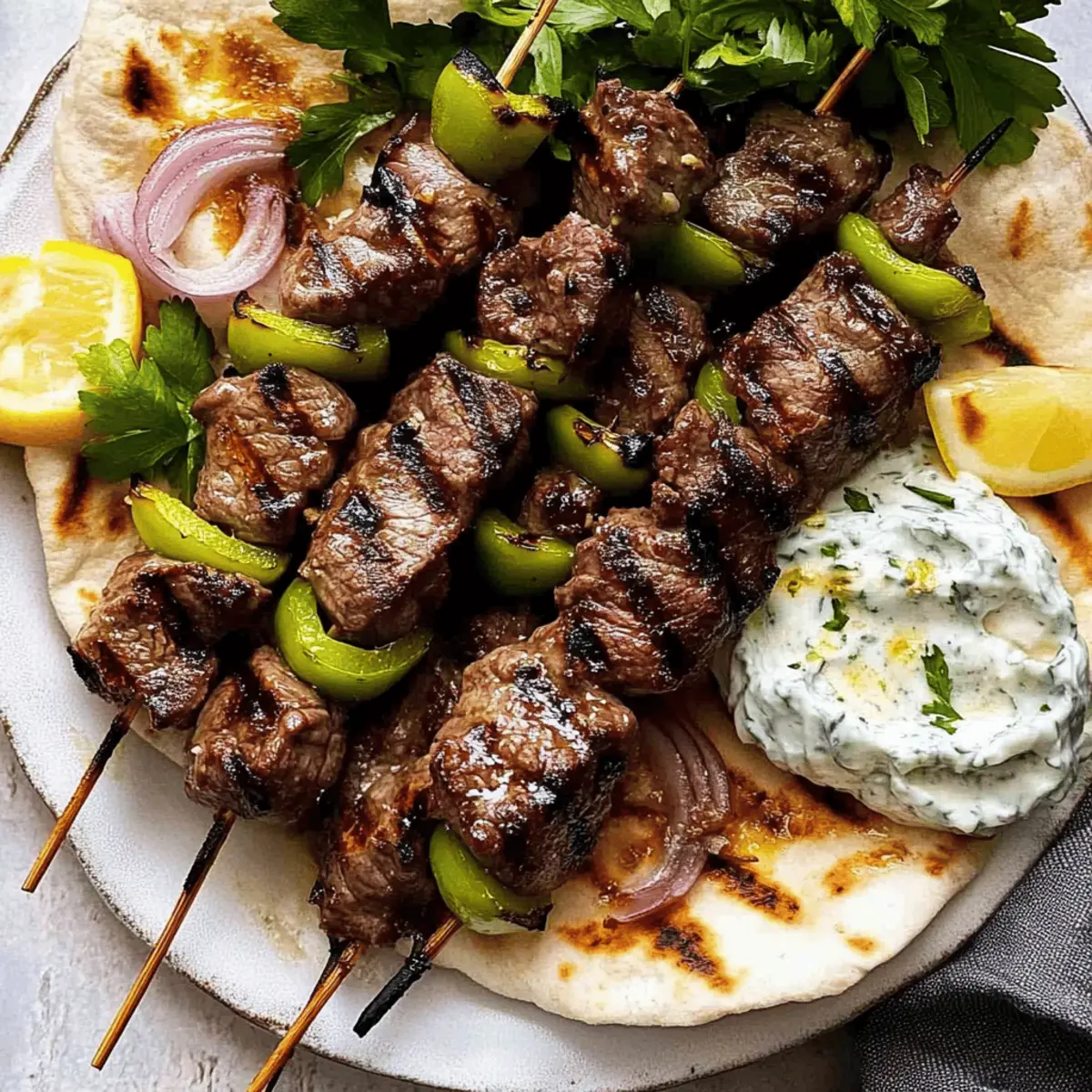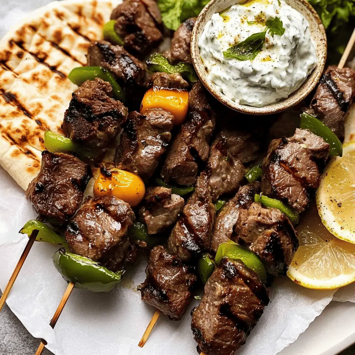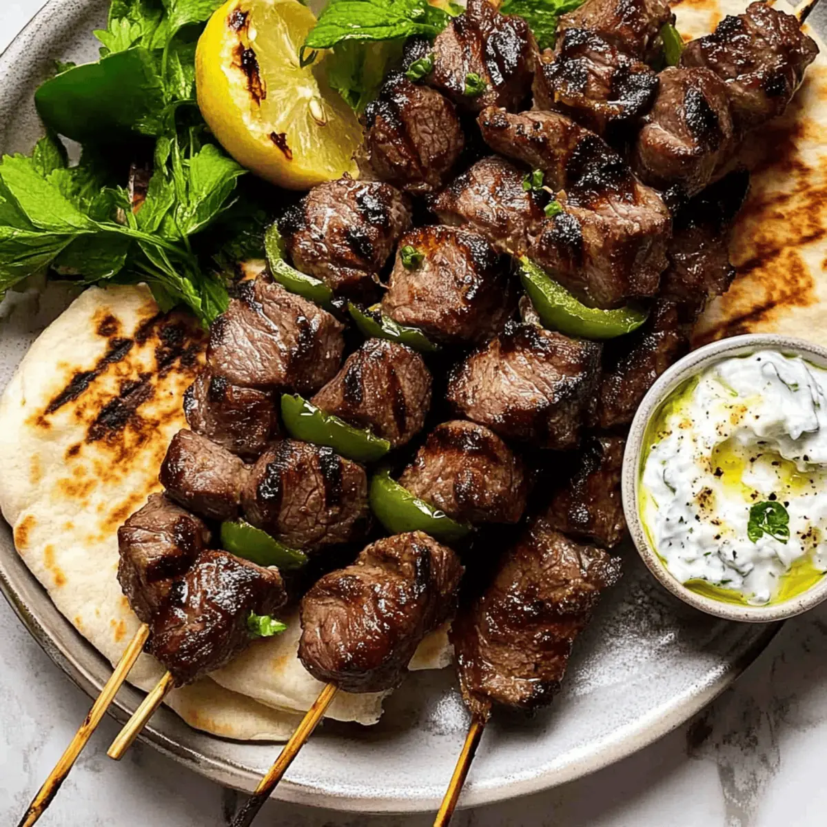 Jump to Recipe Print RecipeAs I stood in my kitchen, the aroma of simmering garlic and bright citrus sent my senses spiraling back to sun-soaked shores of Greece. That’s when I knew it was time to whip up a batch of Lamb Souvlaki, my go-to dish for any occasion. This authentic recipe features tender chunks of marinated lamb grilled to perfection, marrying the vibrant flavors of garlic, lemon, and oregano that transform simple ingredients into a culinary celebration. Not only is this Lamb Souvlaki quick to prepare, but it also serves as the perfect centerpiece for gatherings or a delightful weeknight treat. Ready to elevate your homemade meals? Let’s dive into this deliciously satisfying experience together! Why is Lamb Souvlaki a Must-Try? Simplicity at Its Best: This recipe is straightforward, requiring just a few basic steps to create a stunning meal that impresses. Rich, Savory Flavors: The garlic, lemon, and oregano marinade delivers a burst of Greek goodness that will satisfy your taste buds. Versatile Serving Options: Pair with warm pita and tzatziki or create a full meal with Greek salad; the possibilities are endless! Crowd-Pleasing Dish: Perfect for gatherings, this Lamb Souvlaki will have everyone coming back for more; it’s sure to be a hit at any dinner party! Family-Friendly: Quick to prepare and easy to customize, it’s perfect for busy weeknights when you crave something special. Experience the charm of Mediterranean cuisine and explore variations like Chicken Souvlaki for a delightful twist! Lamb Souvlaki Ingredients Delve into the rich flavors of this essential Greek dish! For the Marinade Boneless Lamb Leg – Provides the rich, tender bites needed for perfect souvlaki. Cooking/Kosher Salt – Essential for enhancing the natural flavors of the lamb. Black Pepper – Adds a touch of heat that pairs beautifully with the marinade. Extra Virgin Olive Oil – Balances acidity and keeps the lamb juicy as it cooks. Garlic Cloves – Minced for robust flavor that integrates well into the marinade. Lemon Juice – A key ingredient for tenderizing the lamb while adding tanginess. Lemon Zest – Offers an additional citrus kick that brightens the dish. Dried Oregano – A staple of Greek cuisine that infuses herby goodness throughout. Fresh Bay Leaves – Crush these to release aromatic oils that enhance the marinade. White Wine Vinegar – Mildly acidic to assist with tenderizing without overpowering. For Serving Pita Bread – Acts as a delicious wrap for your souvlaki, adding a soft texture. Tzatziki or Lemon Yogurt Sauce – Provides a creamy contrast, cooling the palate. Greek Salad – A refreshing side or filling for pita that completes the meal. With this Lamb Souvlaki, you’re setting the stage for a delightful culinary experience that echoes the vibrant streets of Greece! Step‑by‑Step Instructions for Lamb Souvlaki Step 1: Marinate the Lamb In a large bowl, combine the minced garlic, lemon juice, lemon zest, olive oil, salt, black pepper, dried oregano, crushed bay leaves, and white wine vinegar. Cut the boneless lamb leg into 2-inch cubes and add them to the marinade, ensuring each piece is well-coated. Cover the bowl with plastic wrap and refrigerate for at least 12 to 24 hours to enhance tenderness and flavor. Step 2: Prepare the Skewers About 30 minutes before grilling, soak your wooden or bamboo skewers in water to prevent burning. After marinating, remove the lamb from the fridge and thread 3-4 pieces onto each skewer, leaving space between the pieces for even cooking. This Lamb Souvlaki will benefit from direct heat, so ensure your skewers are ready for the grill. Step 3: Heat Your Grill or Pan Preheat your grill or a cast-iron pan over medium-high heat for about 10 minutes. Add a drizzle of olive oil to the pan or brush it on the grill grates to prevent sticking. The desired cooking temperature should be around 200°C (400°F). Once hot, carefully place the lamb skewers onto the grill or in the pan, ensuring they are not overcrowded. Step 4: Cook the Skewers Cook the Lamb Souvlaki for approximately 6 minutes total, rotating every 3 minutes for even searing. Aim for an internal temperature of 60°C (140°F) for medium-rare doneness, or adjust cooking time according to your preference. You’ll know they’re ready when the lamb is beautifully charred and fragrant, showcasing a juicy pink interior. Step 5: Serve and Enjoy Remove the skewers from the heat and let them rest for a few minutes. Arrange the Lamb Souvlaki on a serving platter alongside warm pita bread and a side of tzatziki or lemon yogurt sauce. Fresh Greek salad can also be served as a refreshing accompaniment or filling for your pita. Enjoy the vibrant flavors of Greece right at your table! Lamb Souvlaki Variations & Substitutions Feel free to get creative and make this delightful recipe your own with these tasty options! Chicken Souvlaki: Swap lamb for chicken thighs for a lighter twist. Use the same marinade for a new flavor profile! Vegetarian Delight: Replace lamb with hearty mushrooms or zucchini. Marinate and skewer for a delicious veggie version that’s equally satisfying. Spicy Kick: Add a sprinkle of crushed red pepper flakes to the marinade for a subtle heat that enhances the overall flavor. Different Cuts: Choose lamb shoulder for a richer flavor, but be mindful that it may require a longer cooking time for tenderness. Citrus Burst: Experiment with orange juice in place of lemon juice for a sweeter, unique marinade experience that still shines in brightness. Herb Swap: Mix in fresh herbs like thyme or rosemary along with the oregano for a fragrant twist that takes the dish to another level. Flavorful Sauces: Instead of tzatziki, try a spicy harissa yogurt sauce or a tahini dressing for a new layer of flavor that pairs beautifully. Grain Alternatives: Serve with quinoa or couscous instead of pita bread for a grain-forward dish that adds heartiness and a delightful texture. With s