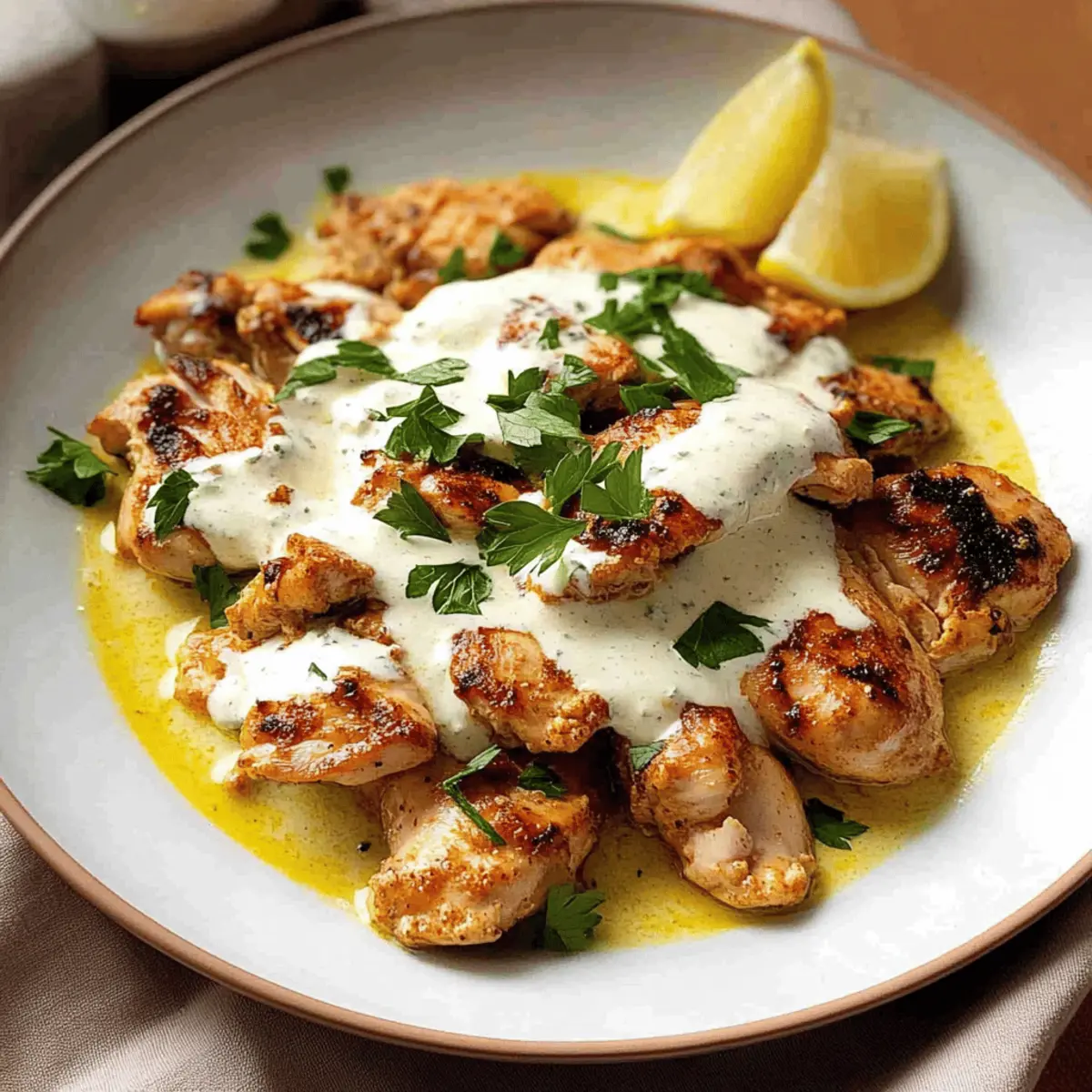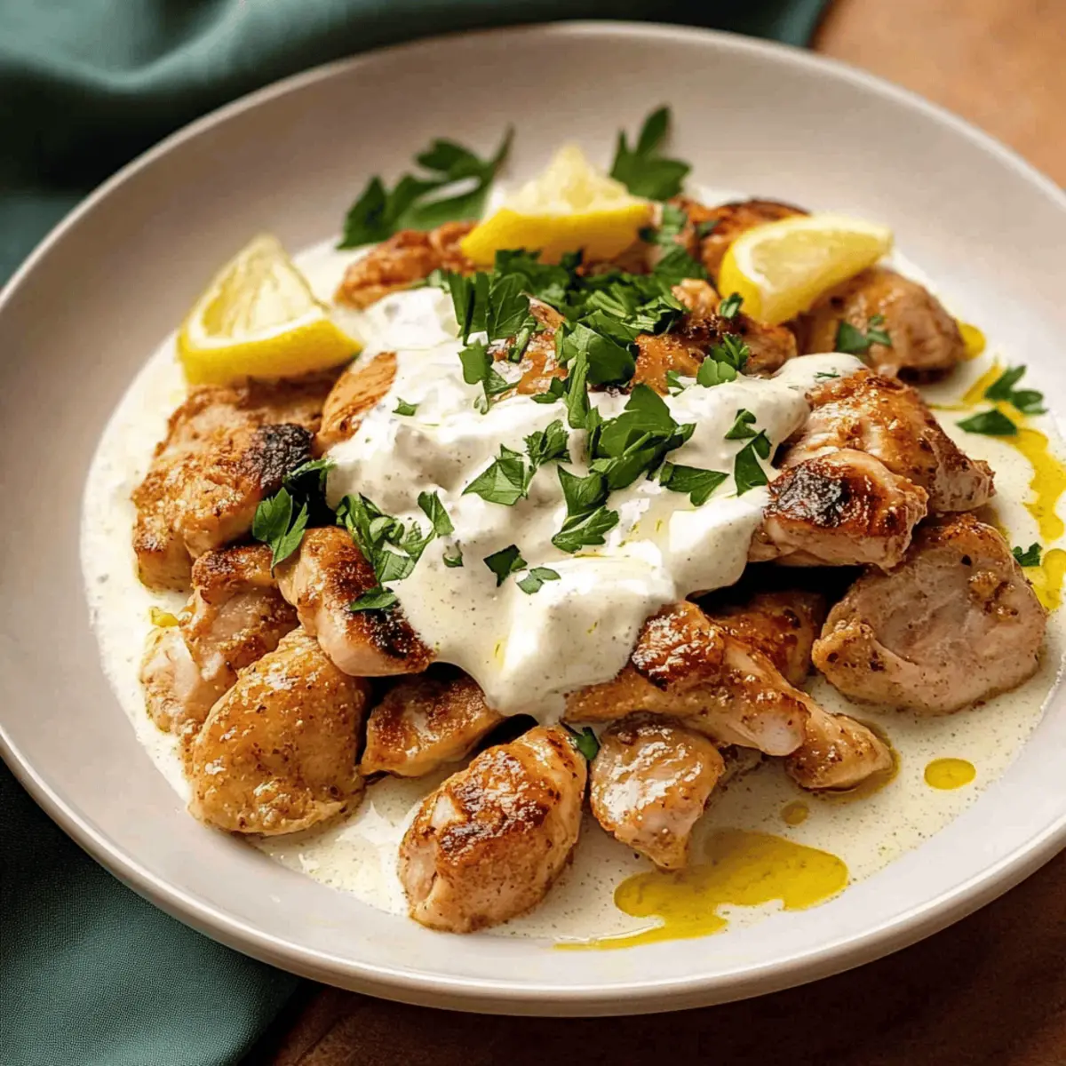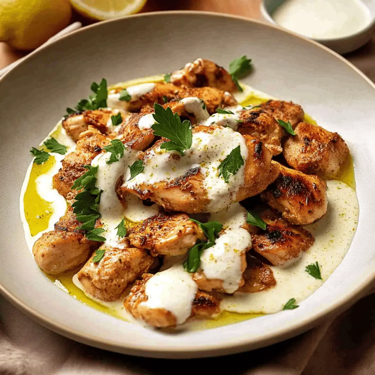 Jump to Recipe Print RecipeThe aroma of roasted garlic and zesty lemon often whisks me away to cozy evenings spent in charming Lebanese eateries, where the flavors dance on your palate. Today, I’m excited to share my take on the beloved Lebanese Lemon Garlic Chicken—an irresistible dish that captures the essence of my favorite Al Aseel restaurant right in the comfort of my home kitchen. This recipe not only delivers a delightful punch of flavor, but it’s also incredibly quick to whip up—making it perfect for those busy weeknights or when you want to impress at a gathering. With a creamy yogurt sauce that’s both gluten-free and full of vibrant lemony goodness, it’s a dish sure to become a favorite at your table. Ready to transform your dining experience? Let’s dive into the details of this delicious Lebanese classic! Why is Lebanese Lemon Garlic Chicken a Must-Try? Juicy, Tender Chicken: The marinating process ensures every bite is bursting with flavor and moisture, giving you that restaurant-quality experience at home. Vibrant Flavors: The combination of zesty lemon and aromatic garlic creates a bold taste that pairs beautifully with the creamy yogurt sauce. Quick and Easy: With minimal prep and cooking time, this dish fits seamlessly into your busy week while still impressing your guests, just like my favorite Garlic Parmesan Chicken. Versatile & Gluten-Free: This recipe caters to various dietary needs, allowing you to impress everyone without compromising taste or health. Perfect for Sharing: Whether it’s a family dinner or a gathering with friends, this Lebanese classic is sure to be an instant hit, offering a delightful twist that makes it memorable! Lebanese Lemon Garlic Chicken Ingredients For the Chicken • Chicken Tenderloin – Acts as the main protein; cut into uniform pieces for even cooking. Substitute with boneless chicken breast or thighs as needed. For the Marinade • Greek or Plain Yogurt – Essential for marinating the chicken, ensuring moisture and flavor retention; full-fat works best for creamy results. • Lemon Juice – Provides acidity for tenderizing and imparts a bright, tangy flavor; fresh lemons are always preferred for optimal taste. • Garlic – Adds aromatic depth to both the marinade and the sauce; finely grated or crushed garlic will give better flavor infusion. • Olive Oil – Enhances the richness in the marinade, balancing the acidity of lemon; extra virgin olive oil is ideal for maximum flavor. • Salt – Crucial for bringing out the flavors in both the marinade and sauce; proper measurement is important for a delicious result. For the Sauce • Tahini (optional) – Introduces a creamy texture to the yogurt sauce without overpowering flavors; replace with extra olive oil if unavailable. • Parsley – Adds freshness as a garnish to the final dish; consider pairing it with mint for an extra herbaceous taste. For Serving • Lebanese Bread – Recommended for serving, it’s perfect for mopping up the delicious yogurt sauce and enhances the meal experience. This flavorful adaptation of the Lebanese Lemon Garlic Chicken is certain to elevate your mealtime, transforming simple ingredients into a delightful feast! Step‑by‑Step Instructions for Lebanese Lemon Garlic Chicken – Al Aseel Step 1: Marinate the Chicken In a large mixing bowl, combine the yogurt, lemon juice, minced garlic, olive oil, and salt to create a flavorful marinade for your Lebanese Lemon Garlic Chicken. Add the chicken tenderloins, ensuring they’re well-coated in the marinade. Cover the bowl with plastic wrap and refrigerate for 12 to 24 hours, allowing the chicken to soak up all those delicious flavors. Step 2: Prepare the Sauce While the chicken marinates, prepare the creamy yogurt sauce. In a microwave-safe bowl, whisk together yogurt, tahini (if using), minced garlic, and a drizzle of olive oil until smooth and creamy. Allow the sauce to sit at room temperature for at least one hour to let the flavors meld beautifully. This step is crucial to enhance the taste of your Lebanese Lemon Garlic Chicken. Step 3: Cook the Chicken After marinating, heat a non-stick pan over medium-high heat and add a splash of olive oil. Remove the chicken from the marinade, allowing excess to drip off, and place it in the hot pan. Cook the chicken for 1.5 to 2 minutes on each side until golden brown and cooked through. Transfer the cooked chicken to a plate and cover it with foil to keep warm while you finish cooking the rest. Step 4: Warm the Sauce Once the chicken is cooked, it’s time to warm up the garlic yogurt sauce. Place the sauce in the microwave and heat it for about 30 to 45 seconds until it’s warm, but be careful not to overheat it. Remove it from the microwave, taste, and adjust the seasoning with salt or lemon juice if desired for your Lebanese Lemon Garlic Chicken. Step 5: Serve To assemble your dish, spread half of the creamy garlic yogurt sauce on a large serving plate. Arrange the golden chicken tenderloins on top, then drizzle the remaining sauce over the chicken. Finish the dish with a light drizzle of olive oil and a sprinkle of freshly chopped parsley for a pop of color. Serve with warm Lebanese bread to scoop up every last bite of this delightful dish. Make Ahead Options These Lebanese Lemon Garlic Chicken recipe is perfect for meal prep enthusiasts! You can marinate the chicken tenderloins up to 24 hours in advance, allowing the vibrant flavors of lemon and garlic to deeply infuse the meat while it refrigerates. Similarly, the creamy yogurt sauce can be prepared and stored in the refrigerator for up to 3 days, ensuring it’s ready when you are. To maintain quality and prevent the chicken from drying out, be sure to store it in an airtight container. When you’re ready to serve, simply cook the marinated chicken and warm the sauce briefly in the microwave, and you’ll have a flavorful, stress-free meal that feels just like dining at your favori