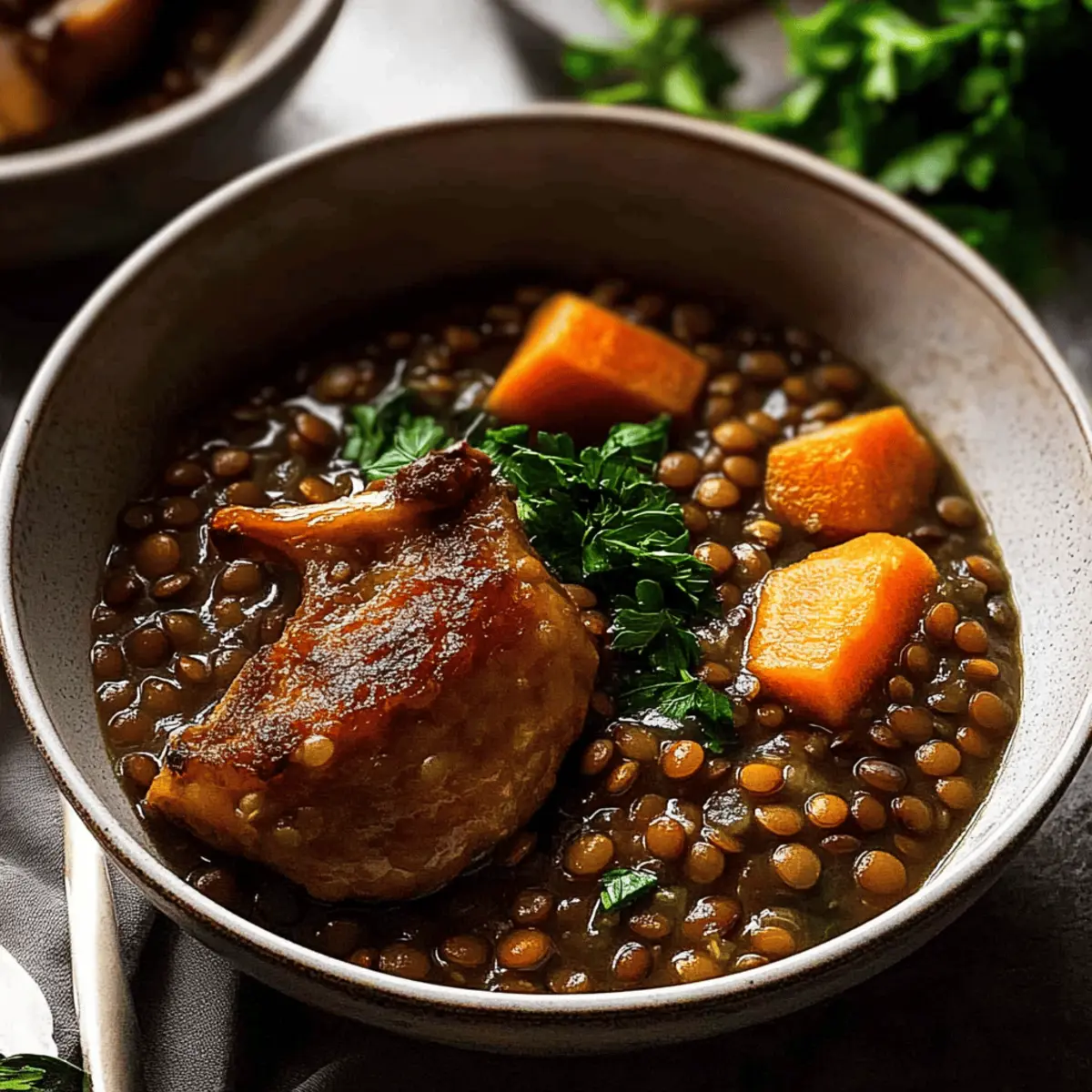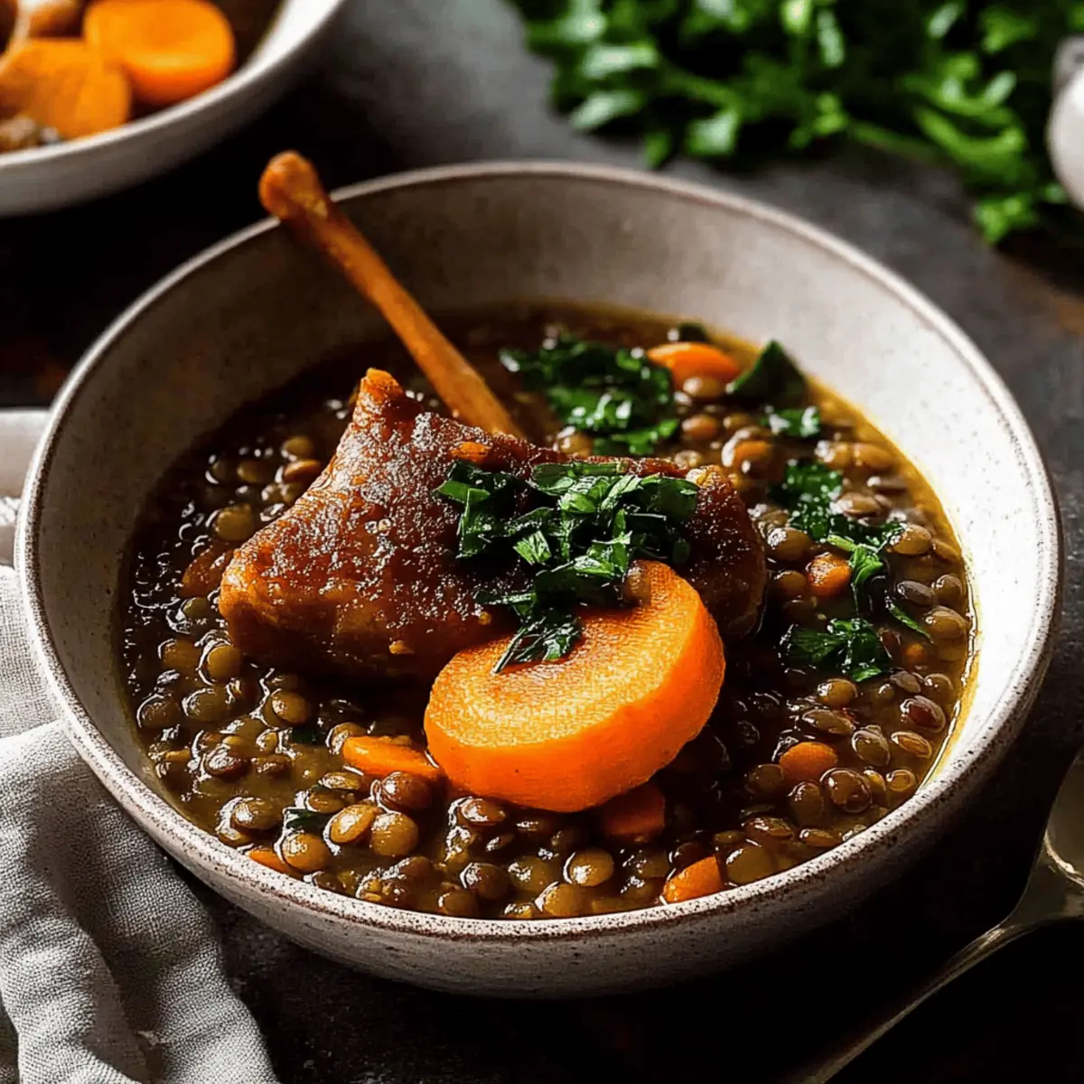 Jump to Recipe Print RecipeAs the cool breeze of autumn rustles through the trees, this aroma wafts from my kitchen, drawing me in like a cozy blanket. I can’t help but feel a sense of warmth and comfort wash over me as I cook up a pot of Classic French Lentil Ragout – a delightful vegetarian and gluten-free side dish that celebrates simple, wholesome ingredients. This recipe transforms humble Puy lentils into a satisfying meal companion, bursting with herbal notes and savory depth. Not only is it quick to prepare, but it’s also an excellent nutritious option that’s sure to please both vegetarians and meat lovers alike. Whether served alongside your favorite roasted chicken or as a hearty centerpiece of a cozy dinner, this ragout promises to elevate your home cooking experience. Are you ready to dive into a world of rich flavors and uncomplicated cooking? Let’s get started! Why is Lentil Ragout so special? Simplicity at its Core: This dish requires minimal prep and cooking skills, making it a perfect choice for busy weeknights or beginner cooks. Hearty and Nutritious: Packed with protein and fiber, this lentil ragout is not just filling but also promotes a healthy diet—ideal for anyone looking to eat well without sacrificing flavor. A French Classic: Embrace culinary tradition with this classic French recipe that elevates lentils into a gourmet side dish, perfect for impressing guests. Versatile Pairing: This ragout is adaptable—serve it alongside roasted meats, like this French Chicken Casserole, or enjoy it as a hearty vegetarian main. Flavor Boosting Tips: Using homemade vegetable stock enhances the depth of flavor, making your dish taste as if it came from a fine restaurant. Get ready for a cooking experience that’s as delightful as the dish itself! Lentil Ragout Ingredients • Dive into the flavors of this Lentil Ragout with vibrant, earthy components. For the Base Olive Oil – Adds richness and helps sauté aromatics; feel free to use avocado oil for a twist. Garlic (1 clove, minced) – Provides aromatic depth; fresh garlic is key for the best flavor. Onion (1/2, finely diced) – Forms the base of flavor; opt for a yellow or brown onion for added sweetness. Carrot (1 large, peeled and finely diced) – Contributes sweetness and texture; can easily be substituted with parsnips or sweet potatoes. For Flavor Tomato Paste (1 tbsp) – Thickens the dish and adds a tangy depth; fresh tomatoes can be used for a fresher taste. Bay Leaf (1, fresh or dried) – Infuses subtle herbal notes as it simmers; don’t forget to remove it before serving! Thyme Sprig (1) – Elevates the ragout’s savory profile; using 1 tsp dried thyme works perfectly in a pinch. For the Heart of the Dish Puy Lentils (1 cup) – The star of this ragout; these lentils hold their shape well, unlike their canned counterparts. Vegetable Stock (3 cups, preferably homemade) – Provides the flavorful liquid base; low-sodium store-bought stock can be a great backup. Salt (1/2 tsp, optional) – Enhances all the flavors; adjust based on your stock’s sodium content. Black Pepper (1/4 tsp) – Adds a hint of heat; modify to suit your taste. For the Finishing Touch Parsley (1 tbsp, finely chopped) – Sprinkled for freshness at the end; substitute with chives if you prefer. Each ingredient plays a crucial role in crafting your Lentil Ragout, making it a delightful, flavorful French side dish! Step‑by‑Step Instructions for Lentil Ragout – French Puy lentil side dish Step 1: Sauté Aromatics Heat 2 tablespoons of olive oil in a large saucepan over medium heat. Once the oil glistens, add 1 minced garlic clove, 1 finely diced carrot, and 1/2 finely diced onion. Sauté these aromatics for about 5 minutes until the onion is translucent and the vegetables have softened, stirring occasionally to prevent sticking. Step 2: Incorporate Tomato Paste Stir in 1 tablespoon of tomato paste, along with 1 bay leaf and 1 thyme sprig. Cook the mixture for 2 minutes, allowing the tomato paste to caramelize slightly and release its tangy aroma, stirring continuously to ensure even distribution and prevent burning. Step 3: Cook Lentils Add 1 cup of Puy lentils and 3 cups of vegetable stock to the pot, ensuring the lentils are well combined with the sautéed mixture. Bring the mixture to a gentle simmer over medium-high heat. Once simmering, reduce the heat to low and allow the lentils to cook uncovered for 15 minutes, stirring occasionally until they become tender but not mushy. Step 4: Finish the Dish Once the lentils are cooked and most of the stock has been absorbed, remove the saucepan from heat. Stir in 1 tablespoon of finely chopped parsley for a fresh touch, and adjust seasoning with salt and pepper to taste. This delightful Lentil Ragout is now ready to be served, aromatic and inviting! Make Ahead Options These Classic French Lentil Ragout are perfect for meal prep enthusiasts! You can sauté the garlic, onion, and carrot up to 24 hours in advance and refrigerate them in an airtight container. Additionally, you can cook the lentils and store them in the fridge for up to 3 days for maximum flavor. To maintain quality, let the mixture cool completely before refrigerating to prevent condensation. When you’re ready to serve, simply reheat the lentil ragout on the stovetop over low heat, adding a splash of vegetable stock to loosen it if necessary, and stir in fresh parsley just before serving. Enjoy restaurant-quality results with minimal fuss! How to Store and Freeze Lentil Ragout Fridge: Store your Lentil Ragout in an airtight container in the refrigerator for up to 5 days. This allows the flavors to deepen and make the dish even more delightful. Freezer: Freeze individual portions of the ragout in freezer-safe bags for up to 3 months. Be sure to label the bags with dates to keep track of freshness. Reheating: To reheat, thaw overnight in the refrigerator, then warm gently on the stove or in the microwave. Add a 