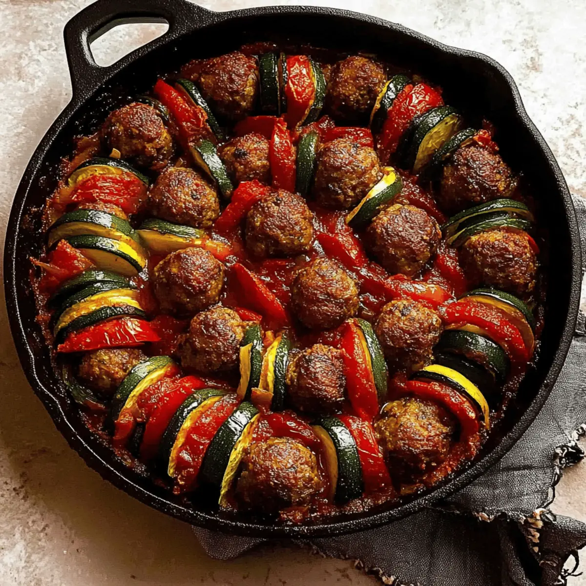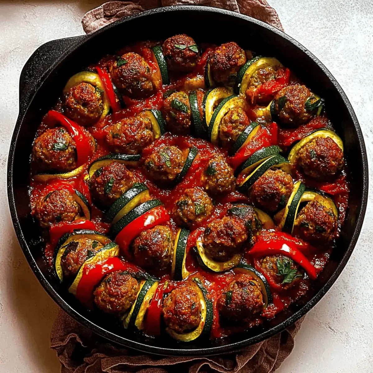 Moroccan Spiral Meatball Zucchini Bake is a vibrant dish combining spiced meatballs and zucchini in a savory sauce, perfect for a comforting dinner.