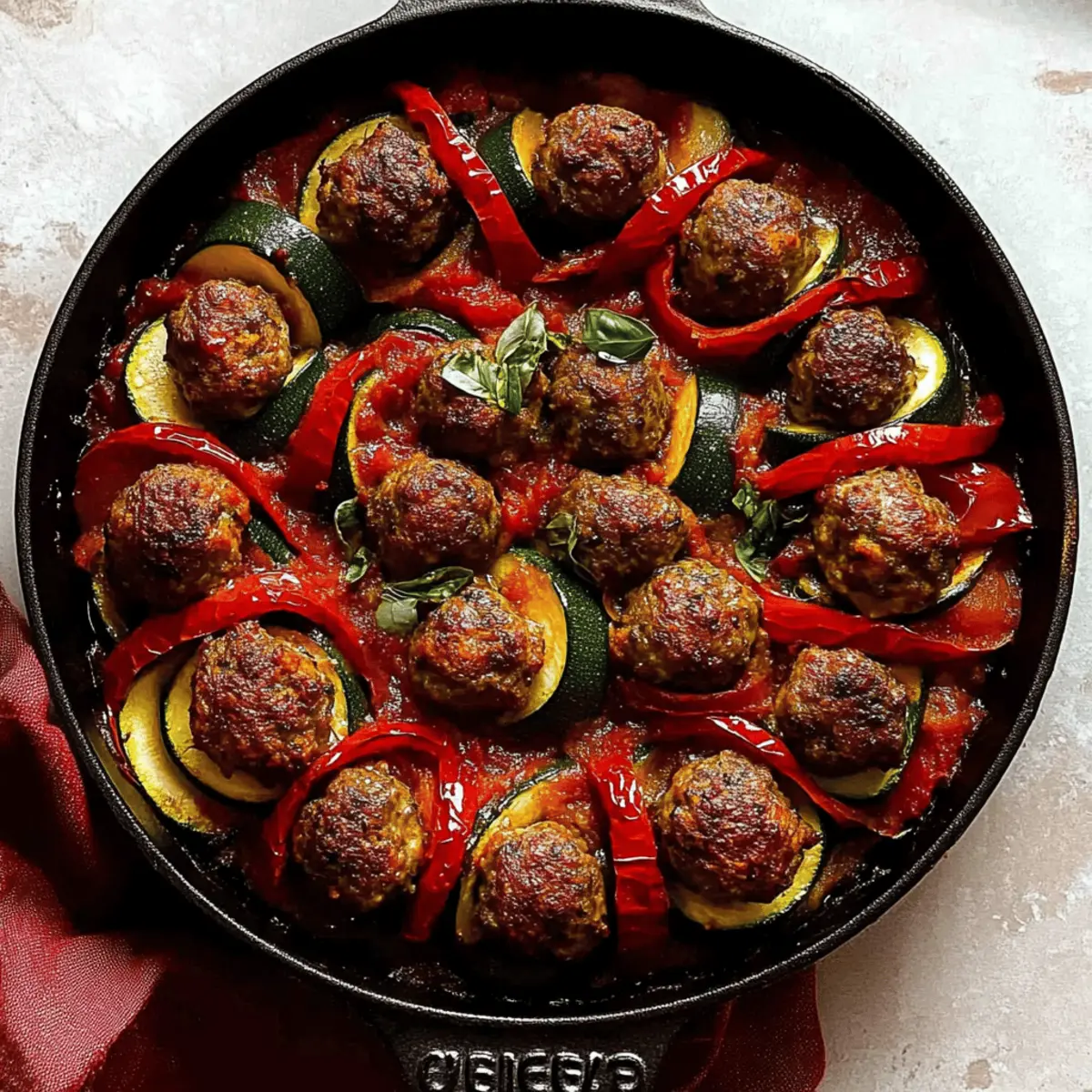 Pour the prepared tomato sauce evenly over the entire arrangement, ensuring the zucchini and meatballs are well-coated. Drizzle a little extra olive oil on top to promote browning and flavor infusion. The vibrant colors of the dish should be inviting and give a taste of the flavors to come.