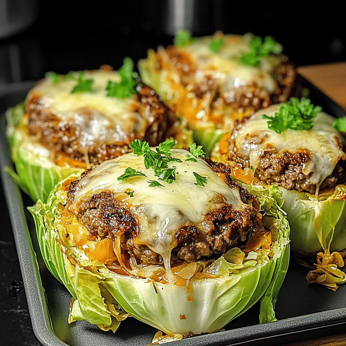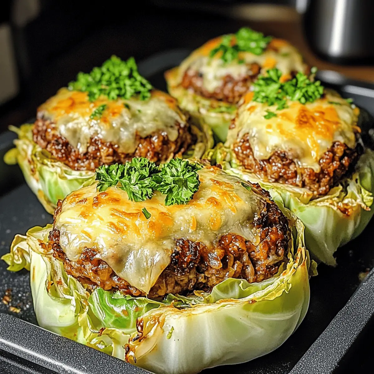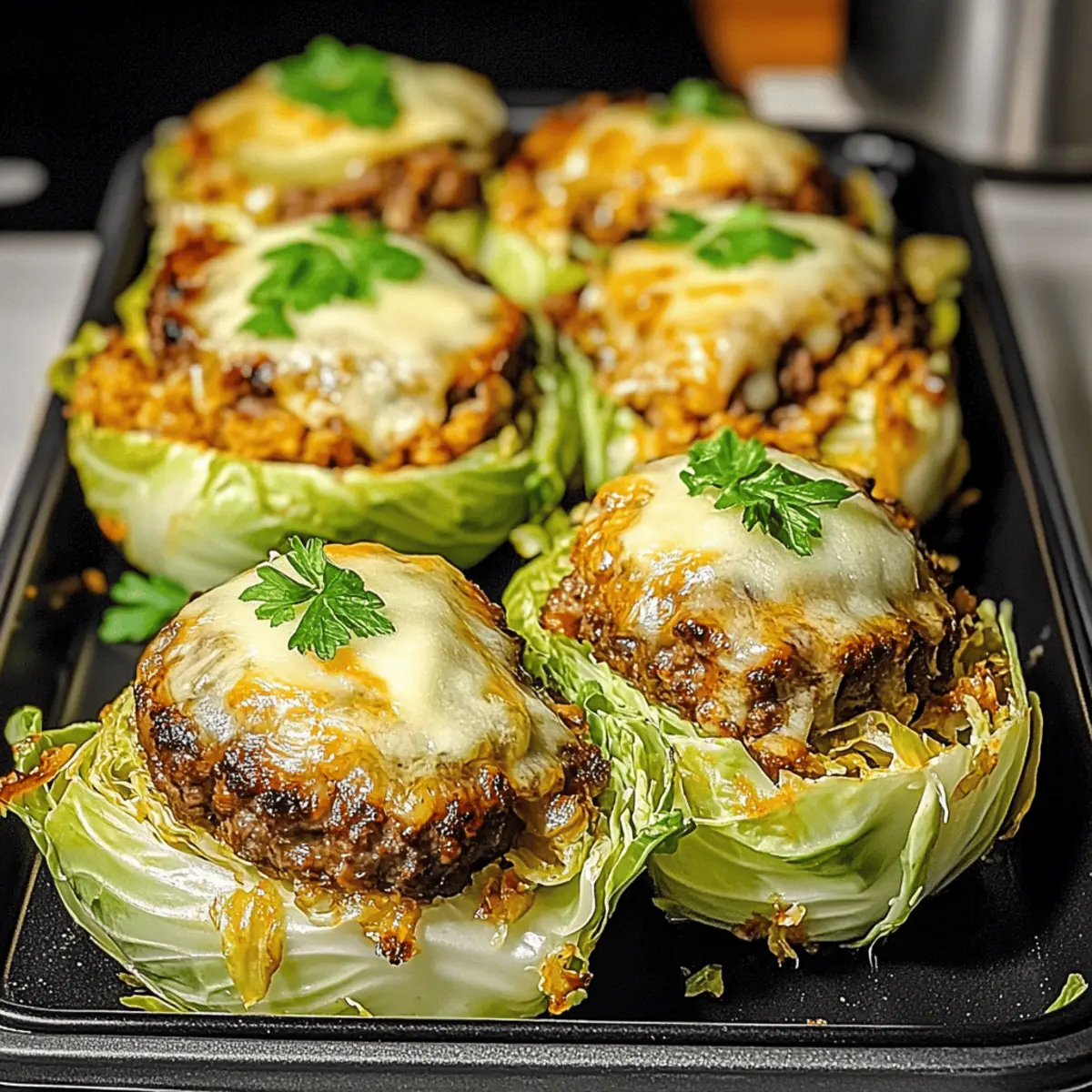 Jump to Recipe Print RecipeThere’s nothing quite like the simple, satisfying crunch of a fresh cabbage leaf to elevate your meal game! I’ve recently discovered a brilliant way to enjoy all the flavors of a classic burger while keeping things light and healthy with my Oven-Baked Cabbage Burgers. These delectable creations not only pack a protein punch with seasoned meat nestled between tender cabbage slices, but they also offer a fantastic low-carb alternative that is perfect for anyone looking to shake off the fast-food routine. What’s even better? They come together in a flash, making them an ideal choice for busy weeknights or quick lunches. Curious about how to whip up this nourishing delight that feels indulgent without the guilt? Let’s dive in! Why Oven-Baked Cabbage Burgers Stand Out? Healthier Alternative: Enjoy all the flavors of a traditional burger with a low-carb twist that keeps your diet in check! Quick & Easy: Perfect for busy evenings, these burgers can be ready in under 30 minutes. Customizable: Switch up the protein with turkey, chicken, or even a vegan option to cater to your taste preferences. Flavorful Boost: The blend of seasonings, including smoked paprika and Worcestershire sauce, ensures each bite is packed with taste, making them far from boring. Savory Bite: Experience a satisfying crunch from the cabbage that beautifully contrasts with the juicy meat, elevating your homemade meal. For more delicious burger ideas, try making Crack Burgers Delights or add a hearty touch with Bacon Cabbage Potato for a comforting side! Oven-Baked Cabbage Burgers Ingredients For the Cabbage • Cabbage – Provides structure and serves as a low-carb replacement for buns; you can substitute with large leafy greens like Swiss chard. • Olive Oil – Used to brush the cabbage for added flavor and browning; this also helps crisp up the layers. For the Meat Mixture • Ground Beef or Turkey – The main protein source, contributing flavor and satiation; feel free to swap for chicken or a plant-based alternative. • Onion – Adds depth of flavor; finely chop it for even distribution throughout the burgers. • Garlic – Enhances the flavor profile immensely; garlic powder works in a pinch if fresh is unavailable. • Salt & Black Pepper – Essential seasonings for taste; adjust based on your preference for seasoning. • Smoked Paprika – Infuses a distinct smoky flavor; you can use regular paprika if it’s what you have on hand. • Worcestershire Sauce – Adds umami and moisture to the mix; switch it out with soy sauce if needed. • Egg (optional) – Binds the meat mixture; omitting it can reduce calories, although it helps maintain structure. For the Topping • Shredded Cheese – Sprinkle on top during the last moments of baking for a delicious melty finish; choose your favorite cheese variety! These delightful Oven-Baked Cabbage Burgers are a wonderful way to indulge in classic burger flavors without the carbs. Enjoy crafting your dish! Step‑by‑Step Instructions for Oven-Baked Cabbage Burgers Step 1: Preheat Oven Start by preheating your oven to 375°F (190°C). This temperature is perfect for achieving a golden, crispy texture on your Oven-Baked Cabbage Burgers. Allow the oven to fully heat up while you prepare the cabbage, ensuring even cooking throughout. Step 2: Prepare Cabbage Carefully slice a small head of cabbage into ½ inch thick rounds. Brush both sides of each cabbage slice with olive oil using a pastry brush. Arrange them on a lined baking sheet, ensuring they are evenly spaced. The glossy finish will help them crisp up beautifully as they bake. Step 3: Mix Meat Mixture In a large mixing bowl, combine ground beef or turkey, finely chopped onion, minced garlic, salt, black pepper, smoked paprika, Worcestershire sauce, and the egg if you’re using it. Use your hands or a spatula to mix thoroughly until all ingredients are well incorporated, creating a flavorful mixture for your burgers. Step 4: Shape Burgers Take handfuls of the meat mixture and shape them into patties. Press each patty firmly onto a cabbage slice, ensuring the meat adheres well. Repeat this process until all the cabbage and meat mixture is used, creating a satisfying tower of flavors with your Oven-Baked Cabbage Burgers. Step 5: Bake Place the cabbage burgers in the preheated oven and bake for approximately 25 minutes. Keep an eye on them; the patties should be cooked through and register at least 160°F (71°C) internally, developing a delightful caramelization on the outside as they cook. Step 6: Add Cheese Once baked, remove the cabbage burgers from the oven. Sprinkle shredded cheese generously over each patty. Return them to the oven and switch to broil, cooking for an additional 3-5 minutes, until the cheese is melted and bubbly, forming a gooey, delicious topping. Step 7: Serve Garnish your Oven-Baked Cabbage Burgers with fresh parsley, if desired. Serve warm alongside your favorite dipping sauces like sour cream or mustard for added flavor. These healthier, low-carb delights are sure to become a family favorite, pairing wonderfully with a fresh salad or roasted veggies! Make Ahead Options These Oven-Baked Cabbage Burgers are perfect for busy home cooks looking to save time during the week! You can prepare the meat mixture and shape the patties up to 24 hours in advance. Simply store them tightly covered in the refrigerator to keep everything fresh and flavorful. Additionally, the cabbage slices can be prepped and brushed with olive oil in advance, making the assembly process a breeze. When you’re ready to enjoy your burgers, bake them directly from the fridge, ensuring to check that they reach an internal temperature of 160°F (71°C) before serving. This way, you’ll have delectable, low-carb burgers ready to serve with minimal effort! Expert Tips for Oven-Baked Cabbage Burgers Choose Fresh Cabbage: Opt for vibrant, crisp cabbage heads. Older cabbage can lead to soggy l