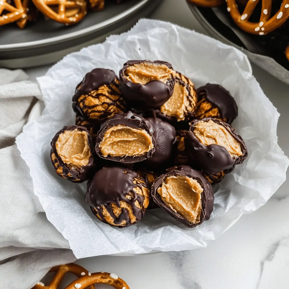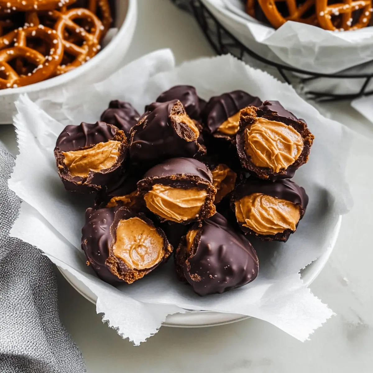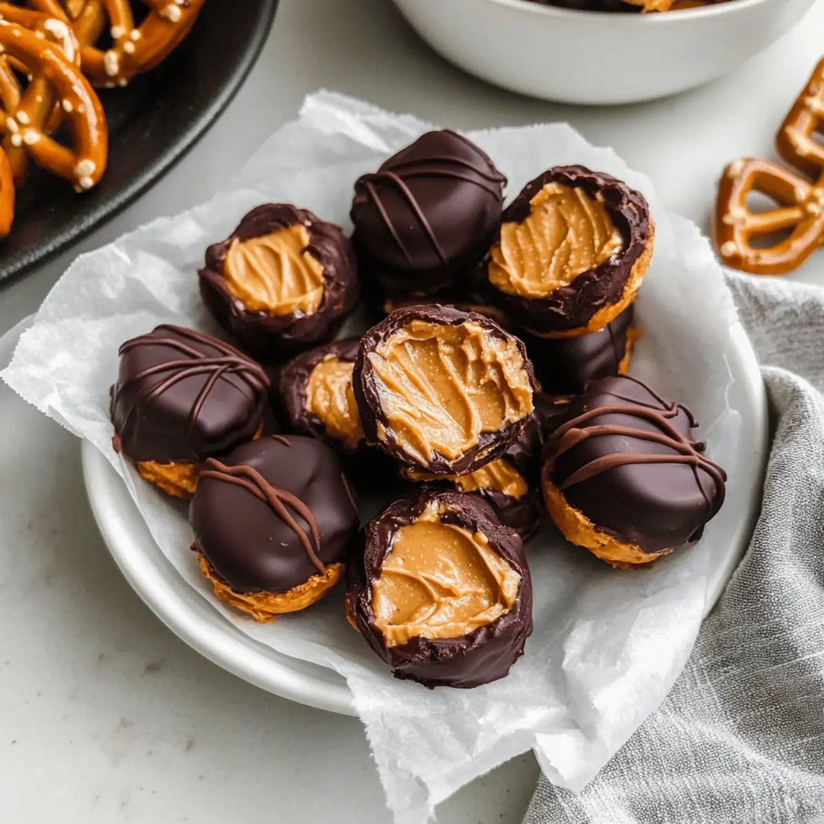 Jump to Recipe Print RecipeAs I walked through the bustling farmer’s market last weekend, the vibrant colors and fresh aromas filled my senses with excitement. One stall caught my eye—samples of sweet and salty treats that called out to me. That’s when I stumbled upon the inspiration for these Healthy Chocolate-Covered Peanut Butter Pretzel Bites. Marrying creamy peanut butter with crunchy pretzels and rich chocolate, this no-bake delight is not only a quick and simple recipe but also a nourishing alternative to traditional sweets. With just five wholesome ingredients, you’ll whip up a snack that’s perfect for satisfying those midday cravings without the guilt. Whether you’re looking to impress at a gathering or simply enjoy a wholesome treat at home, I promise these Peanut Butter Pretzel Bites will be a hit. Curious to find out how easy these are to make? Let’s dive in! Why Choose Peanut Butter Pretzel Bites? Simplicity: This recipe is straightforward with just five ingredients, making it a breeze to whip up even on your busiest days. Nutty Fusion: The creamy peanut butter pairs perfectly with crunchy pretzels, creating a delightful textural contrast that will leave you craving more. Healthier Choice: By swapping out powdered sugar for almond flour and using natural sweeteners, you’re indulging guilt-free! Customizable: You can easily adapt these bites to be gluten-free, vegan, or nut-free, ensuring everyone can enjoy them. Try them with Lime Energy Bites for a refreshing pairing! Crowd Pleaser: These treats are perfect for gatherings or as a simple snack, sure to impress your friends and family alike. No-Bake Fun: With minimal prep and no need for an oven, these bites are a fantastic choice for those warm days when you crave something sweet without the heat! Peanut Butter Pretzel Bites Ingredients For the Peanut Butter Filling • Peanut Butter – Adds a creamy texture and natural sweetness; can be substituted with almond butter for a twist. • Honey – Serves as a natural sweetener and binding agent; swap with maple syrup for a vegan version. • Almond Flour – Provides a nutritious base and helps lower refined carbs compared to traditional flour. For Assembly • Pretzel Twists – Gives a crunchy outer layer; either plain or salted pretzels work beautifully. For the Chocolate Coating • Dark Chocolate Chips – Contributes a rich finish; feel free to use milk or semi-sweet chocolate for different sweetness levels. These Peanut Butter Pretzel Bites are not just delicious—they fall under the healthy snacks category and are a great no-bake option that everyone will love! Step‑by‑Step Instructions for Peanut Butter Pretzel Bites Step 1: Prepare the Baking Sheet Begin by lining a baking sheet with parchment paper, ensuring it covers the entire surface. This will help prevent the peanut butter pretzel bites from sticking once completed. Set the baking sheet aside while you gather the rest of your ingredients, so it’s ready for the delicious treats that are about to come! Step 2: Mix the Peanut Butter Filling In a medium-sized mixing bowl, combine your creamy peanut butter and honey. Use a spatula or a wooden spoon to mix the two together until they are fully blended and smooth. This step should take about 1-2 minutes. Your mixture should have a rich, creamy consistency, perfect for creating the filling of your peanut butter pretzel bites. Step 3: Incorporate Almond Flour Gradually add almond flour to the peanut butter mixture, stirring continuously until well combined. As you mix, pay close attention to the texture; it should resemble cookie dough. If the mixture appears too thick, you can add a little more honey, or if it’s too runny, increase the almond flour. This adjustment ensures the final filling holds together well. Step 4: Assemble the Pretzel Sandwiches Take about 1 teaspoon of the peanut butter filling and scoop it onto one pretzel twist. Top it with another pretzel twist to create a sandwich. Gently press them together, ensuring the filling is evenly distributed. Repeat this process until you have used all the filling, arranging the completed sandwiches on the lined baking sheet for easy access later. Step 5: Melt the Chocolate Place dark chocolate chips in a microwave-safe bowl and heat them in the microwave in 30-second intervals. Stir the chocolate between each interval until it becomes smooth and fully melted, which should take about 1.5 to 2 minutes total. The chocolate layer will envelop your peanut butter pretzel bites, adding a delicious rich flavor. Step 6: Dip the Sandwiches Once melted, carefully dip each pretzel sandwich halfway into the chocolate, ensuring an even coating. Allow any excess chocolate to drip off before placing the sandwiches back on the prepared baking sheet. This step not only adds flavor but creates a beautiful presentation for your peanut butter pretzel bites. Step 7: Chill and Set Finally, place the baking sheet in the refrigerator for about 1 hour, or until the chocolate has completely hardened. This chilling process helps the chocolate set properly, giving your peanut butter pretzel bites a firm and delightful texture. Once fully set, they’re ready for you to enjoy the sweet and salty satisfaction of these treats! Storage Tips for Peanut Butter Pretzel Bites Room Temperature: Store Peanut Butter Pretzel Bites at room temperature for up to 3 days, keeping them in a cool, dry place away from direct sunlight. Fridge: For longer freshness, keep them in an airtight container in the fridge, where they will stay delicious for up to 2 weeks. Freezer: To extend shelf life, freeze Peanut Butter Pretzel Bites for up to 3 months. Place them in a single layer in a freezer-safe container with parchment paper between layers to prevent sticking. Reheating: For a delightful experience, allow them to thaw in the fridge or at room temperature before enjoying. No need to reheat—these bites are perfect cold! Expert Tips for Pea
