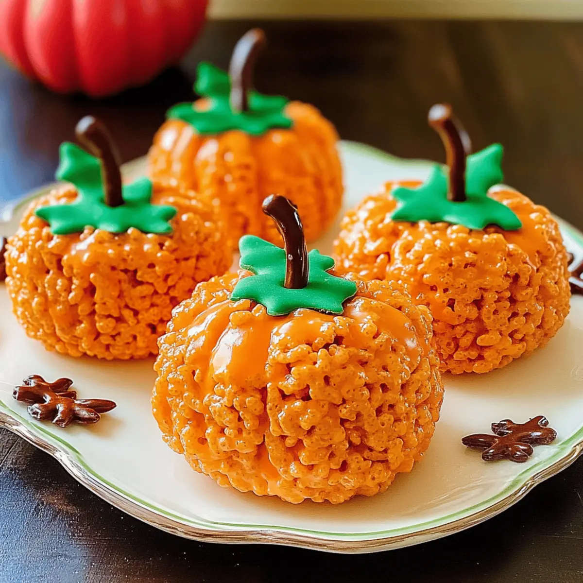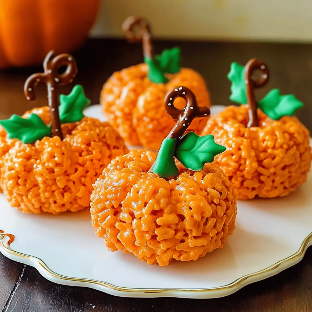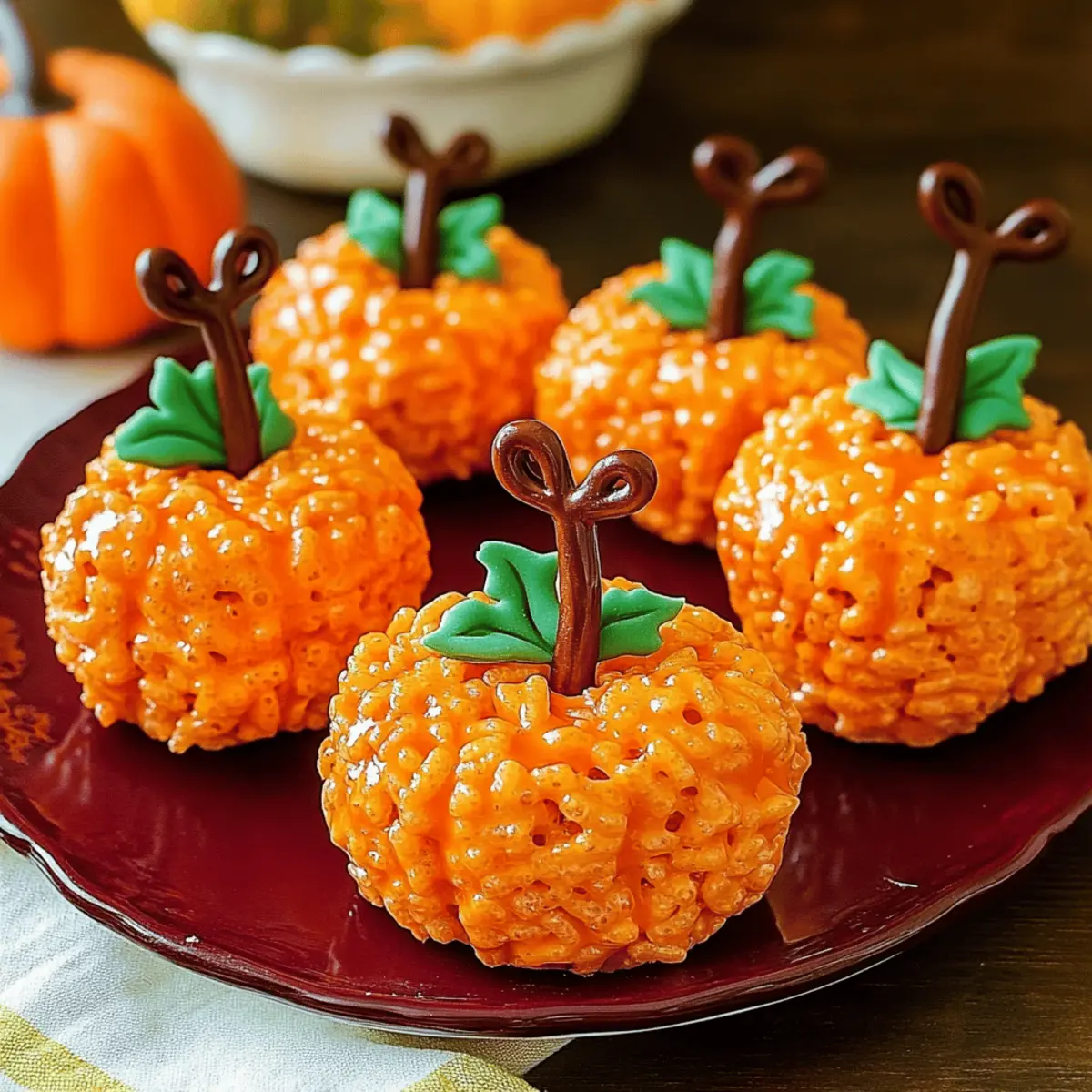 Jump to Recipe Print RecipeAs autumn settles in, the air is filled with the tantalizing scent of pumpkin spice—a perfect backdrop for a festive kitchen adventure. These Pumpkin-Shaped Rice Krispie Treats are the delightful spin we never knew we needed! With their crispy texture and gooey marshmallow goodness, they’ve transformed the classic treat into something perfect for both Halloween spookiness and Thanksgiving warmth. They’re not just kid-approved; they’re a fun project that brings the whole family together. Plus, with quick prep time and minimal mess, it’s a treat you can whip up on a busy weekend. Are you ready to get your hands sticky and create some adorable pumpkin treats with me? Why Pumpkin Rice Krispie Treats? Festive Fun: These Pumpkin Rice Krispie Treats are not just delicious; they bring a seasonal flair to your table, making them perfect for Halloween and Thanksgiving celebrations. Family-Friendly: Kids will love shaping these gooey treats into adorable pumpkins, creating sweet memories in the kitchen. Quick Prep Time: With simple ingredients and minimal cooking, you can have these treats ready in no time—ideal for busy families. Versatile Variations: Whether you want a spiced version or mini treats, this recipe is easy to customize for your gatherings. Crowd-Pleaser: The combination of crispy rice and sweet marshmallows is a nostalgic favorite, sure to delight both young and old alike. Perfect for Sharing: Serve at parties, fall festivals, or simply as a fun family project; they’ll be a highlight wherever they go! Try these alongside my Steak Queso Rice for a delicious meal and dessert combo. Pumpkin Rice Krispie Treats Ingredients For the Treats • Rice Krispies Cereal – Provides the classic crunch and structure of the treat. • Salted Butter – Adds richness and binds the ingredients. • Mini Marshmallows – Sweetens and gives the treat its gooey texture. • Orange Gel Food Coloring – Provides the iconic pumpkin color. For the Decorations • Pretzel Rods – Serve as the pumpkin stem and add a salty crunch. • Mini Green Airheads or Green Fondant – For leaves and vines to enhance the pumpkin appearance. These Pumpkin Rice Krispie Treats are not only visually delightful, but they’re also a fun way to celebrate the fall season! Step‑by‑Step Instructions for Pumpkin-Shaped Rice Krispie Treats Step 1: Prepare Cereal Begin by measuring 6 cups of Rice Krispies cereal and placing them into a large mixing bowl. This is where the magic begins! Ensure the bowl is spacious enough to fold in the marshmallow mixture later without spilling. Set it aside as you prepare the gooey center for your Pumpkin-Shaped Rice Krispie Treats. Step 2: Melt Mixture In a 4-quart non-stick saucepan, melt 3 tablespoons of salted butter over medium-low heat, watching carefully to prevent burning. Once the butter is completely melted, add in 10 ounces of mini marshmallows, stirring frequently until the mixture becomes smooth and fully melted. This should take about 3–5 minutes. Remove from heat when it’s beautiful and gooey. Step 3: Color Mix To infuse your melted marshmallow mixture with a festive touch, add 3-4 drops of orange gel food coloring. Stir in the coloring gradually until you achieve your desired hue of pumpkin orange. This vibrant color will give your treats their signature look, making your Pumpkin-Shaped Rice Krispie Treats even more appealing! Step 4: Combine Carefully remove the saucepan from heat, and immediately fold in the prepared Rice Krispies cereal with a spatula. Use gentle but firm strokes to ensure that every piece is coated in the sweet marshmallow blend. This step is essential for achieving that perfect texture. Continue until the cereal is fully combined, giving you a cohesive, sticky mixture. Step 5: Shape Treats Once the mixture is cool enough to handle, lightly coat your hands with non-stick cooking spray to prevent sticking. Use your hands to grab portions of the mixture and form them into pumpkin-sized balls, about 3 inches in diameter. Gently press a pretzel rod into the top of each ball to serve as the pumpkin stem, creating that adorable pumpkin shape. Step 6: Finish Decor Now it’s time to enhance your treats with decorations! Take mini green Airheads or green fondant, cutting them into leaf shapes. You can also roll some of the leftover Airheads into thin vines. Place these decorative elements on each pumpkin to create a whimsical finishing touch, adding to the autumn charm of your Pumpkin-Shaped Rice Krispie Treats. Step 7: Storage To keep your delightful Pumpkin-Shaped Rice Krispie Treats fresh, store them in an airtight container at room temperature. Make sure they are completely cool before sealing, as this prevents them from becoming soggy. These treats can be made ahead of time for parties and will stay deliciously soft, making them perfect for sharing throughout the fall season. Expert Tips for Pumpkin Rice Krispie Treats Cool It Down: Allow the Rice Krispie mixture to cool slightly before molding to prevent it from being too sticky and difficult to shape. Hands-On Help: Use non-stick cooking spray on your hands for easier shaping. This will keep the mixture from sticking and make forming the pumpkin shapes much cleaner. Vibrant Color: If using natural food colorings, note that the color may not be as vibrant. For the best look, opt for gel food coloring to achieve that perfect pumpkin orange. Keep It Fresh: Store your Pumpkin Rice Krispie Treats in an airtight container at room temperature. This will help maintain their soft texture and prevent them from becoming hard. Make It Mini: For smaller treats that are just as adorable, scale down the size of the balls and use smaller pretzel sticks. They make delightful treats for parties or snacking! What to Serve with Pumpkin Rice Krispie Treats? Indulging in these delightful treats can lead you to wonder what else will complement their sweet, autumnal charm. Warm Apple Ci