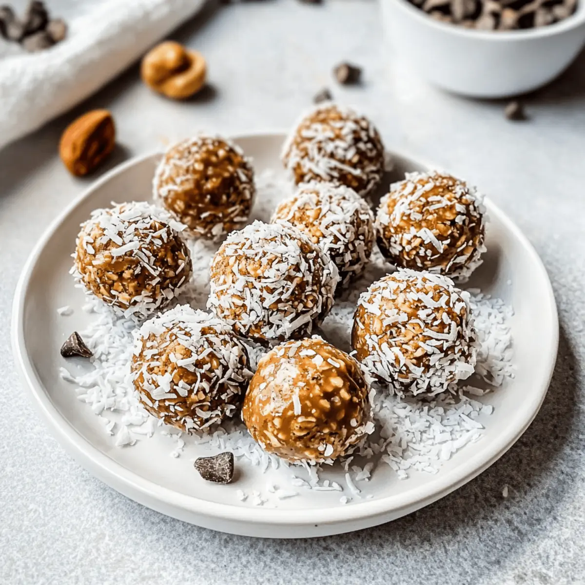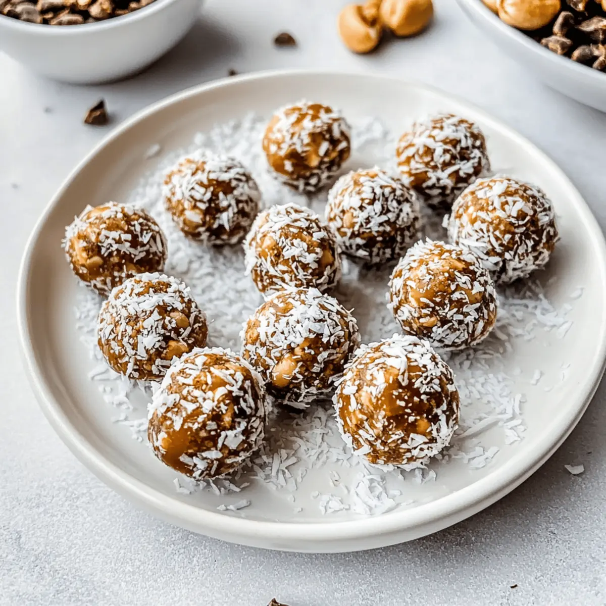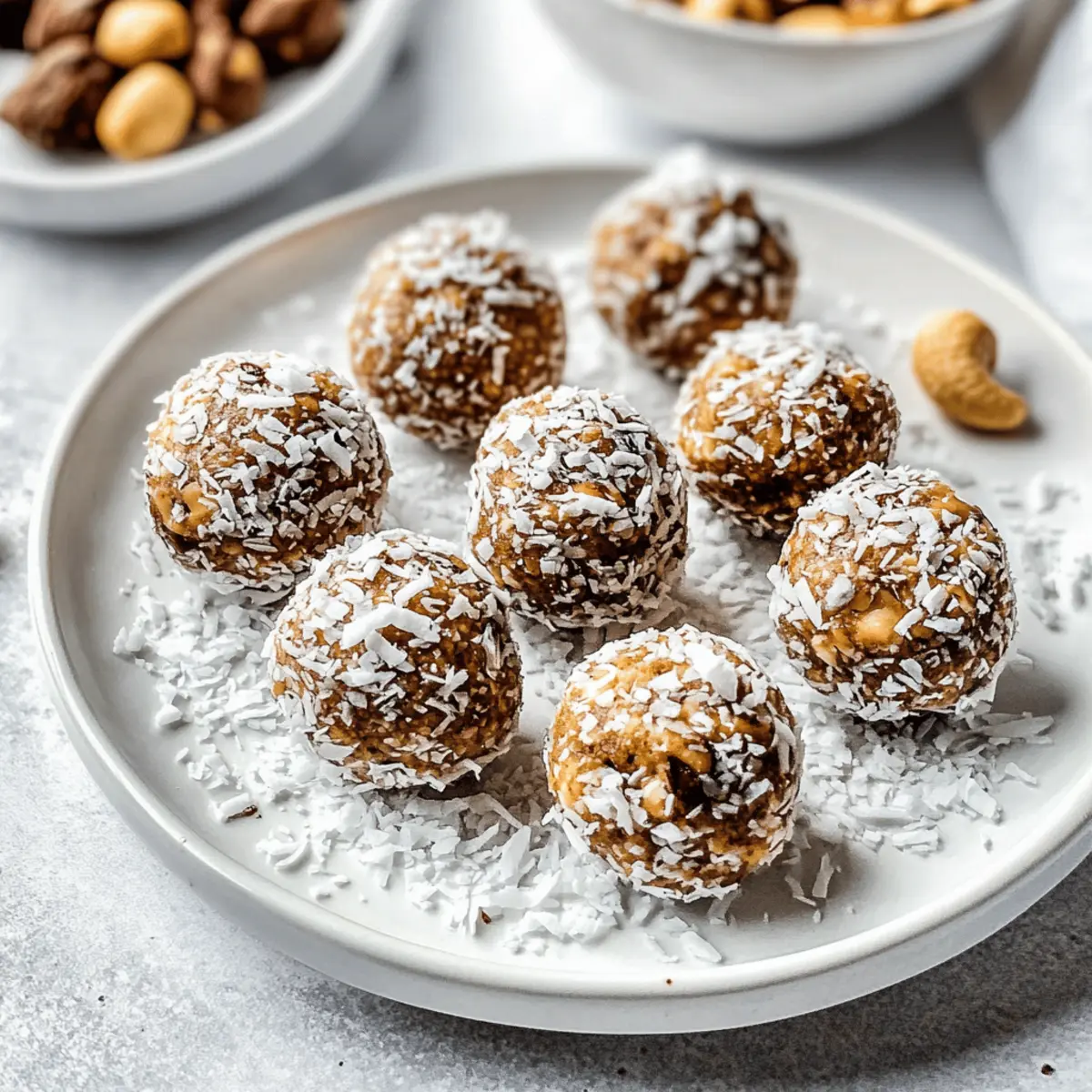 Jump to Recipe Print RecipeAmidst the hustle of daily life, I found myself yearning for a snack that felt indulgent without the guilt. That’s when I stumbled upon these Salted Caramel Coconut Cashew Energy Bites, and I knew I had struck gold. They’re a no-bake wonder packed with wholesome ingredients that quickly come together to create a chewy yet crunchy treat. Not only are these energy bites gluten-free and vegan, but they also provide a healthy dose of fats and proteins to keep you fueled throughout the day. Perfect for those busy mornings or an afternoon pick-me-up, they have quickly become a staple in my kitchen. Ready to learn how to whip up this easy, nutritious snack that’s bound to satisfy your sweet tooth? Let’s dive in! Why Will You Love These Energy Bites? Easy Preparation: With just a food processor, you can whip these bites up in no time, making them a fabulous addition to your busy routine. Nutritious and Delicious: Packed with wholesome ingredients like Medjool dates and roasted cashews, they satisfy your sweet cravings while keeping you energized, making them a perfect alternative to Coconut Lime Energy bites. Yummy Customization: Feel free to swap ingredients based on your preference or what’s in your pantry. Whether you crave a nutty punch with almonds or a fruitier flavor with cranberries, the options are endless! Guilt-Free Indulgence: These bites are a dream for health-conscious snackers! Vegan, gluten-free, and naturally sweetened, they let you indulge without the guilt of traditional snacks. Crowd-Pleasing: Ideal for sharing at gatherings or to pack in lunchboxes, they’re sure to impress family and friends alike, just like my go-to Churro Bites that always get rave reviews! Salted Caramel Coconut Cashew Energy Bites Ingredients For the Bites Medjool Dates – Natural sweetness; substitute with dried figs or raisins if necessary. Roasted Cashews – Provides healthy fats and a rich flavor; raw cashews can be used as an alternative. Fine Unsweetened Shredded Coconut – Adds texture and a hint of tropical flavor; use sweetened coconut for a different taste profile. Vanilla Extract – Enhances flavor; can be omitted if unavailable. Salt – Balances sweetness; use sea salt for a refined taste. Cacao Nibs – Adds crunch and a chocolatey flavor; mini chocolate chips can be swapped in if preferred. For Rolling Unsweetened Shredded Coconut – Coating for added texture; toasted coconut can be used for an extra flavor boost. Step‑by‑Step Instructions for Salted Caramel Coconut Cashew Energy Bites Step 1: Blend the Base Ingredients In a food processor, combine the Medjool dates, roasted cashews, fine unsweetened shredded coconut, vanilla extract, and salt. Pulse the ingredients together until the mixture reaches a sticky consistency, about 1–2 minutes. Scrape down the sides of the bowl as needed to ensure everything is well incorporated. The texture should be moldable but not overly wet. Step 2: Add Chocolatey Crunch Next, sprinkle in the cacao nibs and pulse the mixture briefly, about 10–15 seconds, just to incorporate the nibs without breaking them down completely. This will add delightful chocolatey flavor and crunch to your Salted Caramel Coconut Cashew Energy Bites. Make sure the mixture is well combined, and the nibs are evenly distributed. Step 3: Shape the Mixture Now, take about a tablespoon of the mixture and roll it into a small ball using your hands, continuing until you’ve formed approximately 14 bites. The mixture should hold together without crumbling. If it feels too dry, you can add a bit of melted coconut oil to help it bind better for shaping. Step 4: Roll in Coconut If desired, roll each energy bite in additional unsweetened shredded coconut for a beautiful, textured coating. This step adds a lovely visual element as well as extra coconut flavor. Place each rolled bite onto a parchment-lined baking sheet as you complete this step, ensuring they are spaced apart. Step 5: Chill to Set Transfer the baking sheet with your Salted Caramel Coconut Cashew Energy Bites to the refrigerator and let them chill for at least 30 minutes. This time allows the bites to firm up, making them easier to handle and enhancing the overall texture. After cooling, they will be ready to enjoy! Step 6: Store for Freshness Once chilled, store your energy bites in an airtight container. They can be kept in the refrigerator for up to one week for optimal freshness. Alternatively, you can freeze them for up to three months, ensuring you have a nutritious snack on hand whenever you need a quick pick-me-up. Make Ahead Options These Salted Caramel Coconut Cashew Energy Bites are perfect for meal prep, saving you time and ensuring you always have a healthy snack at your fingertips! You can prepare the mixture and shape the bites 24 hours in advance, storing them in an airtight container in the refrigerator. To keep them fresh, ensure they’re completely chilled before sealing. If you want to prep even further, you can freeze the formed bites for up to three months. When you’re ready to enjoy, just take them out and let them thaw for a few minutes or enjoy them straight from the freezer—either way, they’ll be just as delicious! What to Serve with Salted Caramel Coconut Cashew Energy Bites Indulge your senses with delightful additions that elevate your healthy snacking experience! Creamy Almond Yogurt: This velvety treat perfectly balances the chewy energy bites with its tartness while adding a boost of protein. Fresh Berry Medley: A colorful plate of strawberries, blueberries, and raspberries adds vibrant freshness, enhancing the natural sweetness of the bites. Perfect for a pop of color and zing! Nutty Granola: Sprinkle some crunchy granola alongside your bites for added texture and that satisfying crunch. The nutty flavors also beautifully complement the cashews. Chilled Herbal Iced Tea: Refresh yourself with a glass of herbal iced tea, which pairs well wi