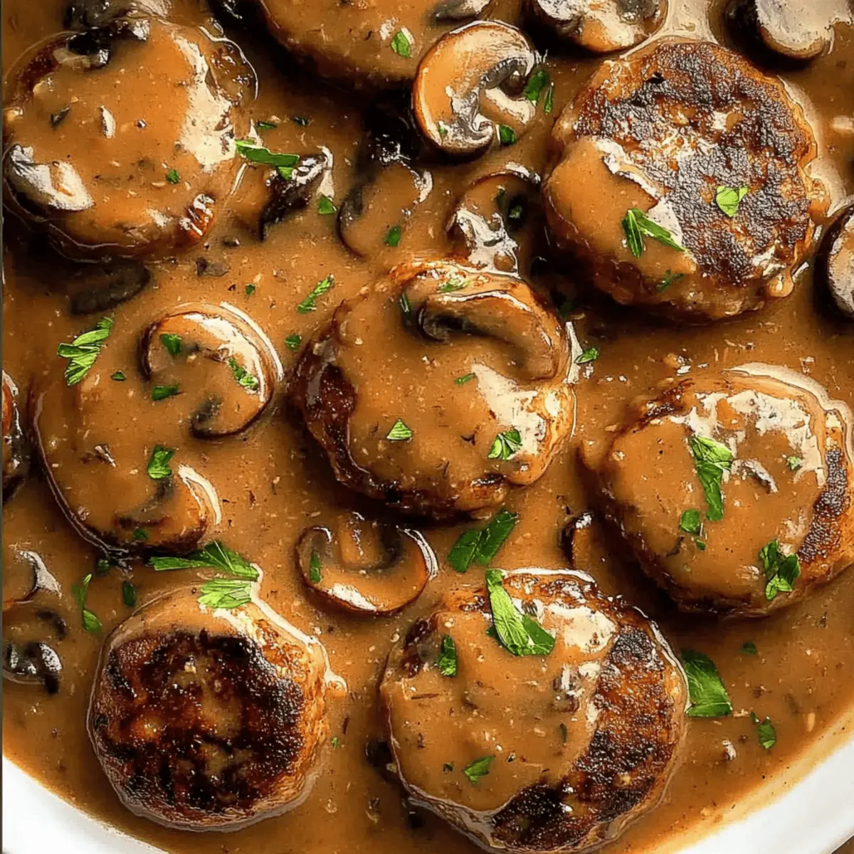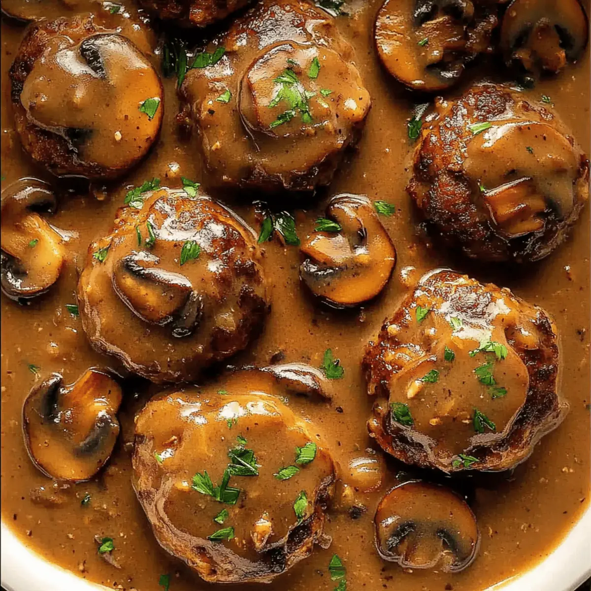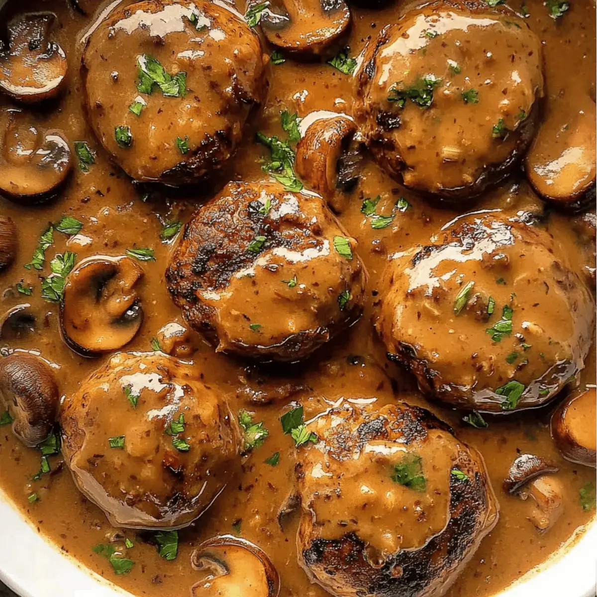 Jump to Recipe Print RecipeThe savory aroma of sautéing mushrooms filled my kitchen, transporting me back to my childhood. Smothered Rissoles in Mushroom Gravy is a dish that captures the heart of Aussie comfort food, melding succulent beef patties with a luxuriously rich gravy. What I love most about this recipe is its simplicity—perfect for a quick weeknight meal without sacrificing flavor. Every bite is a warm hug on a plate, ensuring it’s a dish your family will eagerly anticipate. Plus, it’s freezer-friendly, making it ideal for meal prep or last-minute dinners. Ready to bring a touch of nostalgia into your kitchen? Let’s get cooking! Why are Smothered Rissoles a must-try? Comforting, this dish wraps you in warmth with each savory bite, making it perfect for cozy family dinners. Flavor-packed, the combination of tender beef and creamy mushroom gravy creates an indulgent taste experience. Quick and easy, it requires minimal prep, ideal for busy weeknights or unexpected guests. Versatile, serve it over mashed potatoes or rice for a satisfying meal that pairs with your favorite starch. Freezer-friendly, it’s perfect for meal prep, allowing you to enjoy these delightful rissoles anytime you crave comfort food. Smothered Rissoles Ingredients For the Rissoles • Beef Mince (Ground Beef) – The star of the dish, choose a fatty blend for improved richness or lean beef for a lighter fare. • Onion – Grated to enhance flavor without the crunch of raw chunks. • Panko Breadcrumbs – These light breadcrumbs soften the rissoles, but regular breadcrumbs can work if you’re in a pinch. • Zucchini & Carrot – Grated for extra moisture; they help keep your rissoles tender and nutritious. • Garlic – This aromatic addition brings depth; crush or grate it for best results. • Egg – Acts as a binder, ensuring your patties maintain their shape during cooking. • Dried Thyme & Oregano – These optional herbs elevate the flavor of your rissoles, adding a touch of herbaceous goodness. • Worcestershire Sauce – Just a dash enhances that savory depth; don’t go overboard to avoid overpowering your dish. For the Mushroom Gravy • Unsalted Butter – Used for cooking the gravy, it adds a delightful richness. • Mushrooms – They lend umami to your gravy; button mushrooms are great, but feel free to swap in your favorite variety. • Flour – The thickening agent for your creamy sauce; all-purpose flour does the trick nicely. • Beef Stock – Forms the base of the gravy; opting for low-sodium helps you control the saltiness. • Salt & Black Pepper – Essential seasonings to balance the richness of the gravy and enhance all flavors. Each ingredient plays a vital role in making your Smothered Rissoles truly irresistible, ensuring it becomes a beloved favorite at your dinner table. Step‑by‑Step Instructions for Smothered Rissoles Step 1: Prepare Rissoles In a large mixing bowl, combine grated onion, panko breadcrumbs, beef mince, grated zucchini, grated carrot, crushed garlic, egg, and optional herbs. Season with Worcestershire sauce, salt, and black pepper to taste. Mix everything until well incorporated, ensuring a smooth mixture. This process should take about 3–5 minutes, yielding a cohesive blend that will form the base for your delicious Smothered Rissoles. Step 2: Form Patties Once your mixture is well combined, divide it into 12 equal portions. Gently shape each portion into a patty about 1 inch thick, making a small indent in the center to prevent doming during cooking. Make sure your patties are uniform in size for even cooking, which should take around 10 minutes. Set them aside on a plate while you heat your pan for the next step. Step 3: Cook Patties Heat a large non-stick pan over medium heat and add a drizzle of cooking oil. Once hot, carefully place the rissoles in the pan without overcrowding, searing them for 1.5 minutes on each side until they are golden brown. They will still be raw in the center. Once browned, remove the patties from the pan and set them aside on a plate, allowing them to rest while you prepare the gravy. Step 4: Make Gravy In the same pan, add unsalted butter and allow it to melt over medium heat. Once melted, sauté diced onions and chopped mushrooms until they are tender and the onions are translucent, about 5 minutes. Add crushed garlic and cook for an additional minute, stirring continuously. Then, sprinkle flour over the mixture, stirring for 1 minute to form a roux, which will help thicken your creamy mushroom gravy. Step 5: Simmer Rissoles Gradually pour in half of the beef stock, stirring to ensure there are no lumps. Add the previously cooked rissoles back to the pan, along with the remaining stock, Worcestershire sauce, salt, and black pepper to taste. Bring the mixture to a gentle simmer, covering the pan, and let it cook for about 4-5 minutes until the rissoles are fully cooked through, and the gravy has thickened slightly. Step 6: Serve Once the rissoles are cooked and the gravy has reached a creamy consistency, it’s time to serve. Plate the rissoles generously topped with the mushroom gravy. This comforting dish pairs beautifully with creamy mashed potatoes or rice, enhancing the flavors of your Smothered Rissoles. Enjoy the delightful aroma filling your home as you savor this classic Aussie comfort food! Smothered Rissoles Variations & Substitutions Feel free to get creative and customize your Smothered Rissoles for a personal touch that caters to your taste buds! Turkey Mince: Swap beef for turkey mince for a lighter, leaner option. The flavors will still shine through. Vegetarian Rissoles: Use lentils or chickpeas instead of meat. Season well with spices, and you’ll have a scrumptious meatless meal. Spicy Kick: Add red pepper flakes or a dash of hot sauce to the rissoles for a fiery twist. Heat can truly elevate the comfort of this dish. Optional Greens: Mix in chopped spinach or kale for a pop of color and 