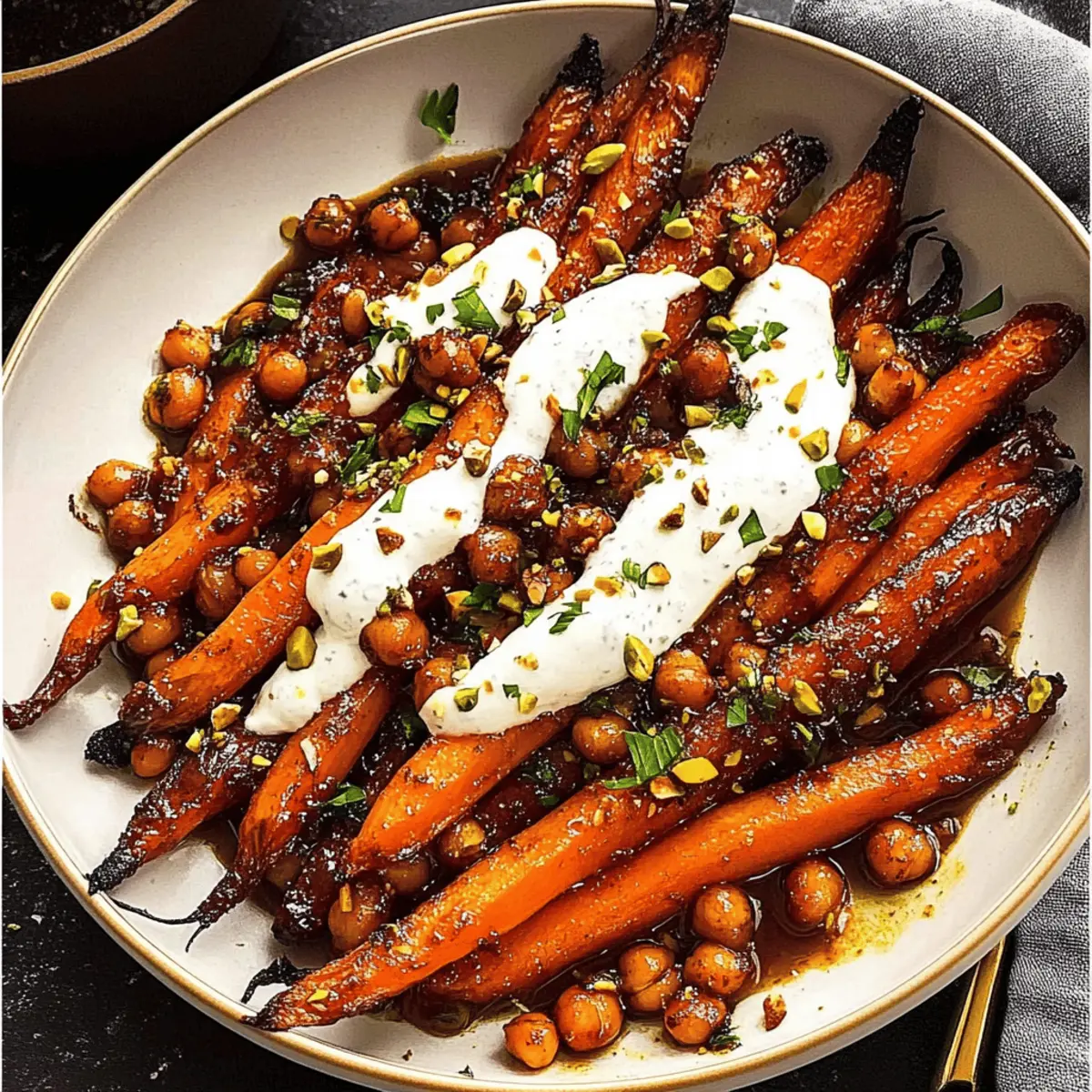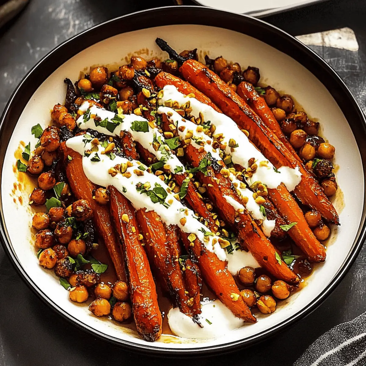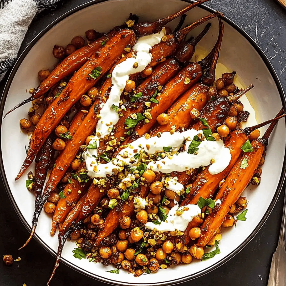 Jump to Recipe Print RecipeAs the enticing aroma of roasted carrots fills my kitchen, I can’t help but feel a tingle of excitement. These Spicy Maple Roast Carrots with Crispy Chickpeas and Garlic Yogurt Sauce have a way of transforming a simple meal into a celebration of flavors! This recipe is not only a vibrant showstopper but also an easy, vegetarian option that effortlessly fits into meal-prep or as a delightful side dish. With just the right amount of sweet maple glaze mingling with a kick of sriracha, every bite is a delightful dance between sweet and spicy! Plus, the crunchy chickpeas offer that satisfying texture, while the creamy yogurt sauce ties everything together beautifully. Ready to elevate your dinner table with this delicious medley? Let’s dive into making this irresistible dish! Why are these carrots a must-try? Bold flavors come alive with the perfect balance of sweet maple syrup and spicy sriracha. Crispy chickpeas elevate the dish with their satisfying crunch, making each bite a delight. Versatile options allow you to switch up ingredients easily, whether it’s using sweet potatoes or adding your favorite spices. Meal prep friendly, this dish can be made ahead and enjoyed throughout the week. Plus, the creamy yogurt sauce brings a cooling element that ties the flavors together beautifully! Spicy Maple Roast Carrots Ingredients For the Carrots • Carrots – Root vegetable that offers natural sweetness and texture. Substitutions: Dutch carrots are preferred for visual appeal; regular carrots can be used, cut into similar sizes. • Maple Syrup – Adds sweetness and aids caramelization of the carrots. Substitution: Honey can be used for a different flavor profile. • Sriracha – Provides spice and acidity to contrast the sweetness of the carrots. Note: Adjust quantity for desired heat level. • Olive Oil – For roasting, enhancing flavor and promoting browning. Substitution: Other cooking oils can be used if desired. For the Chickpeas • Chickpeas – Offer crunchy texture and serve as a starch to make the dish more filling. Note: Can use canned chickpeas; ensure they are drained but not dried. • Spices (smoked paprika, garlic powder, onion powder) – Boost flavor of chickpeas during roasting. For the Yogurt Sauce • Plain Yogurt – Base for the sauce that adds creaminess and tang. Substitution: Greek yogurt or a non-dairy yogurt can be used. • Garlic – Adds aromatic depth to the yogurt sauce. • Lemon Juice – Brightens flavor in the yogurt sauce. For Garnishing • Fresh Herbs (Cilantro or Parsley) – For garnish, adding a fresh touch. Substitution: Either herb can be used based on preference. • Toasted Pistachios – Provide additional crunch and visual appeal as a garnish. Optional: Can omit or substitute with other nuts. With these vibrant ingredients, your Spicy Maple Roast Carrots with Crispy Chickpeas and Yogurt Sauce will surely be a hit, transforming your mealtime into an exciting culinary experience! Step‑by‑Step Instructions for Spicy Maple Roast Carrots with Crispy Chickpeas and Yogurt Sauce Step 1: Preheat the Oven Begin by preheating your oven to 200°C (425°F). Position the oven racks to allow for proper air circulation; one should be in the center for roasting the carrots and the other closer to the bottom for the chickpeas. This setup ensures even roasting for your Spicy Maple Roast Carrots with Crispy Chickpeas. Step 2: Roast the Chickpeas Spread your drained chickpeas on a baking tray lined with parchment paper. Drizzle them with olive oil and generously sprinkle with spices like smoked paprika and garlic powder. Roast the chickpeas in the preheated oven for about 10 minutes, until they begin to turn golden and slightly crisp. Step 3: Prepare the Carrots While the chickpeas roast, prepare your carrots by peeling and cutting them into uniform pieces. In a separate mixing bowl, toss the carrots with maple syrup, sriracha, olive oil, salt, and pepper. Ensure they are well-coated—this will result in beautifully caramelized Spicy Maple Roast Carrots once roasted. Step 4: Season the Chickpeas After 10 minutes, carefully remove the chickpeas from the oven. Season them with a pinch more salt and any additional spices you enjoy. Shake the tray to ensure even coverage, then return them to the oven and roast for another 20-25 minutes, shaking the tray occasionally for optimal crispiness. Step 5: Roast the Carrots Place the prepared carrots on a separate baking tray and roast in the oven alongside the chickpeas for about 30 minutes. Turn them halfway through to promote even cooking. You’ll know they’re done when they’re tender on the inside and beautifully caramelized on the outside, bringing out their natural sweetness. Step 6: Make the Yogurt Sauce While the carrots and chickpeas roast, prepare the yogurt sauce. In a bowl, mix plain yogurt with minced garlic, lemon juice, a drizzle of olive oil, and salt to taste. Stir until well combined, and let it sit while the other elements cook, allowing the flavors to meld together for your Spicy Maple Roast Carrots with Crispy Chickpeas. Step 7: Assemble the Dish Once everything is roasted and ready, it’s time to assemble your masterpiece! Spread the creamy yogurt sauce on a serving platter, then layer the roasted carrots and crispy chickpeas on top. For an extra touch of flavor, you can drizzle more yogurt sauce over the top and garnish with fresh herbs and optional toasted pistachios for added crunch. How to Store and Freeze Spicy Maple Roast Carrots Fridge: Store leftover spicy maple roast carrots and crispy chickpeas separately in airtight containers in the refrigerator for up to 1 day to maintain their texture. Freezer: If you want to freeze the roasted carrots, the best time to do so is before adding the yogurt sauce, as freezing may affect the creamy texture. Store in a freezer-safe container for up to 3 months. Reheating: When ready to enjoy, thaw the carrots and chick