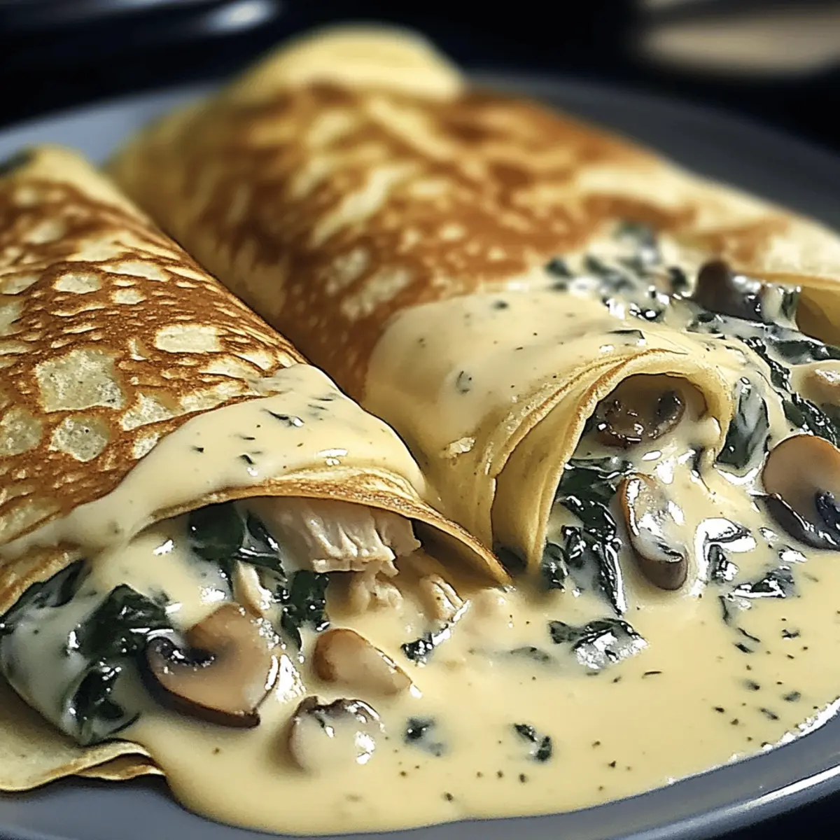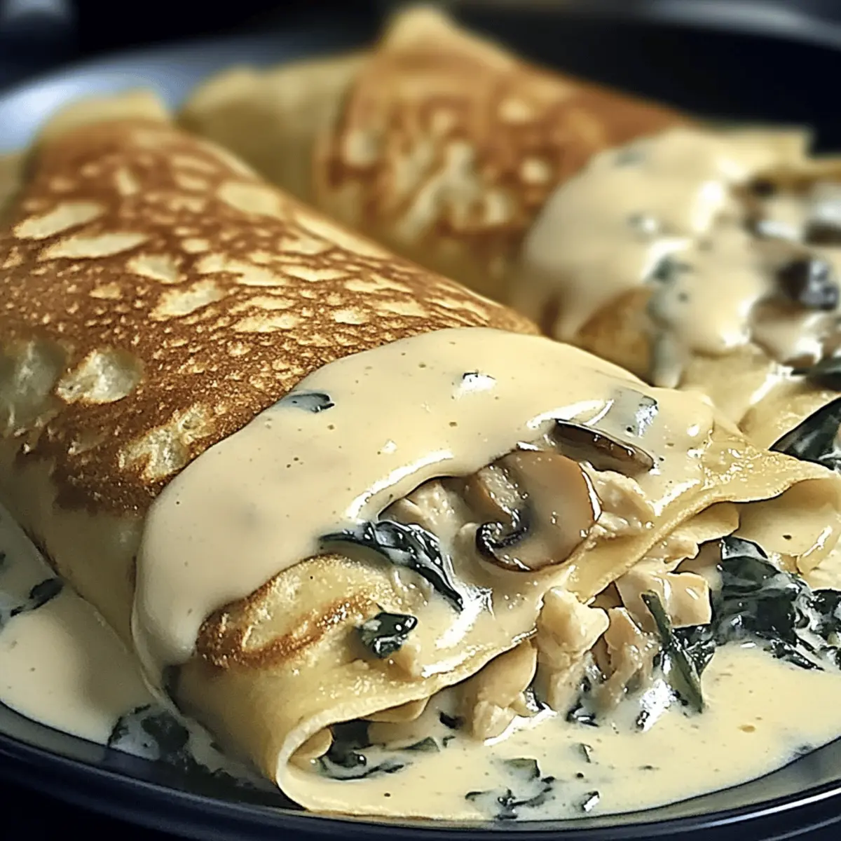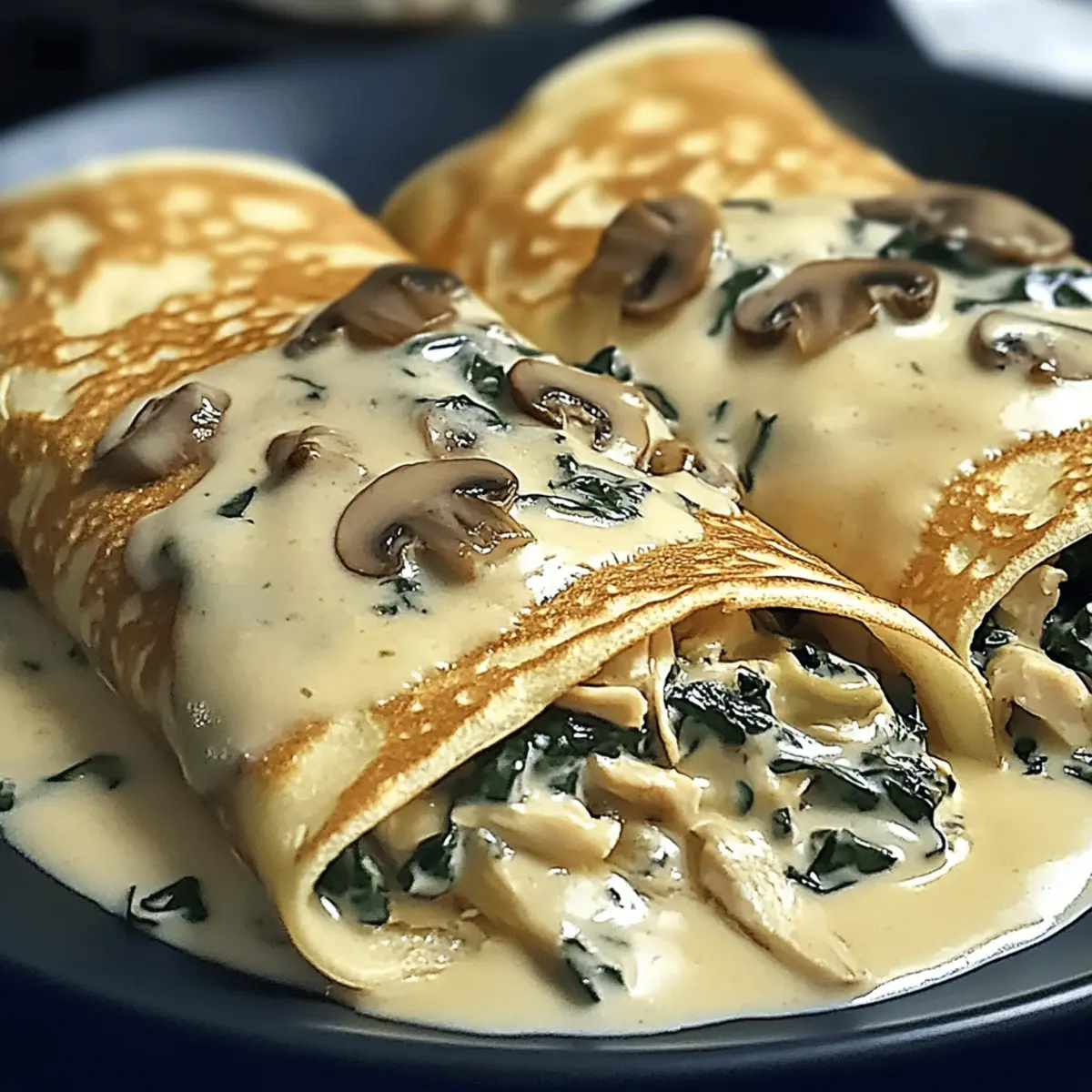 Jump to Recipe Print RecipeAs I savored the last bite of a creamy, dreamy crepe at a quaint Parisian café, I knew I had to recreate that moment at home. Enter my Spinach Mushroom Chicken Crepes with Creamy Béchamel Sauce—a perfect blend of comfort and elegance, ideal for impressing family or treating yourself to a little gourmet indulgence. This recipe not only comes together quickly, making it stress-free for busy weeknights or leisurely brunches, but it’s also adaptable for those with dietary preferences, offering gluten-free and vegetarian options. Who wouldn’t want to whip up a dish that transports you to France and is ready in no time? So, are you ready to roll your way into this delightful culinary adventure? Why Will You Adore This Recipe? Quick and Easy: Within just 30 minutes, you can serve up these elegant Spinach Mushroom Chicken Crepes, making them perfect for both busy weekdays and leisurely weekend brunches. Versatility at Its Best: Whether you’re gluten-free or vegetarian, this recipe adapts seamlessly with alternative ingredients, ensuring everyone can enjoy a taste of gourmet comfort. Heavenly Flavor: The combination of tender chicken, earthy mushrooms, and creamy béchamel sauce creates a rich and satisfying experience that is bound to impress. Perfect for Any Occasion: Serve these crepes for a cozy family dinner, an elegant brunch with friends, or as a make-ahead meal to simplify your busy days. Delightfully Elegant: Each bite transports you to a charming French café, proving that gourmet dining can be achieved right in your own kitchen. Don’t forget to check out other recipes like Garlic Parmesan Chicken or Mango Chicken Stir for more delicious options! Spinach Mushroom Chicken Crepes Ingredients For the Crepes • Gluten-free Flour – Use this for a light, airy texture; regular flour works for non-gluten-free. • Eggs – These bind the batter, ensuring the crepes hold their shape. • Milk – Provides creaminess; try plant-based milk for a dairy-free option. • Salt – Just a pinch enhances the overall taste of your crepes. For the Filling • Shredded Chicken – Adds protein and can be swapped with sautéed spinach for a vegetarian twist. • Mushrooms – Deliver umami flavor and moisture; zucchini or bell peppers can replace them. • Leeks – Add a subtly sweet onion flavor when sautéed. For the Béchamel Sauce • Butter – Use unsalted for better control over seasoning in your sauce. • Flour – Thickens your béchamel; cornstarch is a great gluten-free alternative. • Milk – Gradually added for a silky texture; warm it for best results. • Gruyere Cheese – Melts beautifully for richness; mozzarella or Comte can be used for a lighter flavor. Experience the charm of Spinach Mushroom Chicken Crepes bursting with flavor and warmth! Step‑by‑Step Instructions for Spinach Mushroom Chicken Crepes Step 1: Prepare the Crepe Batter In a medium bowl, whisk together gluten-free flour, eggs, milk, and a pinch of salt until you achieve a smooth, lump-free consistency. Let the batter rest for about 30 minutes, allowing the gluten-free flour to hydrate fully and resulting in more tender crepes. This step is crucial for creating the light texture of your Spinach Mushroom Chicken Crepes. Step 2: Cook Crepes Heat a non-stick skillet over medium heat and lightly grease it with butter. Pour a small amount of batter into the hot skillet, swirling to coat the bottom evenly. Cook for 1-2 minutes or until the edges begin to lift and the underside is golden brown. Carefully flip the crepe with a spatula and cook for another 1-2 minutes. Transfer cooked crepes to a plate and keep them warm while you prepare the filling. Step 3: Make the Filling In a large skillet, melt a tablespoon of butter over medium heat and sauté leeks until soft and fragrant, about 2-3 minutes. Add the sliced mushrooms and cook until golden brown and tender, approximately 5 minutes. Finally, stir in the shredded chicken and heat through for 2-3 minutes. Remove the skillet from heat and prepare to fill your warm crepes with this delicious mixture. Step 4: Prepare Béchamel Sauce In a medium saucepan, melt 3 tablespoons of butter over medium heat. Whisk in the flour and cook for 1-2 minutes to form a roux. Gradually pour in warm milk while whisking constantly to avoid lumps. Continue to cook the mixture, whisking frequently, until it thickens to a creamy consistency, about 5-7 minutes. Season with salt and a touch of nutmeg, if desired, to heighten the flavor of your béchamel sauce. Step 5: Assemble and Bake Preheat your oven to 350°F (175°C). Pour a thin layer of béchamel sauce into a baking dish to prevent sticking. Place a generous spoonful of the filling into the center of each crepe, roll them up, and arrange in the dish seam side down. Pour the remaining béchamel over the filled crepes, then sprinkle with Gruyere cheese. Bake for 20-25 minutes, or until the cheese is melted and golden brown, creating a bubbly, enticing dish of Spinach Mushroom Chicken Crepes. What to Serve with Spinach Mushroom Chicken Crepes Elevate your dining experience by pairing these delicate crepes with delicious sides and drinks that complement their rich flavors. Crispy Green Salad: A refreshing mix of greens and citrus vinaigrette adds a bright contrast to the creamy béchamel sauce. Garlic Roasted Asparagus: The earthy flavors of asparagus roasted with garlic perfectly enhance the savory elements of the crepes. Herbed Quinoa: This nutty, light dish packed with herbs provides a delightful texture and balances the richness of the crepes beautifully. Sautéed Garlic Spinach: Introducing a touch of garlicky greens keeps everything fresh while echoing the dish’s spinach component. Pineapple Ginger Sparkler: This vibrant drink adds a zesty sweetness that cuts through the creamy richness, refreshing your palate perfectly. Chocolate Mousse: Indulge in a light and airy dessert that brings a touch of 