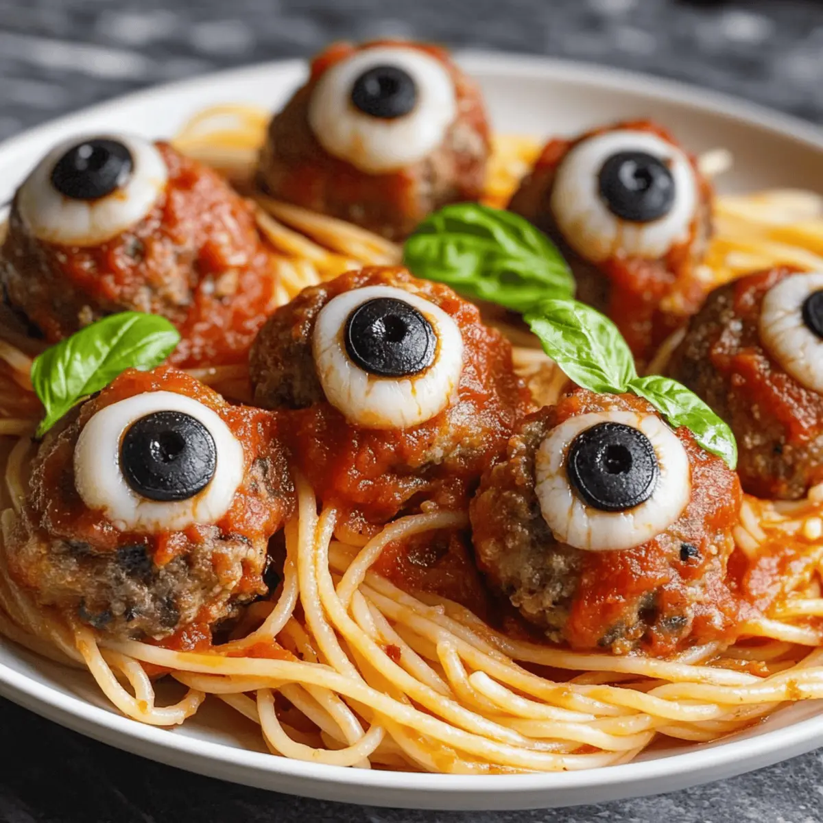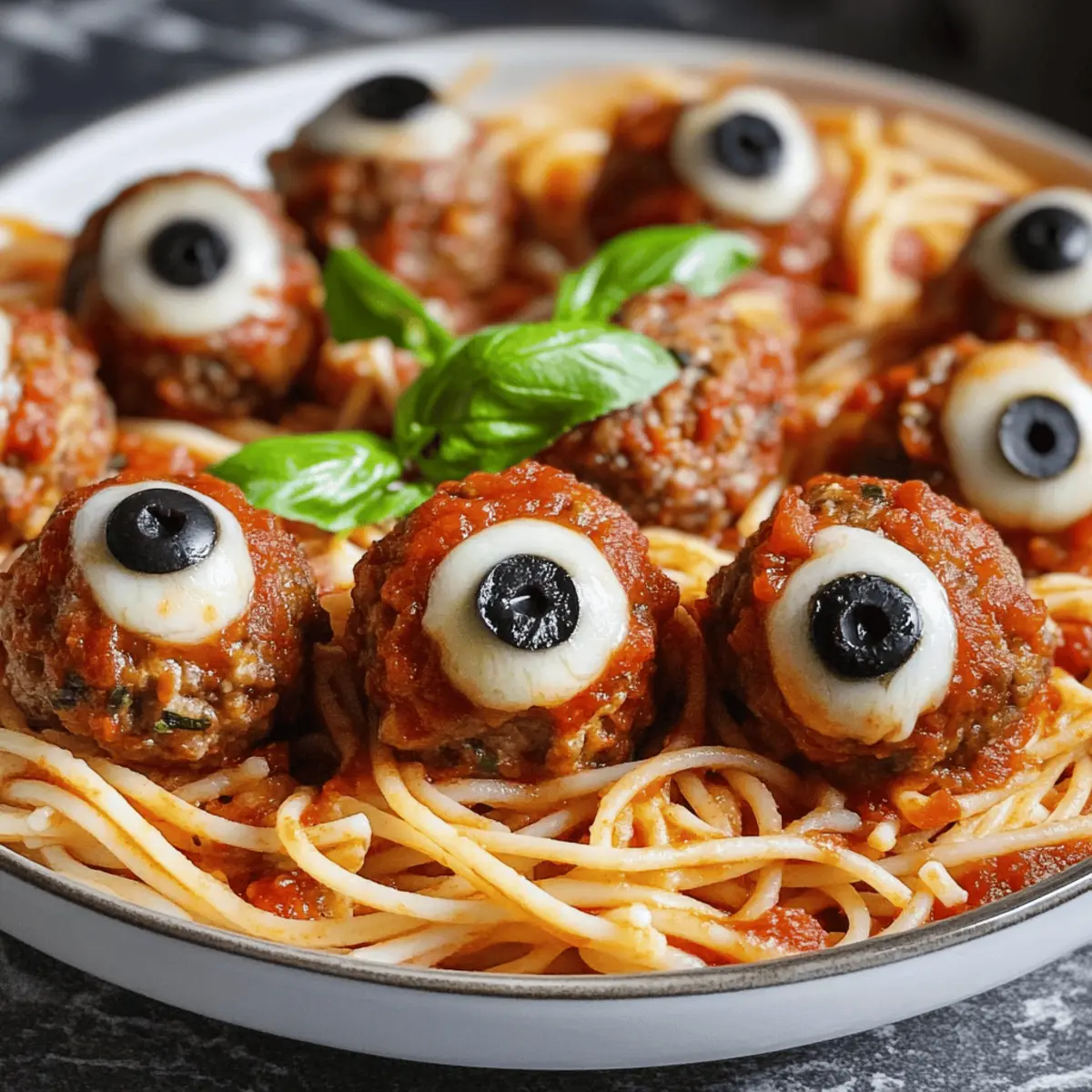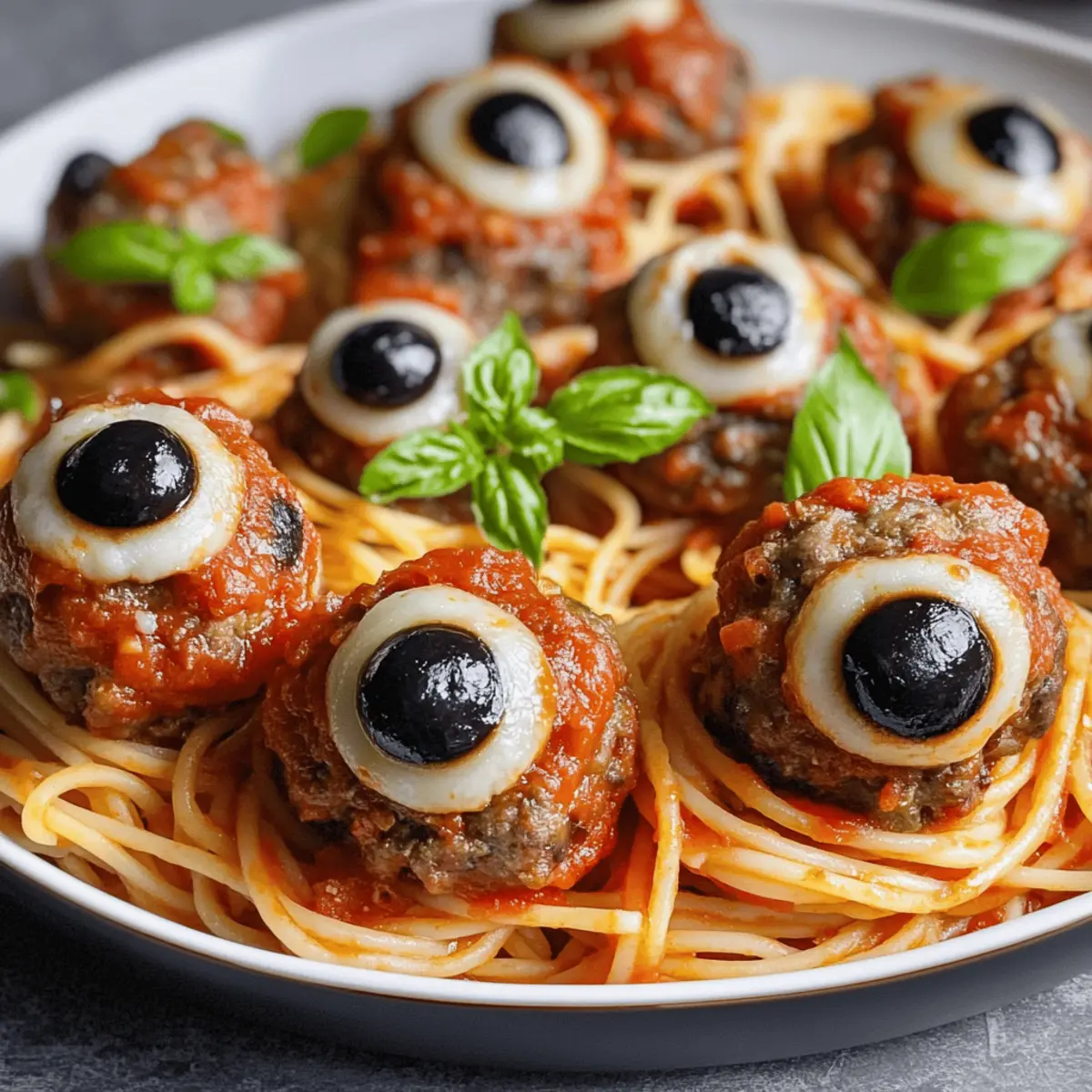 Jump to Recipe Print RecipeAs the leaves turn and the nights grow longer, it’s the perfect time to bring a touch of whimsy to your dinner table. Enter my Spooky Spaghetti and Meatballs with Black Olives—a delightful blend of comfort food and Halloween charm your family will adore. This playful twist on a classic features spooky meatball “eyeballs” topped with gooey cheese and the fun surprise of black olives. Not only is this dish a crowd-pleaser that will keep the kids entertained, but it also boasts a quick prep time so you can enjoy more time with your loved ones. Are you ready to turn your kitchen into a haunted culinary playground? Let’s dive into this festive feast! Why is This Recipe So Fun? Kid-Friendly: The spooky eyeball presentation of the meatballs brings a playful twist that kids will absolutely love—it turns a regular dinner into a festive occasion! Customizable Options: Whether you prefer beef, pork, or turkey, this recipe easily adapts to suit your family’s taste, giving everyone a chance to enjoy it. Quick Prep: With simple ingredients and easy steps, you can whip up this delicious dish in no time, making it perfect for busy weeknights. Comfort Food Classic: Rich marinara, hearty meatballs, and gooey cheese create a warm, comforting meal that delights all ages. Make-Ahead Friendly: Prepare the meatball mixture a day in advance for a flavor boost and save time on the night of your Halloween feast. Pair this with Cabbage Potato Soup or serve alongside Pea Bacon Pasta for a complete meal that everyone will remember! Spooky Spaghetti And Meatballs Ingredients For the Meatballs • Ground Beef – 1 pound, 85% lean; provides flavor and protein, or substitute with all pork or ground turkey for a lighter version. • Ground Pork – 1 pound; adds richness; can replace with all beef or turkey as preferred. • Panko Breadcrumbs – 45 grams; binds meatballs together; use seasoned breadcrumbs but reduce salt if using. • Milk – 4 ounces; moistens the meatball mixture; heavy cream may be used as a substitute. • Kosher Salt – 1 tablespoon; enhances flavor; reduce to 2 teaspoons if using seasoned breadcrumbs. • Italian Seasoning – 1 tablespoon; adds herbal depth; no substitutions needed. • Coarse Ground Black Pepper – 1 teaspoon; adds spice and warmth. • Large Eggs – 2; binds the ingredients; ensure they are room temperature for best mixing. • Onion – 1 medium, finely minced; adds sweetness and aroma, enhancing overall flavor. • Garlic – 8 cloves, minced; intensifies flavor; can be adjusted based on personal preference. • Parmesan Cheese – 2 ounces, freshly grated; introduces umami; substitute with other cheeses if desired. For the Eyeball Topping • Ciliegine Mozzarella Cheese Balls – 12, halved; represents the eyeball’s whites. • Black Olives – 24 slices; serves as the ‘pupil’ for the meatball eyeballs. For the Pasta and Sauce • Spaghetti – 1 pound; the main carbohydrate base; can substitute with gluten-free pasta. • Marinara Sauce – 28 ounces; the flavorful coating for spaghetti; can use homemade or store-bought. • Fresh Basil – handful, optional; for garnish; adds a touch of freshness. • Parmesan Rind – optional; adds depth to the sauce when simmered. Dive into this Spooky Spaghetti and Meatballs with Black Olives that will not only bring smiles to your dinner table this Halloween but also create unforgettable family memories! Step‑by‑Step Instructions for Spooky Spaghetti And Meatballs With Black Olives Step 1: Preheat and Prep Begin by preheating your oven to 400°F (200°C). While it heats, prepare a large baking sheet by lining it with parchment paper to prevent sticking. This step ensures an easier cleanup later and helps your spooky meatballs bake evenly. The perfect temperature awaits to bring out those delicious flavors! Step 2: Mix the Meatball Mixture In a large mixing bowl, combine the ground beef, ground pork, panko breadcrumbs, milk, kosher salt, Italian seasoning, coarse black pepper, eggs, onion, garlic, and Parmesan cheese. Using your hands, gently mix the ingredients until just combined, avoiding overworking the mixture to keep the meatballs tender. This blend will be the base for your delightful meatball eyeballs! Step 3: Chill the Mixture Once your meatball mixture is well-mixed, cover the bowl with plastic wrap and chill in the refrigerator for about 15 minutes. This chilling process makes the mixture firmer, allowing for easier handling and shaping into spooky meatballs. It’s a small step that leads to a delightful transformation when you form them! Step 4: Form the Meatballs After chilling, take the mixture out and use a medium cookie scoop to portion out 24 equal meatballs, shaping them gently with your hands. Place each meatball on the prepared baking sheet, making sure to give them enough space to cook properly. Your spooky spaghetti and meatballs with black olives are starting to take shape! Step 5: Bake the Meatballs Transfer the baking sheet to the preheated oven and bake the meatballs for about 16 minutes, or until they reach an internal temperature of 160°F (71°C). Use a meat thermometer for accurate readings. As they cook, the meatballs will develop a beautiful golden crust, enhancing both flavor and texture for your fun, festive dinner. Step 6: Add the Eyeball Topping Once the meatballs are fully baked, remove them from the oven and carefully top each one with a halved ciliegine mozzarella ball. Return the baking sheet to the oven for an additional 3-4 minutes until the cheese just melts and turns slightly gooey. This adds the signature “eyeball” look crucial to your Spooky Spaghetti And Meatballs With Black Olives. Step 7: Complete the Eyeballs As soon as the melted mozzarella cools slightly, press a black olive slice into the center of each warm meatball. This final touch transforms your meatballs into creepy eyeballs, ready to thrill and amuse everyone around 
