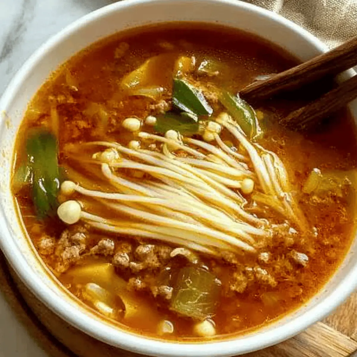 Jump to Recipe Print RecipeAs the first melody of the kettle sings its familiar tune, I find myself transported back to cozy evenings at home, where the warmth of a good soup wraps around me like a favorite blanket. This Tomato Enoki Mushroom Soup with Ground Beef is a delightful take on traditional Chinese comfort food, brimming with umami flavors that are sure to please. You’ll be amazed at how quickly you can whip up this hearty dish, perfect for any night when you’re craving something nourishing yet satisfying. With tender enoki mushrooms and wholesome ground beef swimming in a savory tomato broth, this soup is not only a crowd-pleaser but also a fantastic way to ditch the fast food and embrace homemade goodness. Ready to bring a little warmth into your kitchen? Let’s dive into this comforting bowl of delight! Why is this soup a must-try? Comforting, hearty blend: This Tomato Enoki Mushroom Soup is the ultimate warming dish, perfect for chilly evenings or when you need a cozy meal. Ready in a flash: In just under 30 minutes, you can enjoy a delicious homemade soup that rivals any takeout. Umami-rich flavors: The combination of enoki mushrooms and ground beef creates a depth that will have your taste buds dancing. Versatile for any palate: Customize it easily by swapping in different proteins or using vegetable broth for a vegetarian twist, much like my Cabbage Potato Soup. Crowd-pleaser: Whether for family dinners or cozy gatherings, this soup is sure to impress everyone at the table. Simple ingredients: Made with pantry staples, you’ll find that whipping up this comforting bowl is not only rewarding but also incredibly accessible! Tomato Enoki Mushroom Soup Ingredients For the Soup Base Oil – Essential for cooking and enhancing flavors; consider using vegetable or sesame oil for a unique twist. Ginger – Adds warmth and depth to the broth; fresh ginger is best for optimal flavor creation. Garlic – Provides aromatic undertones; use fresh cloves, smashed to maximize flavor release. Lean Ground Beef – Adds protein and richness; opting for extra-lean helps keep it healthy. Tomato Paste – Key for a deep, rich tomato flavor; can be swapped for a 28-ounce can of diced tomatoes if needed. Low-Sodium Chicken Stock – The backbone of the soup; choose low-sodium to manage salt levels effectively. Sugar – Balances the acidity of the broth, making it taste harmonious. Salt – Enhances the overall flavor; adjust according to taste preferences, especially with chicken bouillon. Ground White Pepper – Adds a mild spice; substitute with black pepper if that’s what’s on hand. White Vinegar – Brightens up the flavors with its acidity. For the Finishing Touch Scallions – Add fresh flavor and texture; use the whites for cooking and the greens for a lovely garnish. Enoki Mushrooms – The star of the dish; select fresh, firm mushrooms for the best texture. With these ingredients, you’re set to craft a soul-soothing Tomato Enoki Mushroom Soup that will encompass the delightful essence of homemade comfort food! Step‑by‑Step Instructions for Tomato Enoki Mushroom Soup Step 1: Heat the Aromatics In a medium pot, heat 2 tablespoons of vegetable or sesame oil over medium heat until it shimmers. Add 1 tablespoon of freshly grated ginger and 2 cloves of smashed garlic, stirring constantly for about 2 minutes until fragrant and golden, releasing their rich aroma into the air. Step 2: Brown the Beef Increase the heat to medium-high, then crumble in 1 pound of lean ground beef. Cook while stirring frequently for about 5 minutes until the meat is browned and sizzles lightly. Ensure it’s evenly cooked and no longer pink, creating a delicious base for your Tomato Enoki Mushroom Soup. Step 3: Incorporate Tomato Paste Stir in 3 tablespoons of tomato paste, cooking for an additional 2 minutes. This step helps to caramelize the paste, deepening its flavor and enriching the overall soup. The mixture should start to stick slightly to the bottom of the pot and turn a vibrant red. Step 4: Build the Broth Pour in 4 cups of low-sodium chicken stock, followed by 1 tablespoon of sugar and 1 teaspoon of salt. Sprinkle in ½ teaspoon of ground white pepper and 1 tablespoon of white vinegar to brighten the flavors. Stir well, allowing the ingredients to combine into a luscious broth that complements the Tomato Enoki Mushroom Soup beautifully. Step 5: Add the Enoki Mushrooms Gently fold in 8 ounces of fresh enoki mushrooms and the whites of 2 scallions, chopped. Bring the mixture to a simmer over medium-low heat and let it cook for at least 15 minutes. The mushrooms should become tender, and the flavors will meld harmoniously, creating a comforting and rich soup. Step 6: Garnish and Serve Once the soup has simmered, remove it from heat. Ladle the Tomato Enoki Mushroom Soup into bowls and garnish with the green tops of the scallions for a fresh crunch. Serve hot and enjoy this hearty bowl of comfort that’s perfect for warming the soul! Tomato Enoki Mushroom Soup Variations Embrace your creativity in the kitchen with these delightful twists on the traditional dish! Vegetarian Swap: For a meatless version, substitute ground beef with tofu or chickpeas for added protein. This variation maintains the soup’s heartiness while keeping it vegetarian-friendly. Mushroom Medley: Replace enoki mushrooms with shiitake or button mushrooms for a different flavor journey. Each type brings its unique texture and taste, enriching your soup experience. Spicy Kick: Add a pinch of red pepper flakes or a dash of sriracha to elevate the heat level. It adds an exciting zing that warms you from the inside out. Creamy Upgrade: Stir in a splash of coconut milk or heavy cream at the end for a luscious, creamy texture. This adds a delightful richness that enhances the soup’s comforting vibe. Citrusy Brightness: A squeeze of fresh lemon or lime juice before serving can wake up the flavors. This bright note creates a love