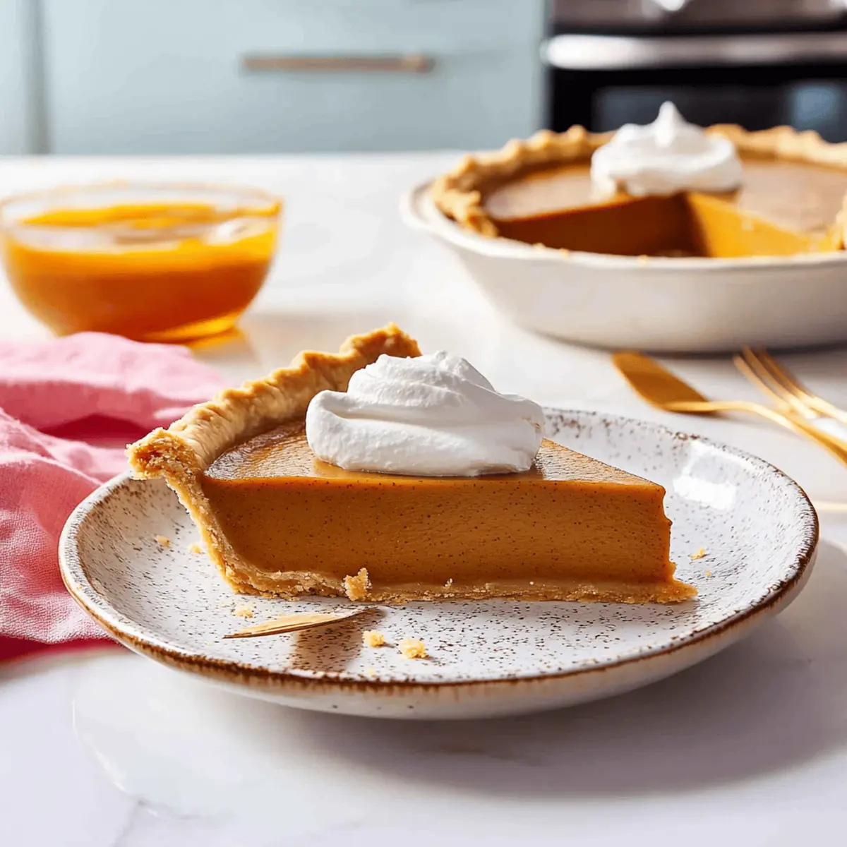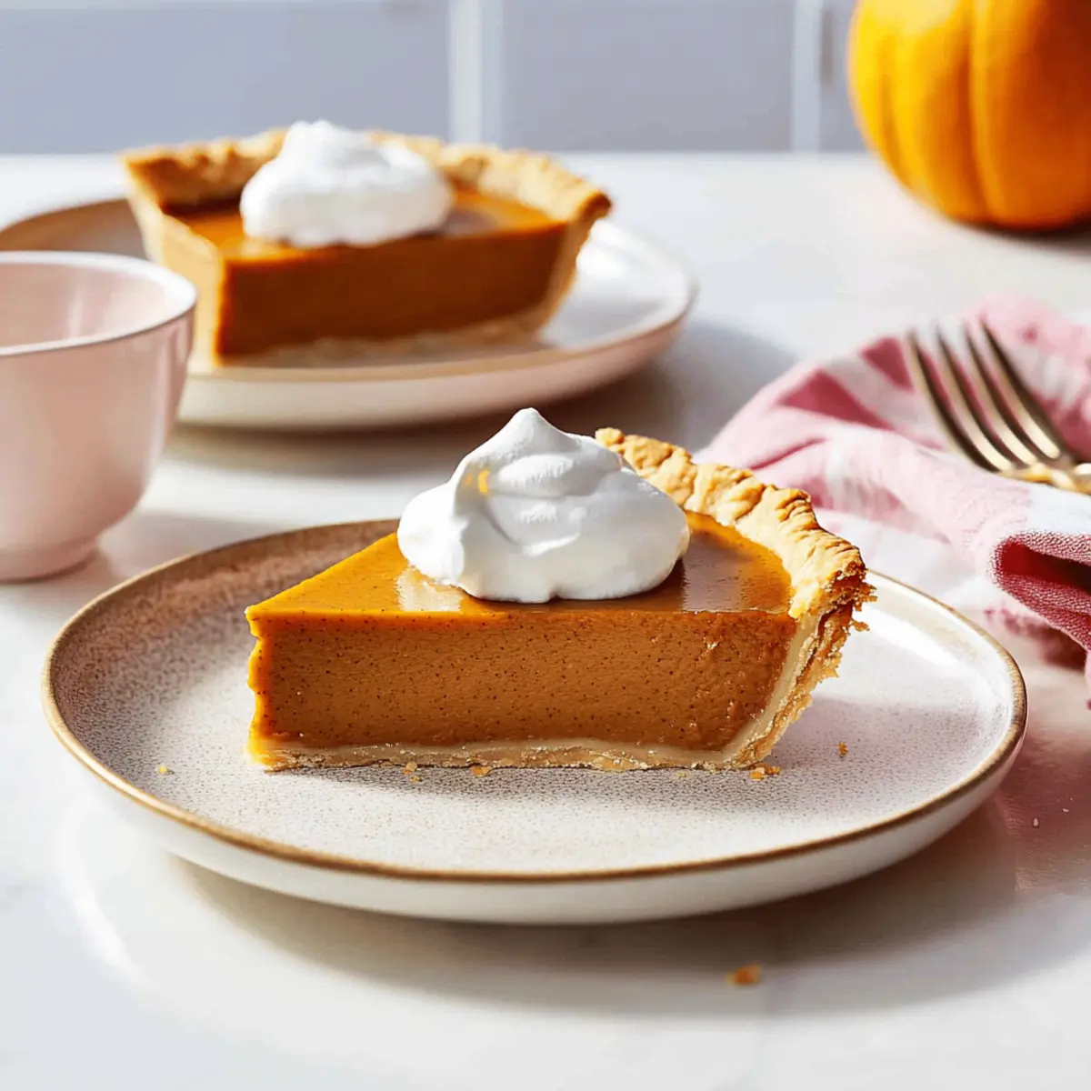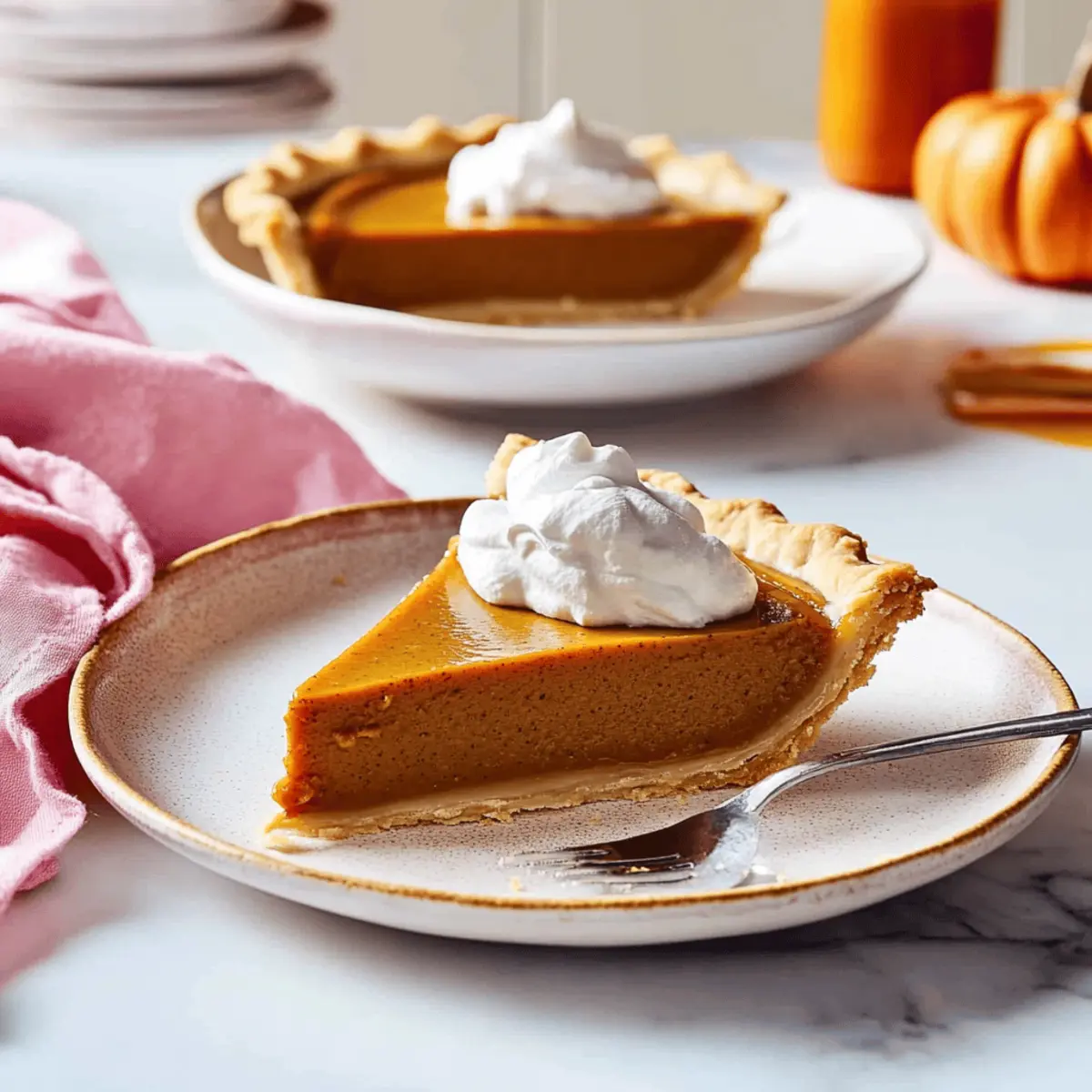 Jump to Recipe Print RecipeEvery Thanksgiving, the sweet aroma of spiced pumpkin fills the air, and it’s like being wrapped in a warm, cozy blanket. This year, I’m thrilled to share my Easy Vegan Pumpkin Pie with Creamy Filling, a delightful dessert that makes everyone feel like they’ve stepped into a slice of fall bliss. Not only is it incredibly simple, requiring just eight ingredients, but it’s also a crowd-pleaser that will impress your guests, whether they follow a vegan diet or not. Plus, this pie can be prepped in advance, allowing the flavors to meld beautifully while your oven works its magic. Ready to elevate your dessert game and keep fast food at bay? Let’s dive into making this luscious vegan treat that’s perfect for any autumn gathering! Why is this Vegan Pumpkin Pie special? Simplicity: This recipe features just eight ingredients, making it perfect for novice bakers and busy home chefs alike. Creamy Texture: The rich filling crafted from coconut cream and pumpkin puree delivers an indulgent experience that satisfies sweet cravings. Versatility: Feel free to substitute ingredients easily! Whether you need a gluten-free crust or alternative fillings like sweet potato, this recipe adapts beautifully. Make-Ahead Magic: Prepare this pie in advance! Letting it chill enhances the flavors, ensuring a mouthwatering dessert ready for gatherings. Crowd-Pleasing: Even non-vegans won’t resist! This delightful pumpkin pie will impress everyone around your Thanksgiving table. Want to complement your meal with more plant-based options? Check out this delicious Vegan Potato Salad for a fresh side. Vegan Pumpkin Pie Ingredients • You only need eight simple ingredients! For the Pie Crust Vegan Pie Crust – Essential for structure and holds the filling; make using a simple vegan dough or opt for a pre-made crust. For the Filling Canned Pumpkin Puree – The star ingredient providing that iconic flavor and color; homemade pumpkin puree can be used if preferred. Coconut Cream – Adds creaminess and richness to the filling; substitute with silken tofu or cashew cream for a nut-free option. Brown Sugar – Brings sweetness and depth; feel free to substitute with coconut sugar for a lower glycemic index. Cornstarch – Thickens the filling and provides stability; arrowroot is a great alternative if needed. Pumpkin Pie Spice – A blend of cinnamon, nutmeg, and ginger that packs in flavor; use individual spices if you’re out of the mix. Vanilla Extract – Enhances the overall flavor of the pie; pure vanilla is preferred, but imitation can suffice. Sea Salt – Balances sweetness and highlights other flavors, ensuring a well-rounded taste. Get your ingredients ready and let’s turn them into a dreamy Vegan Pumpkin Pie that will have everyone asking for seconds! Step‑by‑Step Instructions for Vegan Pumpkin Pie Step 1: Prepare the Vegan Pie Crust Begin by prepping your vegan pie crust. Combine your ingredients to form a dough, then wrap it in plastic wrap and chill in the refrigerator for at least 2 hours. Once chilled, roll out the dough on a floured surface until it’s about 1/8 inch thick. Carefully fit the crust into a 9- or 9.5-inch pie pan, ensuring there are no air bubbles. Chill it again for about 30 minutes to maintain its structure. Step 2: Preheat Oven While the pie crust is chilling, preheat your oven to 350°F (175°C). Position a rack in the lower third of the oven, which will help ensure even baking and browning of the crust while baking the Vegan Pumpkin Pie. This step is crucial for achieving that perfectly cooked pie. Step 3: Blend the Filling In a blender, combine the canned pumpkin puree, coconut cream, brown sugar, cornstarch, pumpkin pie spice, vanilla extract, and sea salt. Blend on high until the mixture is completely smooth and creamy, with no lumps remaining. This creamy filling is the heart of your vegan pumpkin pie, so take your time to achieve that luscious texture. Step 4: Fill Pie Crust Once your crust has chilled and the filling is blended, carefully pour the velvety filling into the prepared pie crust. Use a spatula to smooth the top, ensuring an even layer throughout. This step is essential for achieving that beautiful, creamy pumpkin filling that will make your vegan pumpkin pie truly irresistible. Step 5: Bake Pie Place the pie on a baking sheet to catch any drips, then bake in the preheated oven for 55 to 70 minutes. The pie is done when the crust turns golden brown and the filling is set, jiggling slightly but firm in the center. Keep an eye on it towards the end of baking to prevent overcooking. Step 6: Cool and Chill Once baked, remove the Vegan Pumpkin Pie from the oven and allow it to cool at room temperature for about 30 minutes. Then, refrigerate the pie for at least 4 hours or preferably overnight. Chilling enhances the flavor and helps the filling firm up, ensuring clean slices when you’re ready to serve. Expert Tips for Vegan Pumpkin Pie • Chill the Crust: Ensure your vegan pie crust is well-chilled before baking. This helps prevent shrinkage and maintains its flaky texture. • Smooth Filling: For a perfectly creamy filling, blend thoroughly until no lumps remain. This guarantees a luxurious mouthfeel in your vegan pumpkin pie. • Watch the Bake: Keep an eye on the pie in the last 10 minutes of baking. If the crust browns too quickly, cover it with foil to avoid burning. • Cool Completely: Let the pie cool at room temperature before refrigerating. This step is crucial for setting the filling and achieving clean slices. • Use a Glass Pan: Baking in a glass pie pan helps you monitor the crust color, ensuring it gets beautifully golden without guesswork. • Taste Test: Feel free to adjust sweetness by tasting the filling before baking. Remember, baked flavors intensify, so add sweetness gradually! Make Ahead Options These easy vegan pumpkin pies are perfect for meal prep, allowing you to enjoy a homemade dessert without t