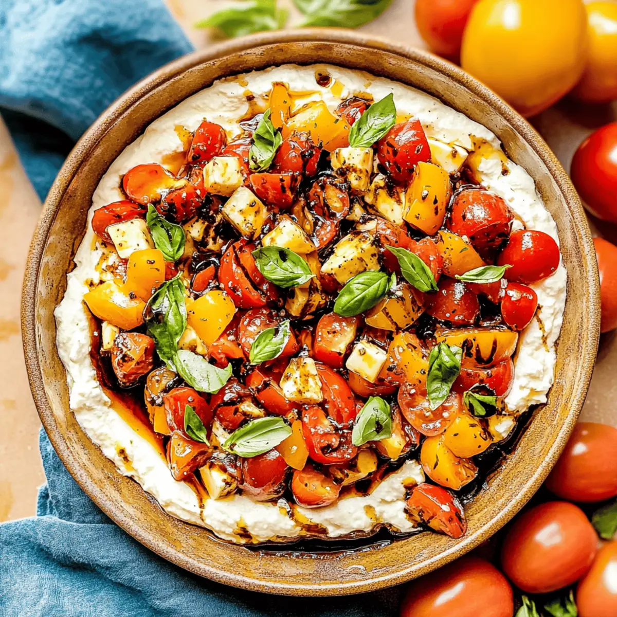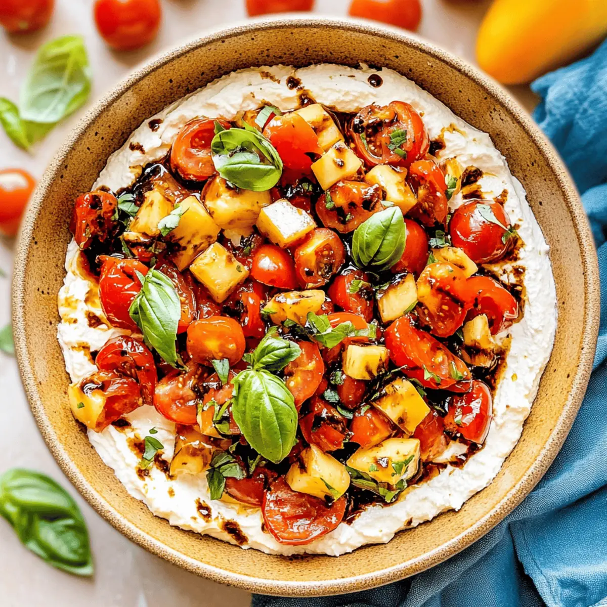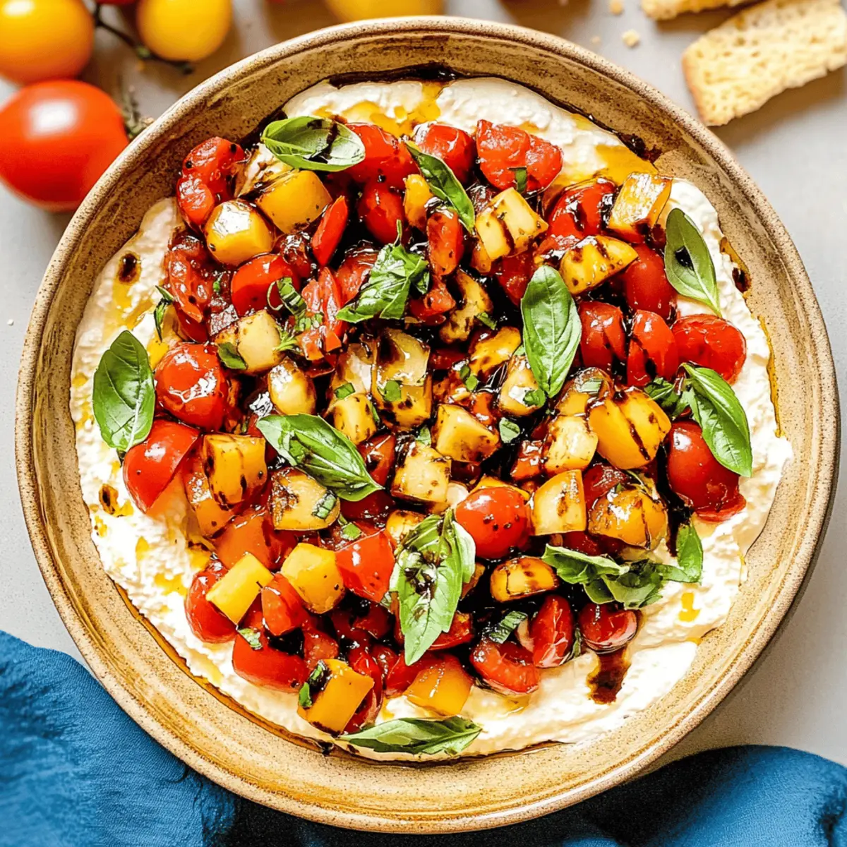 Jump to Recipe Print RecipeThe moment I first tasted whipped feta, it was like unlocking a secret flavor world! This Whipped Feta Bruschetta Dip with Balsamic Glaze captures that same excitement, transforming a simple gathering into a delightful culinary adventure. In just 30 minutes, you’ll have a creamy, savory dip that pairs beautifully with fresh heirloom tomatoes and aromatic basil—a vegetarian and gluten-free marvel that your friends and family will adore. Plus, it’s quick to whip up, making it perfect for those last-minute get-togethers or casual evenings at home. With a dash of balsamic glaze drizzled on top, this appetizer doubles as a feast for the eyes and the palate. What unique twist will you add to make it your own? Why is this dip a crowd-pleaser? Simplicity at its finest: This Whipped Feta Bruschetta Dip requires little prep and is ready in just 30 minutes. Savory and creamy: The whipped feta provides a luxurious base that balances perfectly with the fresh, juicy tomatoes. Versatile delight: You can easily swap in different herbs and toppings to suit your taste or dietary needs. Perfect for gatherings: Whether it’s a casual picnic or a festive game day snack, this dip is sure to impress guests, just like our delicious Spinach Artichoke Dip. Make-ahead option: Prepare the whipped feta in advance for stress-free entertaining, and just assemble before serving. You’ll love how it brings people together around the table! Whipped Feta Bruschetta Dip Ingredients • Gather your essentials for creating the perfect dip! For the Bruschetta Topping Diced heirloom cherry or grape tomatoes – Core flavor that adds a burst of freshness; any ripe tomatoes will work as a substitute. Garlic clove, finely minced – Enhances flavor and aroma; garlic powder can be used in a pinch. Basil leaves, julienned – Provides aromatic freshness; feel free to swap with fresh parsley or omit if needed. Extra virgin olive oil – Adds richness to the mix; regular olive oil can be an alternative. Balsamic vinegar – Balances with acidity; it’s crucial for the whipped feta bruschetta dip flavor. Salt and freshly ground black pepper – Essential seasoning; adjust according to your taste. For the Crostini French baguette – Creates a delightful base for your dip; use gluten-free bread as a substitute if needed. For the Garnish Balsamic glaze for drizzling – Adds a sweet finish; can be store-bought or homemade, or substitute with date syrup. Small basil leaves for serving – Optional garnish for that visual appeal; enhances presentation! Step‑by‑Step Instructions for Whipped Feta Bruschetta Dip Step 1: Prepare the bruschetta topping In a medium bowl, combine the diced heirloom cherry tomatoes, finely minced garlic, and julienned basil. Drizzle in a few tablespoons of extra virgin olive oil and balsamic vinegar, then season with salt and freshly ground black pepper. Toss the mixture gently until all the ingredients are evenly coated. Set this refreshing bruschetta topping aside while you prepare the crostini. Step 2: Make the crostini Preheat your oven to 400ºF (200ºC). Slice the French baguette into even pieces, about half an inch thick, and arrange them on a baking sheet. Brush each side with olive oil, then lightly rub with a garlic clove for extra flavor. Bake for 6-8 minutes, until they are golden and crisp. Keep an eye on them to prevent burning, as the ideal crunch makes for a perfect base for your dip. Step 3: Prepare the whipped feta In a food processor, combine crumbled feta cheese with a generous drizzle of olive oil, and blend until smooth and creamy. You may need to scrape down the sides a couple of times. This whipped feta should have a luxurious texture, so continue blending until it’s perfectly creamy. Transfer this heavenly whipped feta dip to a shallow serving bowl, creating a beautiful layer for your bruschetta topping. Step 4: Assemble the dip Spoon the prepared bruschetta mixture generously over the whipped feta dip, allowing the juicy tomatoes to cascade beautifully. Drizzle a rich balsamic glaze over the top for a sweet and tangy finish, enhancing the layers of flavor. For a garnish, scatter small basil leaves on top to add a pop of color and freshness, making this Whipped Feta Bruschetta Dip visually stunning. Step 5: Serve immediately with crostini Once assembled, serve the Whipped Feta Bruschetta Dip right away alongside your crunchy crostini. Encourage guests to use the crispy bread to scoop up the dip, blending the creamy feta with the fresh bruschetta. For best results, keep the toppings separate until serving to maintain the crostini’s crunch. Enjoy this delightful appetizer warm, inviting everyone to indulge at your next gathering! Make Ahead Options You can easily prepare components of the Whipped Feta Bruschetta Dip ahead of time, making it a fantastic option for busy cooks! The whipped feta dip can be made up to 3 days in advance—simply store it in an airtight container in the fridge to maintain its creamy texture. To keep your bruschetta topping fresh, mix the diced heirloom tomatoes, garlic, basil, olive oil, and balsamic vinegar just before serving; this prevents the tomatoes from becoming too mushy. When you’re ready to enjoy, just assemble the dip by layering the bruschetta mixture over the whipped feta and drizzling with balsamic glaze. With these make-ahead tips, your app party can come together with minimal effort while still delivering the same delicious results! How to Store and Freeze Whipped Feta Bruschetta Dip Fridge: Store the whipped feta dip in an airtight container for up to 3 days. Keep the bruschetta topping separate until serving to maintain freshness. Freezer: While freezing isn’t recommended for the whipped feta dip itself, you can freeze leftover crostini for up to 2 months. Reheat in the oven to restore crispness. Reheating: If you’ve made the dip in advance, enjoy it cold or rewarm gently in the microwave. Just be
