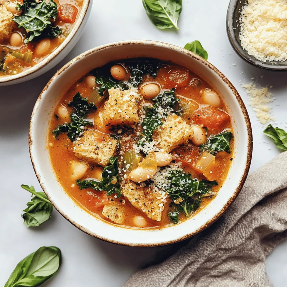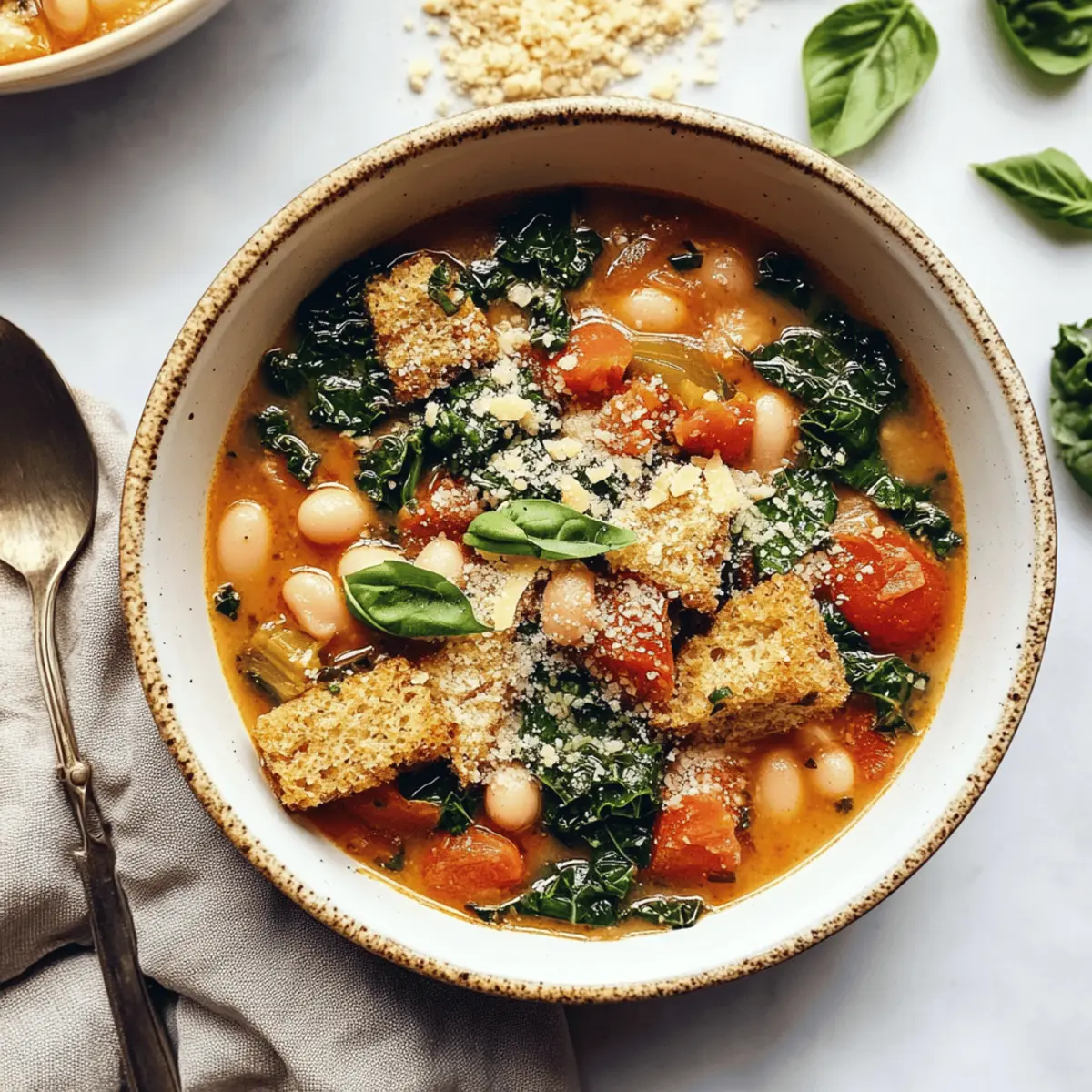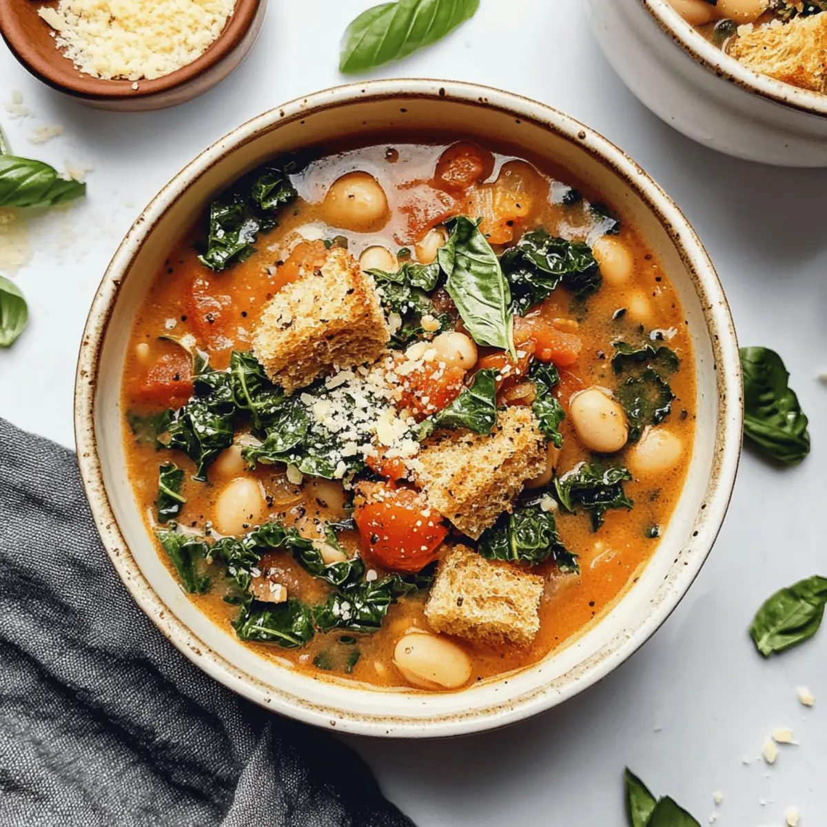 Serve your Creamy Tuscan White Bean & Kale Soup warm, ladled into bowls and garnished with your choice of optional toppings, such as vegan Parmesan cheese, fresh basil, or crunchy croutons. Each spoonful promises to be a cozy, satisfying experience!